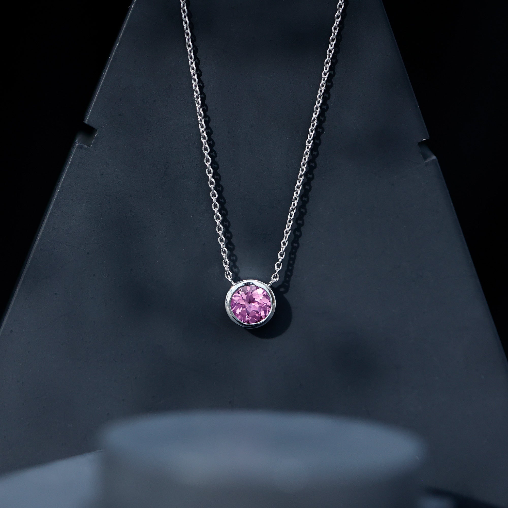 Round Cut Lab Grown Pink Sapphire Solitaire Necklace in Bezel Setting