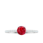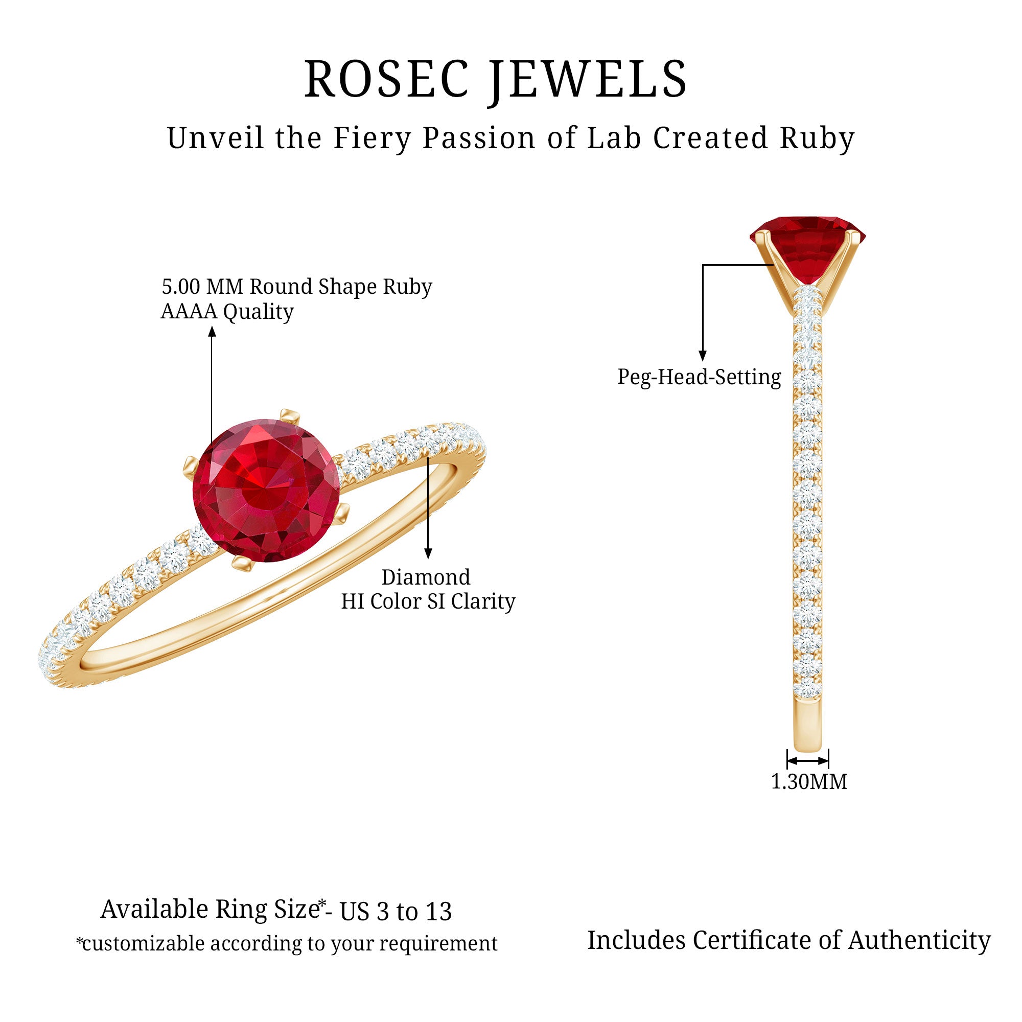Timeless design meets modern love in this elegant Ruby Engagement Ring. This Solitaire Engagement Ring is designed to turn that meaningful YES into a moment you will both never forget. At the heart of the ring shines a 5 MM round cut lab made ruby, set in peg head setting to slightly lift the main stone above the band to let it catch the light beautifully. It draws attention in the most effortless way, making it the true star of the Lab Created Ruby Ring. On either side of the ruby, real round cut diamonds are carefully placed along the band, adding a soft sparkle without taking away from the beauty of the center gem. Every detail is thoughtfully crafted to balance elegance with emotion. The band offers a smooth and comfortable fit, perfect for wearing every day as a reminder of your promise and future together. This Ruby and Diamond Engagement Ring is not just a piece of jewelry, it is a symbol of your journey, your commitment, and your unique bond. Packaged in a beautiful box and ready to gift, this Ruby Solitaire Ring brings together classic design, lasting beauty, and heartfelt meaning, all in one timeless piece.