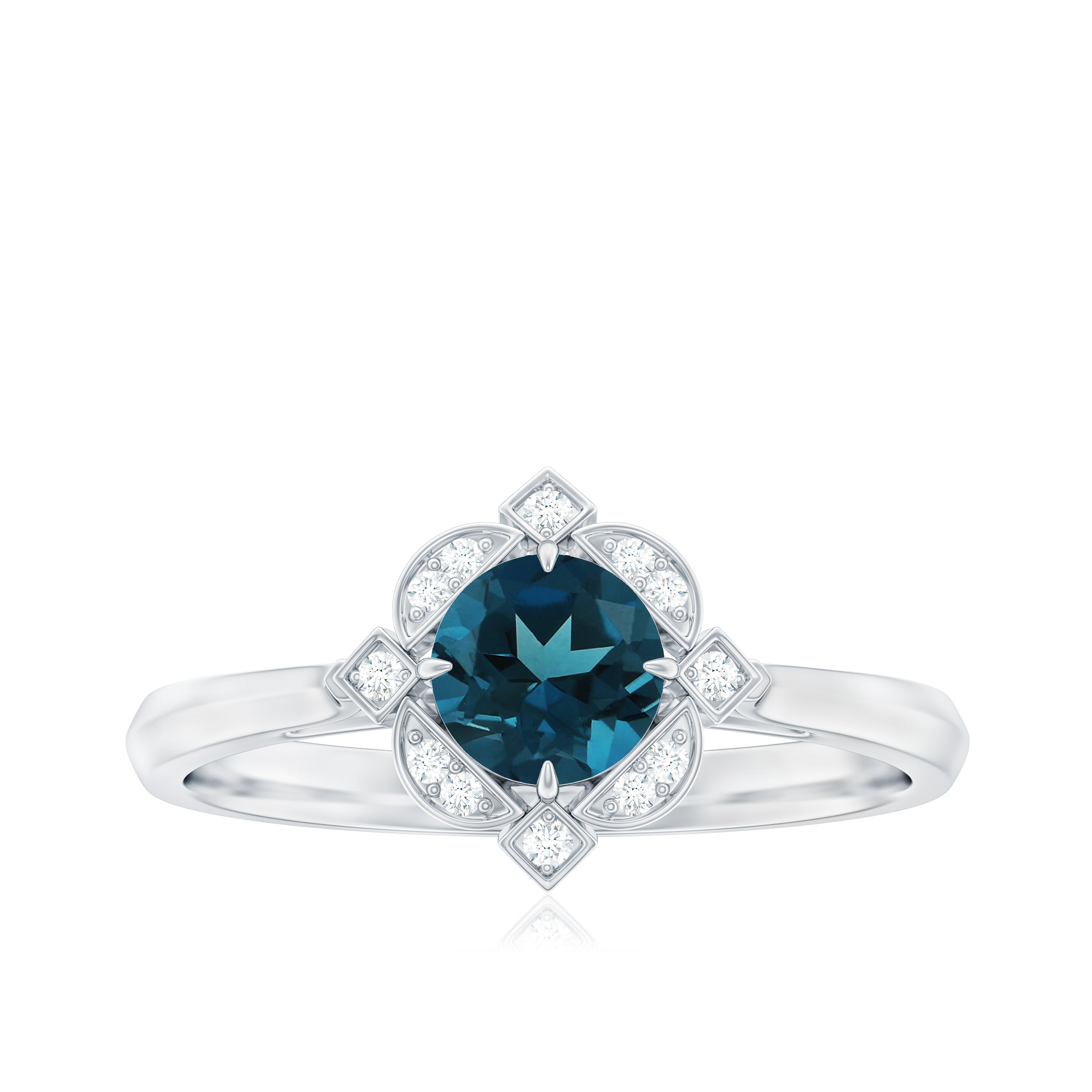 If she appreciates the charm of old school aesthetics and significant details, this Vintage Blue Topaz Ring is the ideal choice. It harmoniously combines classic elegance with timeless romance in an enchanting manner. At its core lies a 5 MM round shape london blue topaz, securely set in a claw setting. Encircling the onyx is a floral halo of genuine diamonds, imparting the London Blue Topaz Engagement Ring with a delicate and antique essence - reminiscent of treasures found in a cherished heirloom box. The halo design not only enhances the sparkle but also softens the striking center stone, resulting in a balanced and exquisite appearance that feels both distinctive and graceful. Constructed with AAA quality london blue topaz and HI-SI quality diamonds, this Floral Engagement Ring is designed for durability and intended to be cherished for many years. It is an excellent choice for proposals, anniversaries, or even as a considerate gift. The floral silhouette, vintage embellishments, and rich contrast of the stones render this Natural Blue Topaz and Diamond Ring a remarkable addition to any jewelry collection.