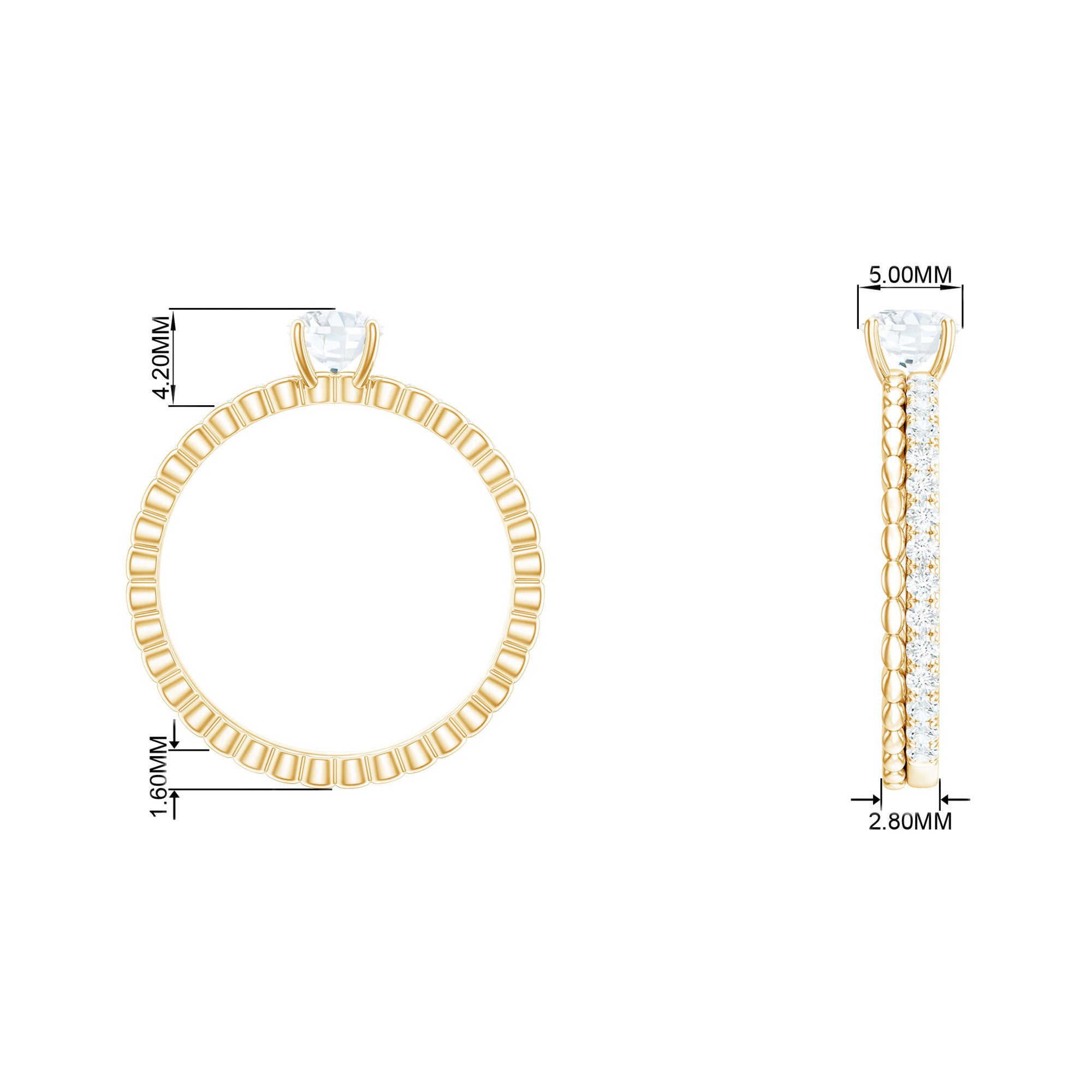 Celebrate your love with modern elegance and lasting sparkle through this Moissanite Engagement Ring, a perfect blend of bold design and meaningful detail. At the center shines a 5 MM Round Shaped Moissanite, known for its brilliance and clarity, set in a secure prong setting that allows the light to dance with every movement. The highlight of this Designer Engagement Ring is its wide double band design, a stylish union of two distinct bands, one left sleek and polished for a minimalist touch, while the other glimmers with round cut side stones, adding extra radiance to the overall look. This Half Carat Moissanite Ring is more than just a piece of jewelry, it is a symbol of strength, unity, and a love that is both grounded and glowing. The structure is modern and eye-catching, yet its simplicity keeps it timeless. Whether chosen as a pre-engagement ring, a promise ring, or the start of something forever, it beautifully captures the moment and everything it stands for. The comfortable fit makes it ideal for everyday wear, while the elegant presentation box adds a special touch from the very beginning. Designed to be both stunning and meaningful, this Round Engagement Ring transforms your love story into something you can wear, bold, bright, and unforgettably yours.