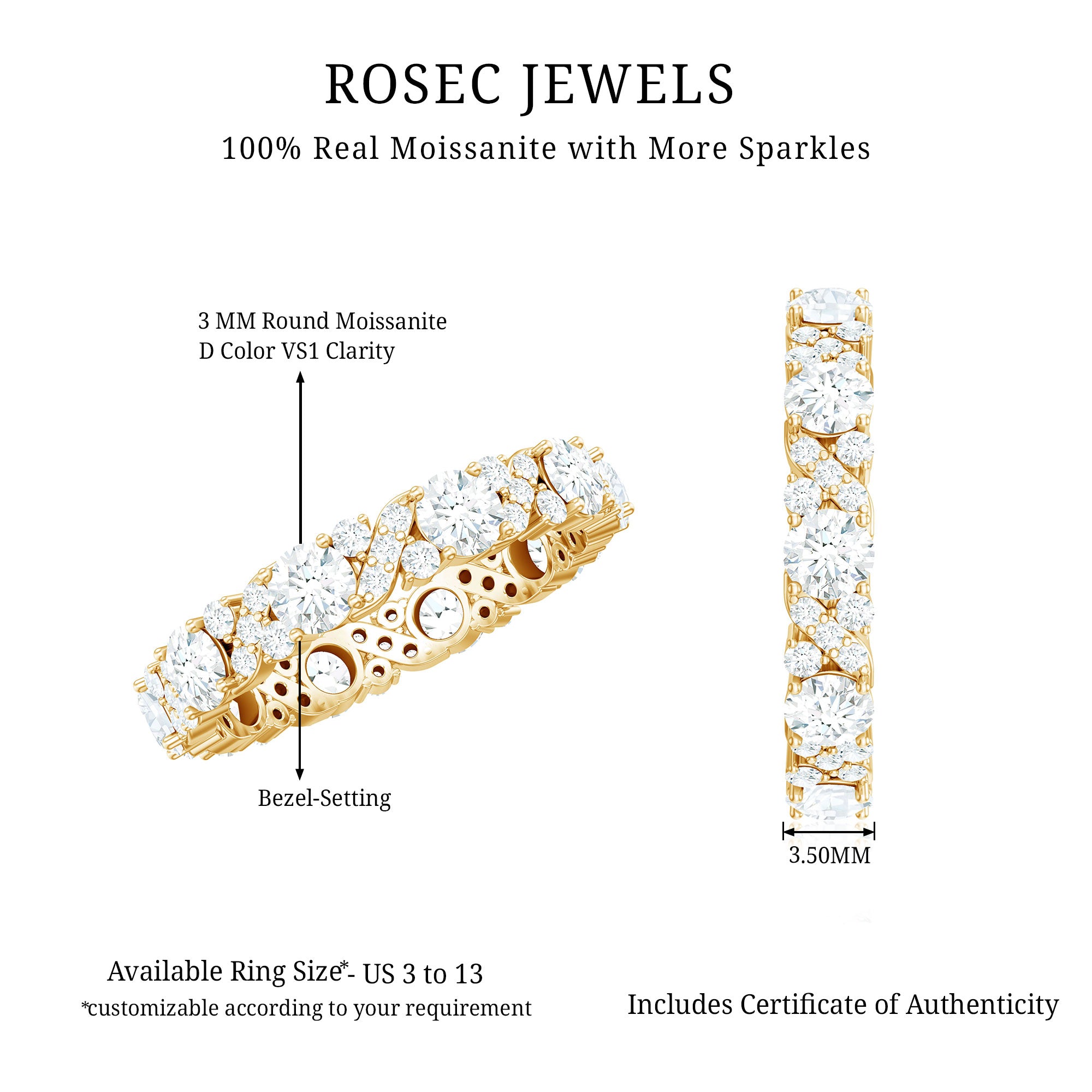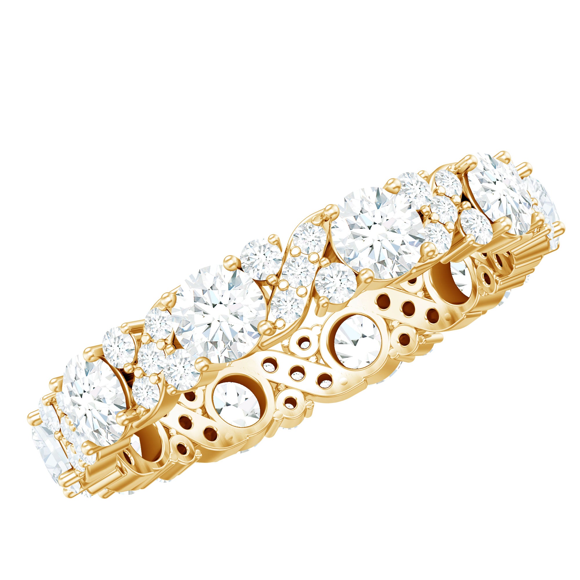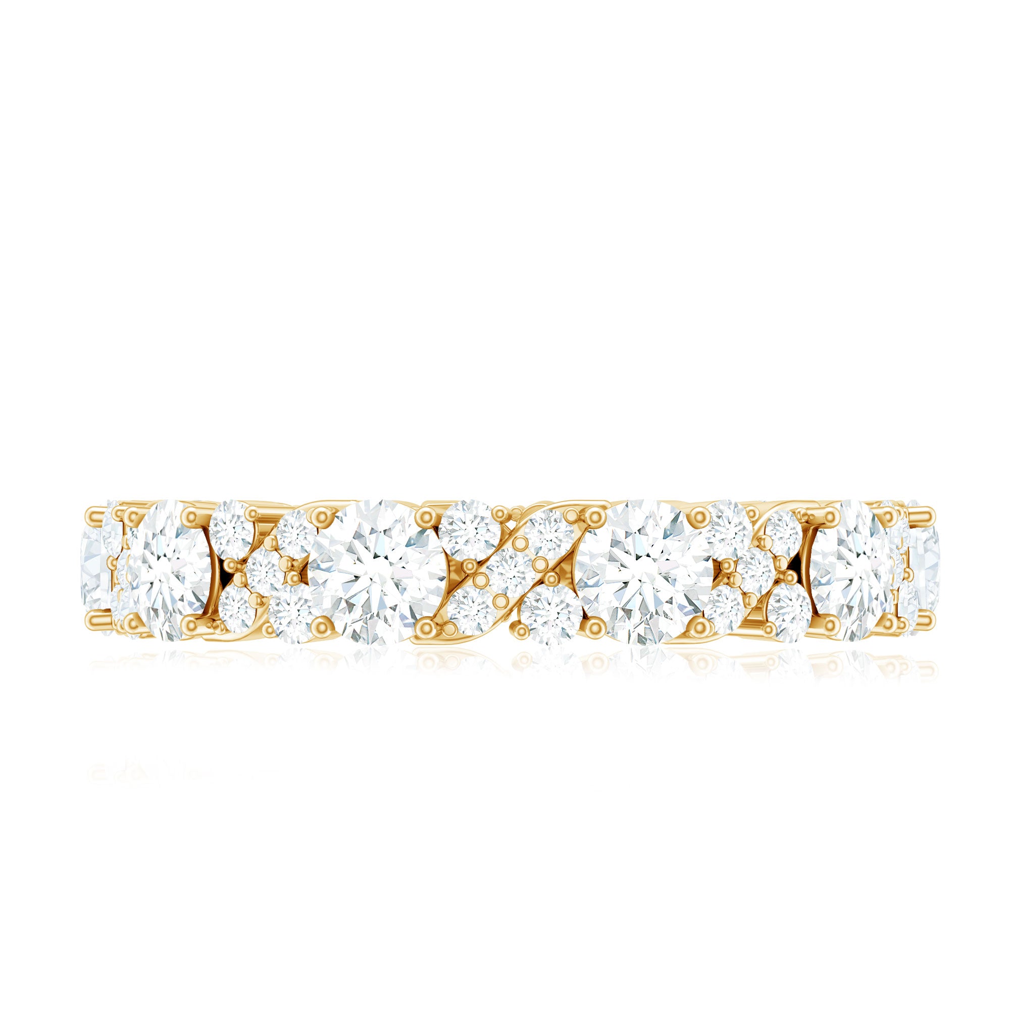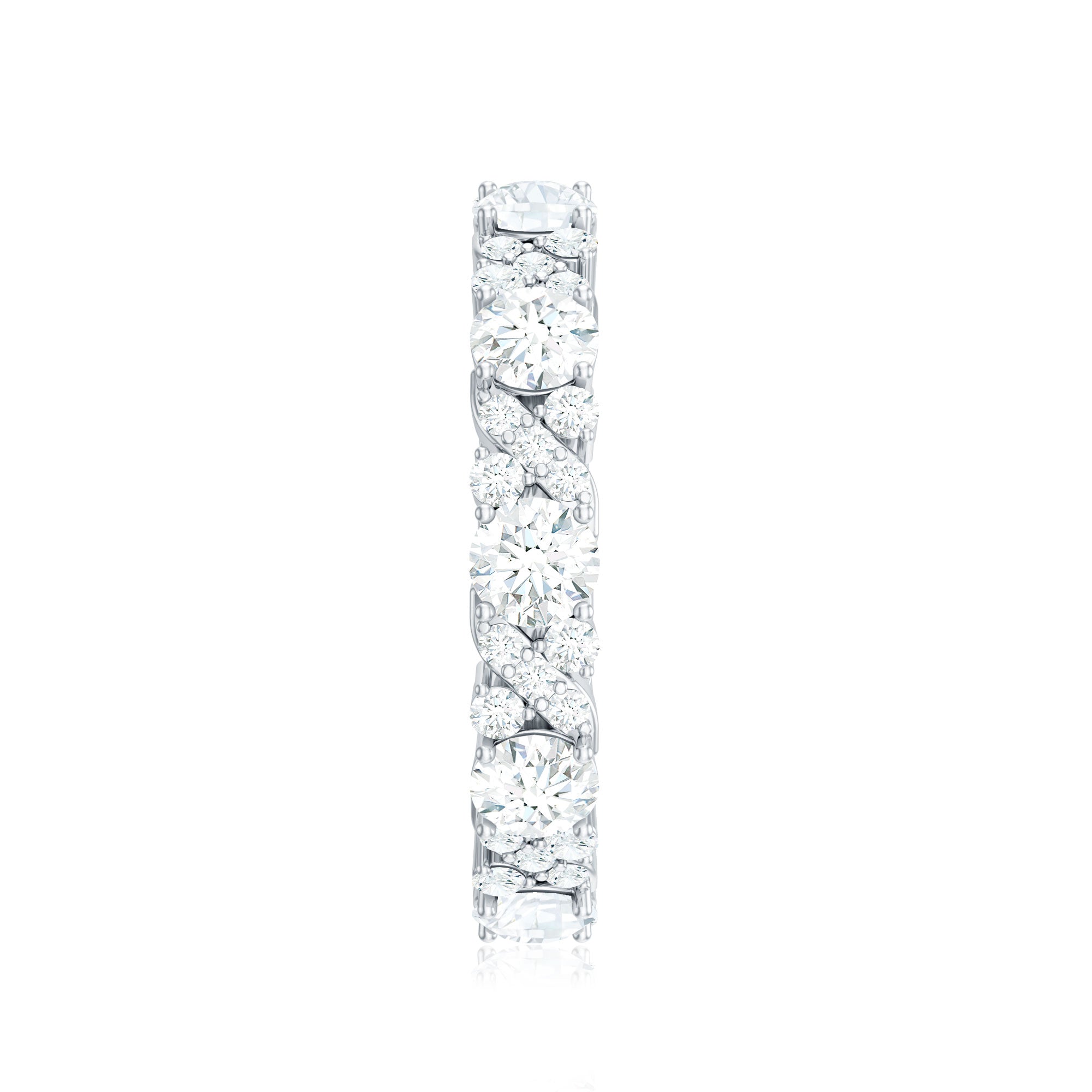 Unbroken, unending, and unforgettable - this Moissanite Wedding Band is more than just a symbol, it shows a promise. A timeless representation of a never-ending love, this Full Eternity Band is crafted with exquisite brilliance and enduring elegance. It features a stunning combination of small and large round cut moissanite stones, with each gem meticulously selected for its flawless D color and VS1 clarity. The result is a dazzling band that not only reflects light but also symbolizes the depth of your commitment. With secure prong setting, the stones are arranged to capture light from every angle, ensuring a bright display that captivates the eye. Its elegant design allows this Wedding Anniversary Band to be worn alone for a classic appearance or stacked with an engagement ring or other bands for added flair and drama. This Moissanite Eternity Band serves as a lasting reminder of special moments, whether you are celebrating a wedding, anniversary, birthday, or a significant moment of self-love. Beautifully crafted and eternally meaningful, this Stackable Eternity Band transforms everyday wear into a celebration of what truly matters.
