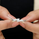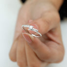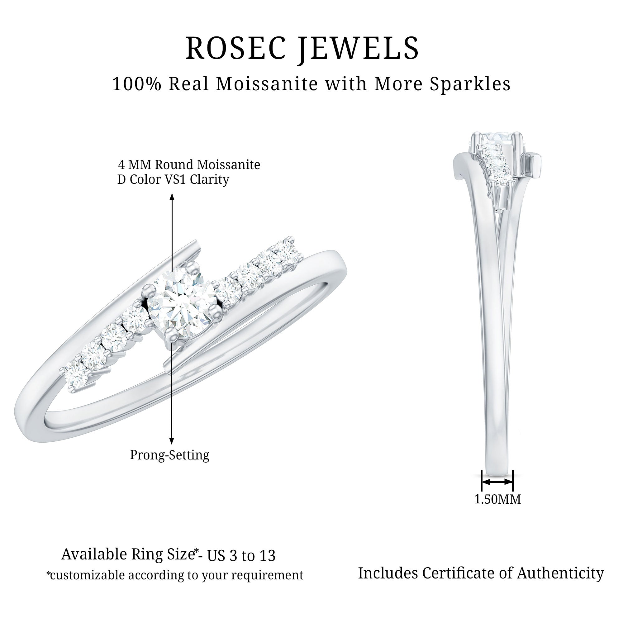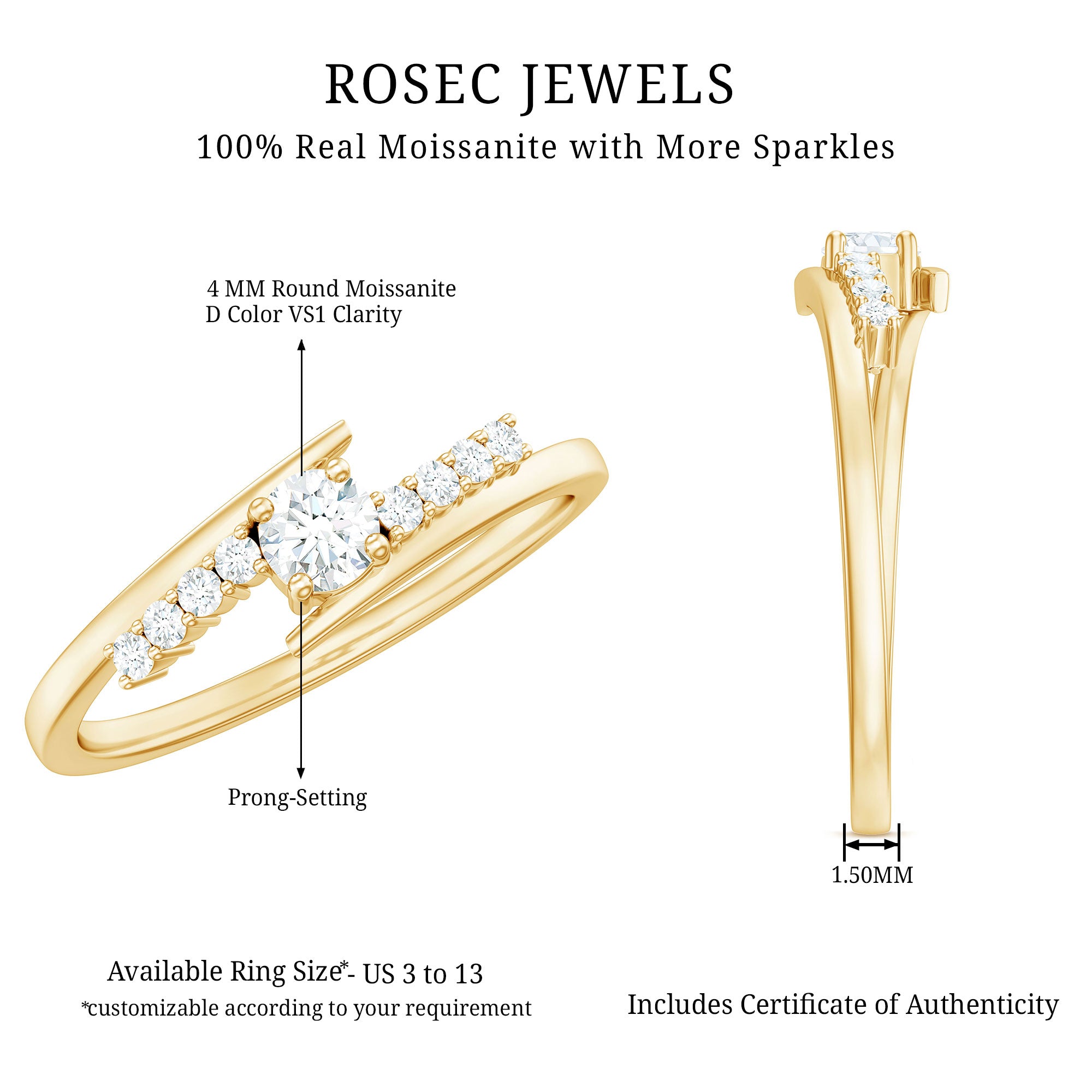 A modern twist on a timeless style, this stunning Moissanite Promise Ring symbolizes the bond that grows stronger with each passing day. At the heart of the design lies a 4 MM round brilliant cut Moissanite held in secure prong setting, radiating unmatched sparkle and clarity with its D-VS1 grade. The center stone is flanked by a row of shimmering round Moissanites on either side, all gracefully set on a bypass shank that gently curves to meet the focal gem. Whether you are marking a promise, celebrating a milestone, or simply expressing your love, this Bypass Promise Ring speaks volumes with its minimalist beauty and refined design. The high quality Moissanite stones offer incredible fire and brilliance, making them a sustainable and ethical alternative to diamonds, perfect for modern romantics. Crafted to complement any personal style, this Minimalist Moissanite Ring for Women is available in various metal colors and purities, allowing you to customize it to your preference. Lightweight and comfortable for everyday wear, it pairs effortlessly with both casual and formal outfits. Comes with a certificate of authenticity and is presented in a luxurious jewelry box, ready to create a memorable gifting experience.
