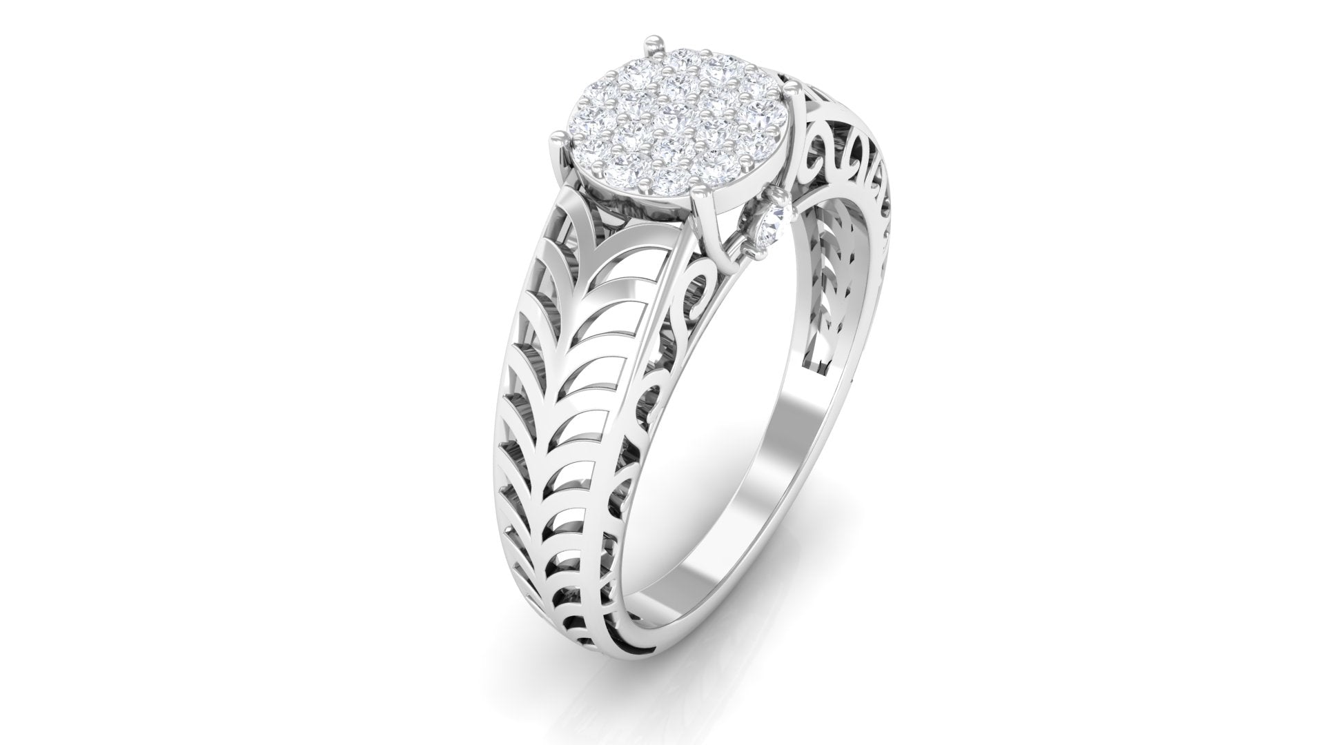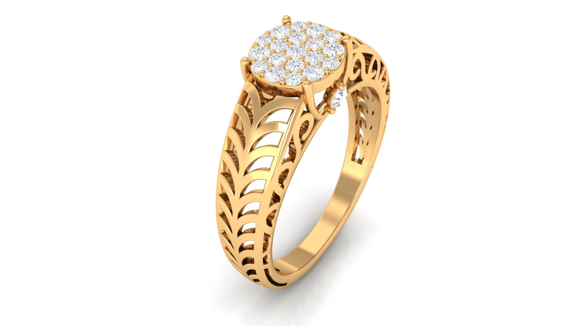 With a sleek and classic design, the Diamond Engagement Ring is a stunning piece of jewelry embellished with a cluster of Round Brilliant Cut Diamonds set in a pave setting. Crafted with Gold, this ring features an intricate filigree design that adds to its attractiveness and eye-catching appeal. Perfect for any wedding collection, this filigree ring is an excellent addition to upgrade your jewelry collection. It also makes an ideal gift for any occasion.