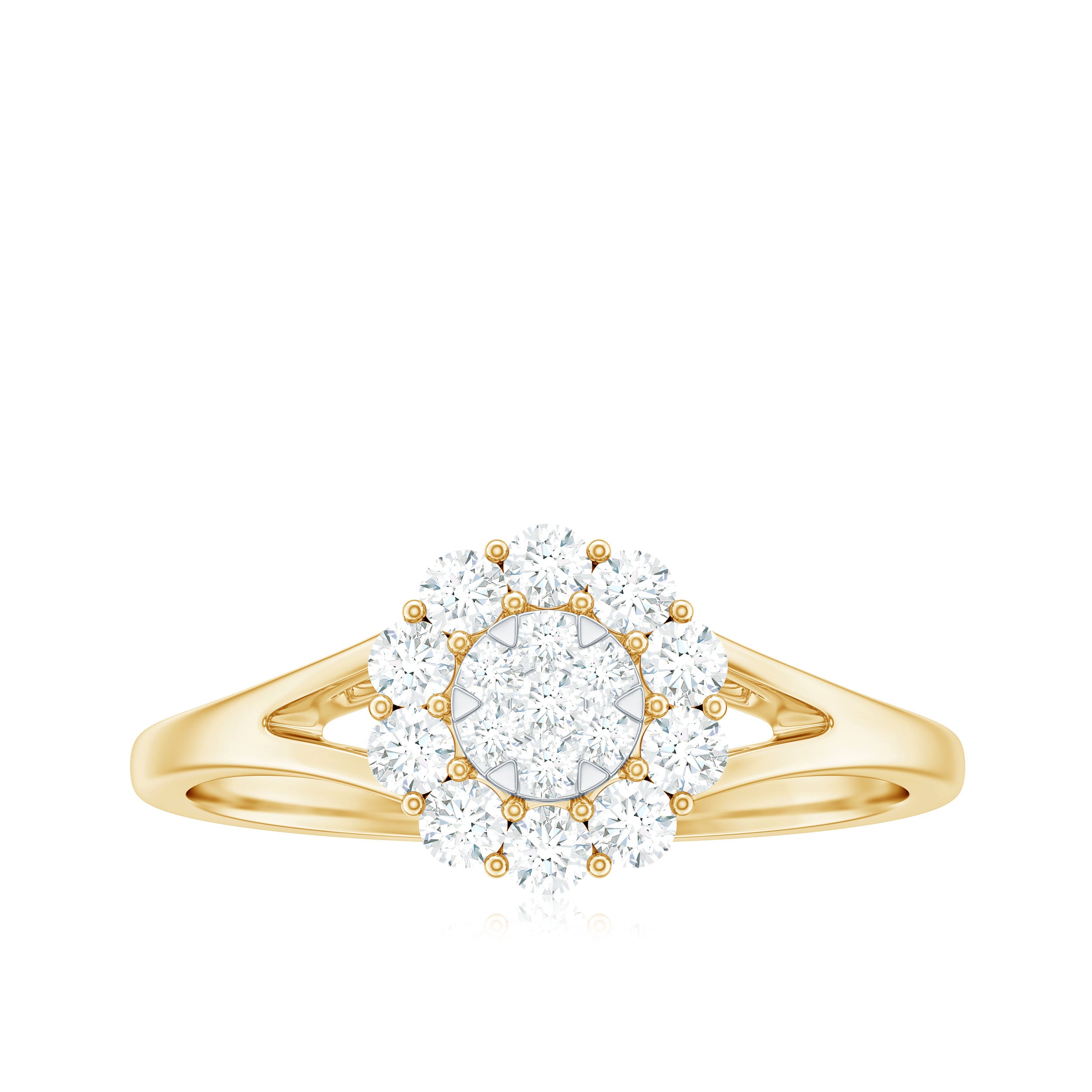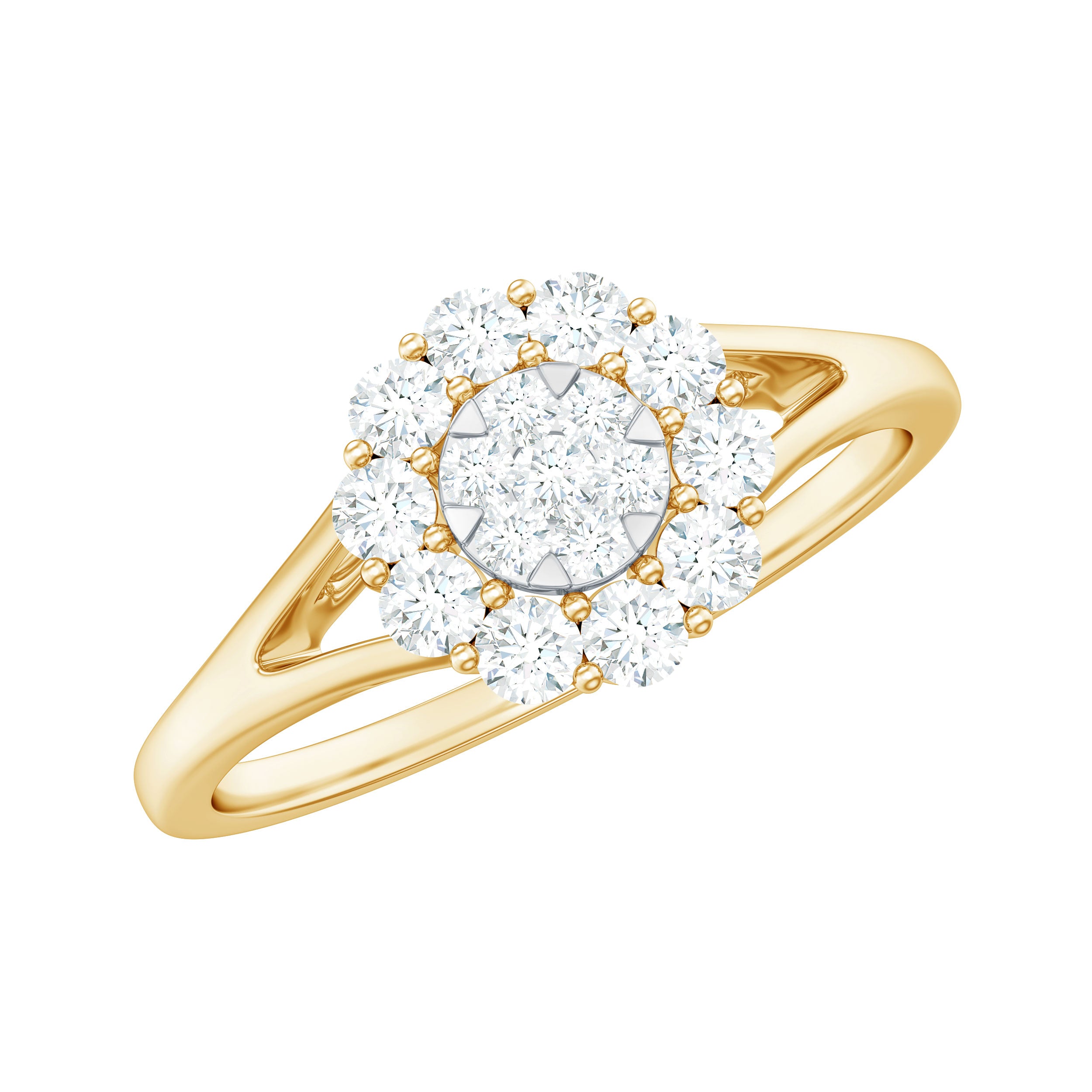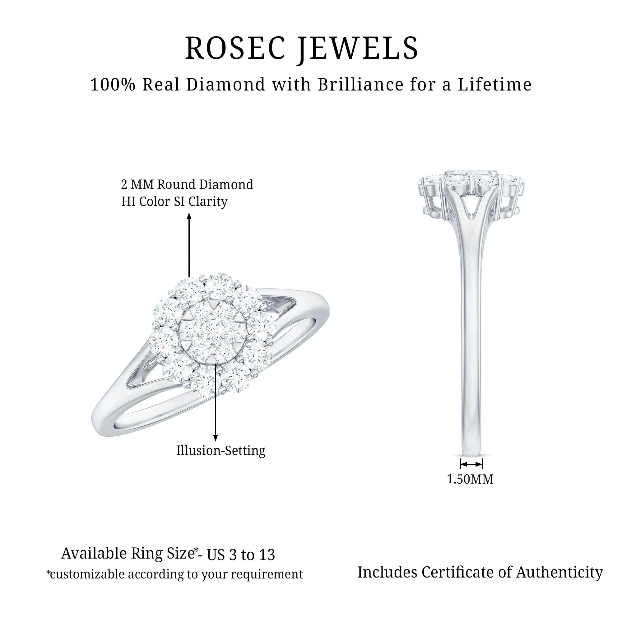 As the sparkling Diamond Promise Ring turns heads, it makes your moment even more unforgettable. As a heartfelt commitment, this Floral Promise Ring catches the glimpse and breaks out with sparkle and vibrant beauty. As a symbol of enduring love and refined simplicity, this Commitment Ring is adorned with Round brilliant cut Diamond in an Illusion Setting, making a beautiful cluster. To adorn this Ring is the Round Shape Diamond that makes a stunning Halo, along with a Split Shank. This Promise Engagement Ring is a deeper connection to relationships and self-expression, also promising trends that will bloom. It promises to celebrate nature, mimicking the flower-type pattern, making it a gorgeous piece of jewelry. Its rare design is sure to astound your sweetheart. The dazzling brightness includes a lot of sparkle and gleam that catches everyones attention. Flower Engagement Ring stands apart from others, giving a distinctive look and garnering a lot of attention. Stylish and feminine, this Floral Diamond Ring has extremely floral details exuding passion.