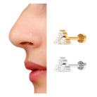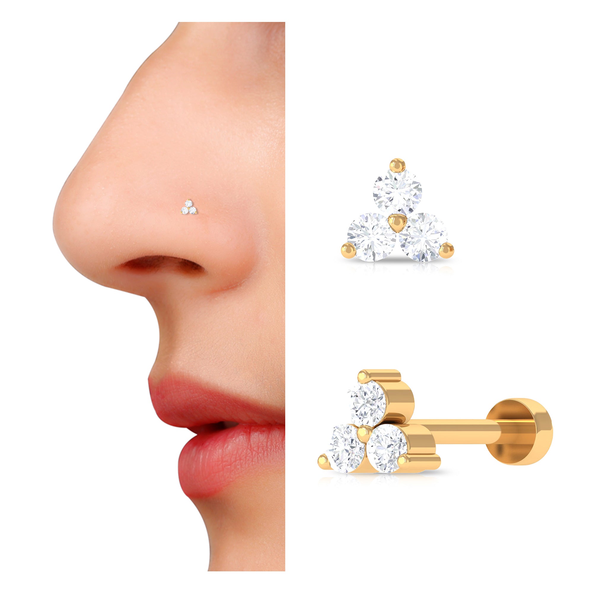 This Diamond Three Stone Nose Pin is crafted with Real Gold and adorned with three Round Cut Diamonds secured in Prong Setting, creating a stunning and sophisticated piece of Body Jewelry. Its delicate design adds a touch of understated elegance to any outfit. The tiny size of the Nose Pin makes it a great option for those who want to add some sparkle to their accessories without being too heavy. This Gold Nose Jewelry is perfect for anyone who wants to add a touch of extra shine to their look.