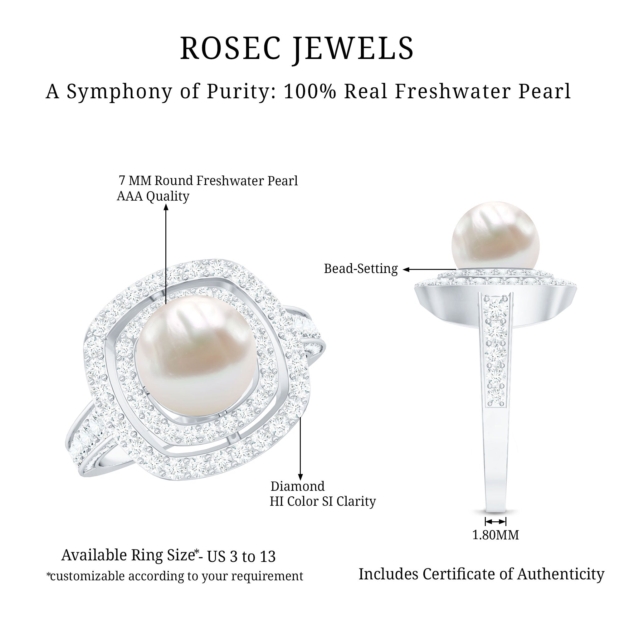 Round Freshwater Pearl and Moissanite Double Halo Engagement Ring