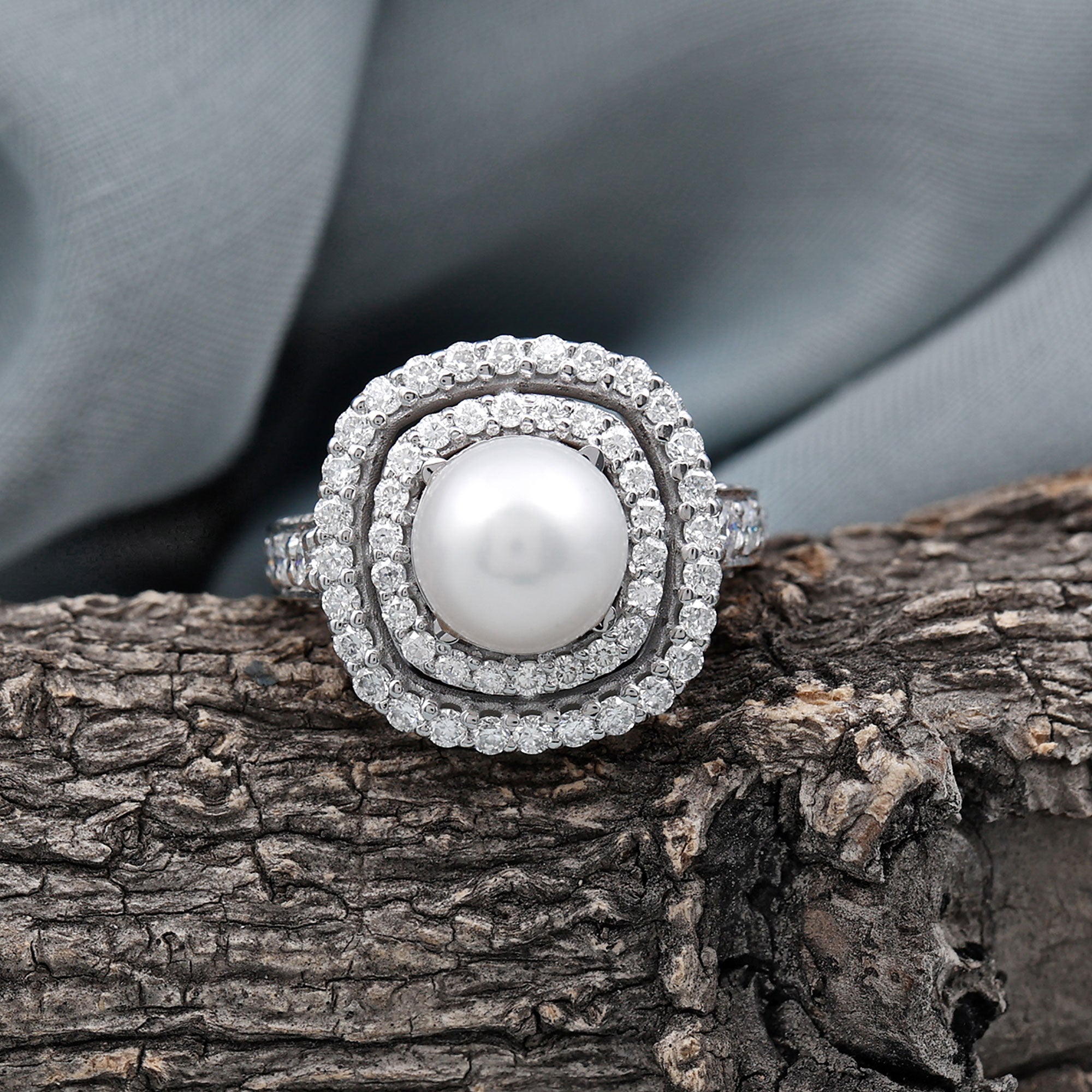 If your fashion mantra is go big or go home, this Freshwater Pearl Double Halo Ring is the one for you! Meant to make an eye-striking statement, it highlights the enormous centerpiece of 7 MM Round Shape Freshwater Pearl, secured by Prong Setting. For added flair, it is complemented by a sparkling Double Halo of Moissanite. This Pearl and Moissanite Ring has been certified for its phenomenal quality, which makes it a prized possession in your jewelry box.