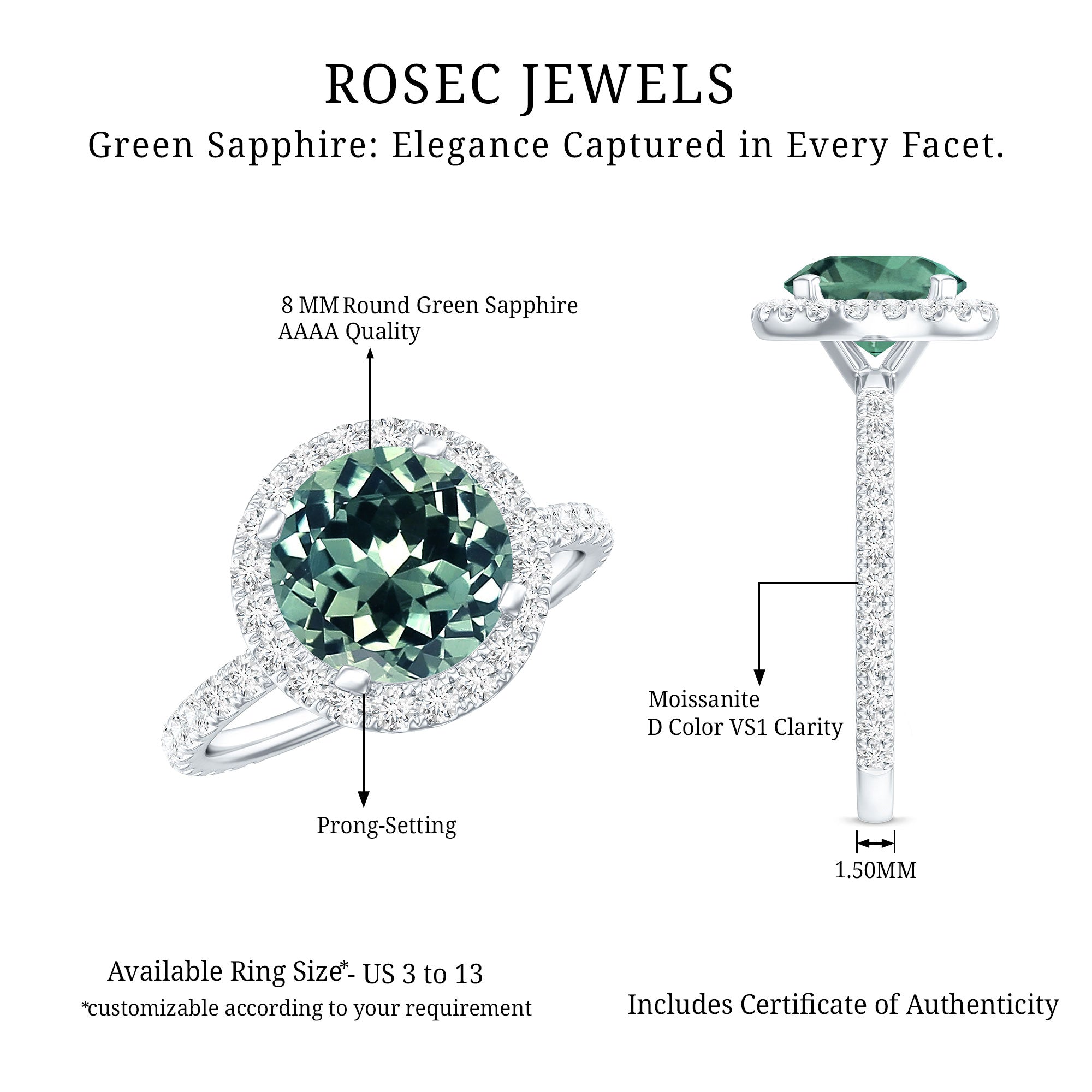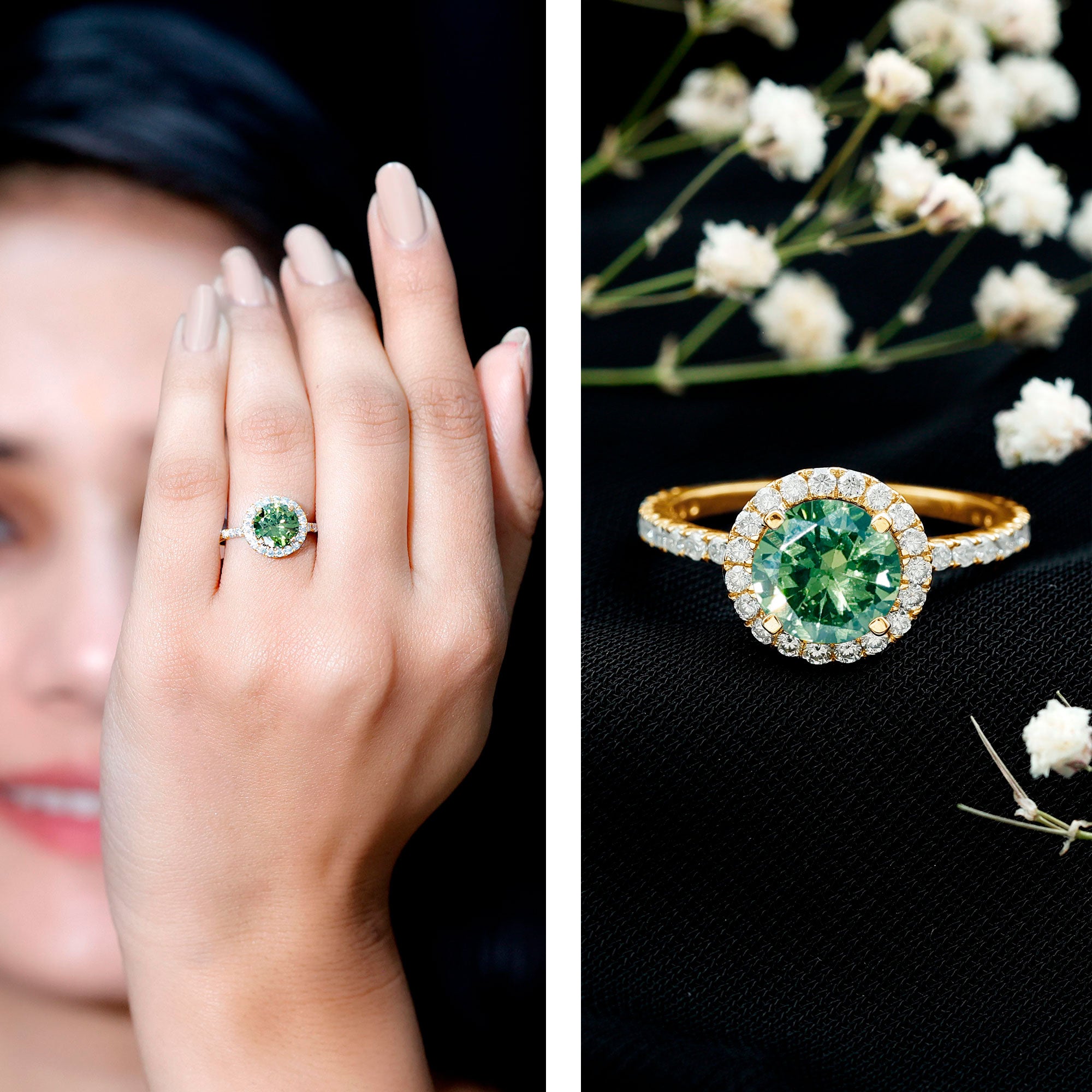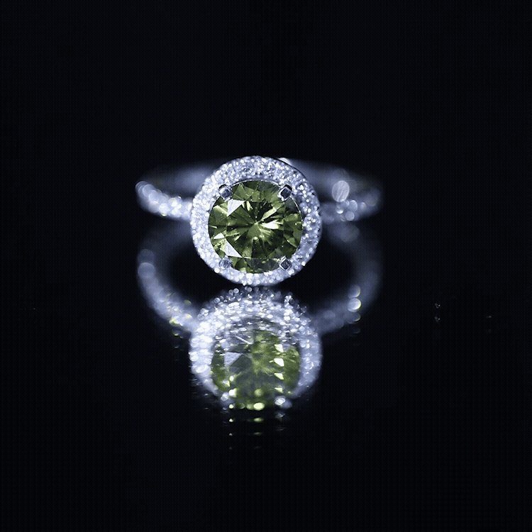Discover a timeless treasure for your beloved with this exquisite Classic Floating Halo Ring showcasing a brilliant Round Cut Created Green Sapphire and Moissanite. A true delight for any woman, this Engagement Ring provides you peace of mind and confidence in your choice.
