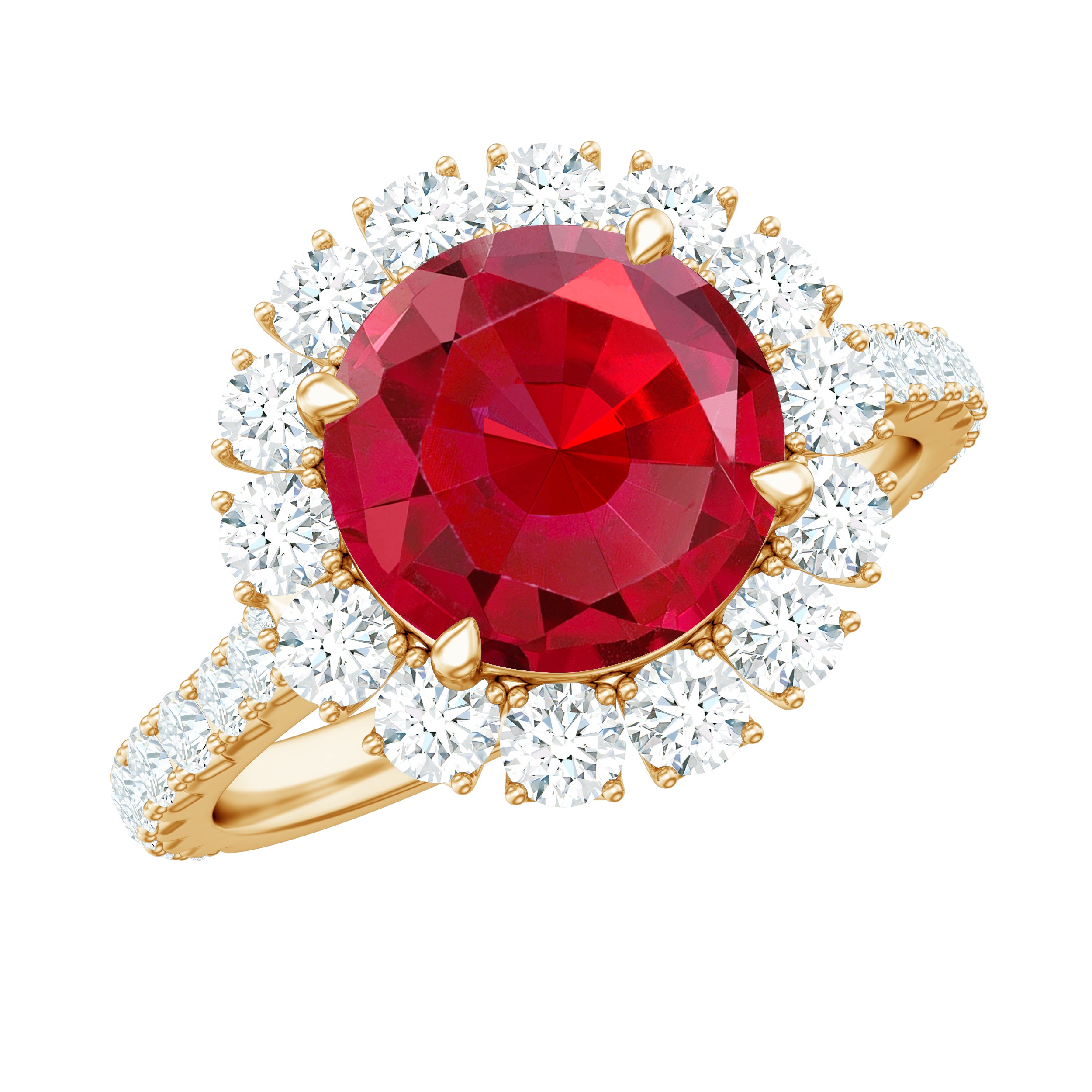 Let your love radiate in every small detail with this stunning Ruby Halo Ring that is sure to attract attention. This Ruby Engagement Ring is crafted for those who seek something significant and beautiful. It features an 8 MM round lab created ruby that is securely held in prong setting and encircled by a halo of round moissanite stones, giving the Lab Created Ruby Ring a luminous and radiant appearance that reflects light from every angle. The moissanites gracefully extend down the band in a delicate line, enhancing its brilliance. Additionally, there is a charming hidden detail, a small peek-a-boo moissanite is nestled just below the center stone, like a secret known only to the wearer. This Halo Engagement Ring harmoniously combines classic design with a hint of modern elegance. It is ideal for someone who appreciates timeless styles but desires a touch of extra sparkle and character. Whether you are proposing or celebrating a special love, this Ruby and Moissanite Ring is a lovely way to express how much she means to you. It is offered in various sizes and comes beautifully packaged in a thoughtfully designed jewelry box.