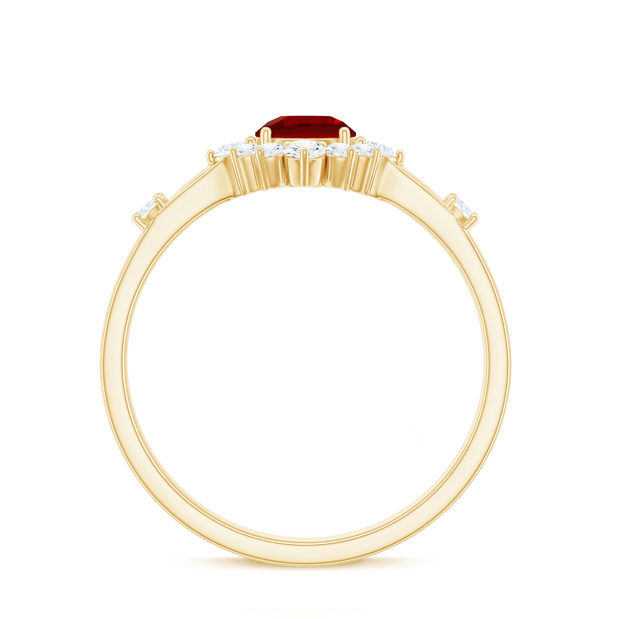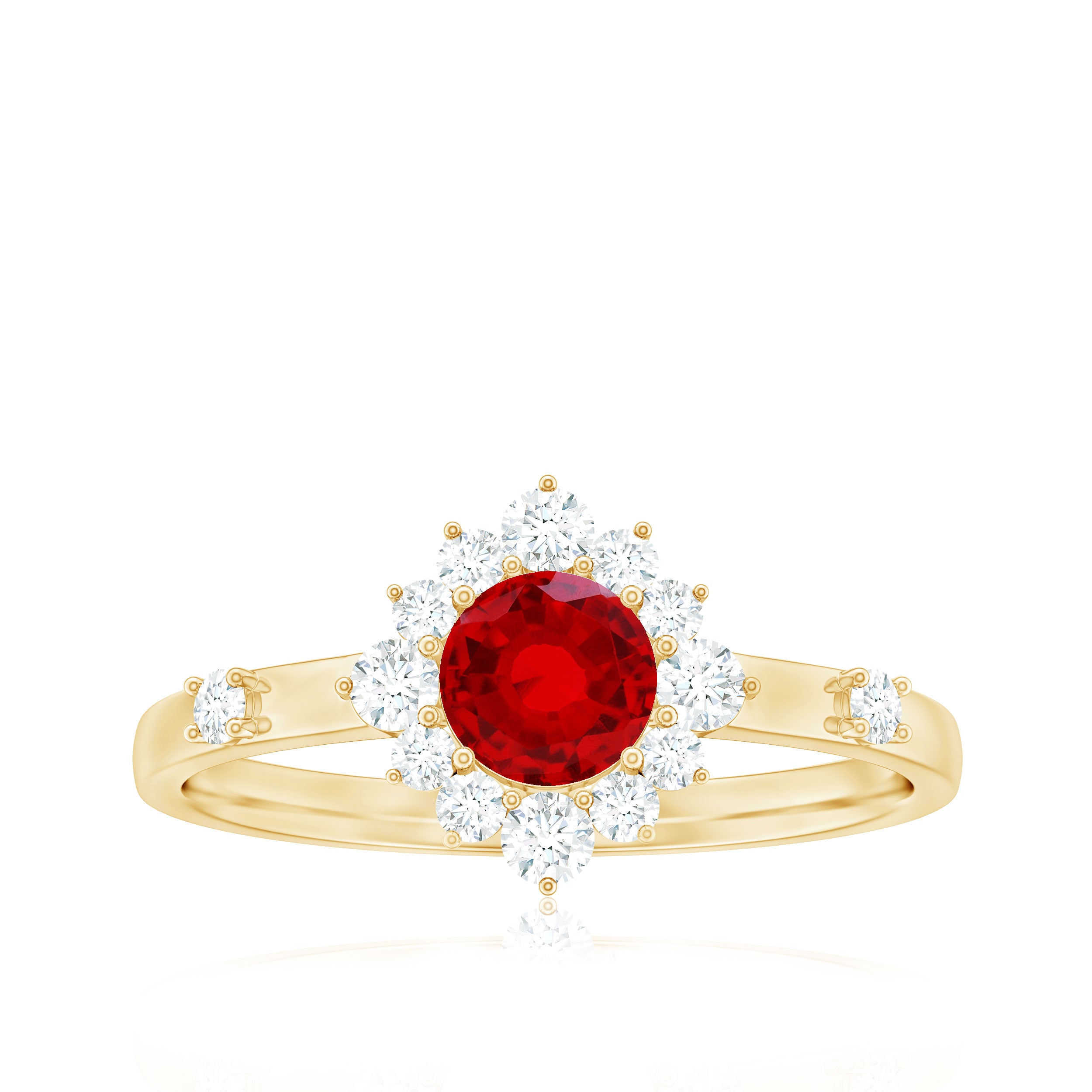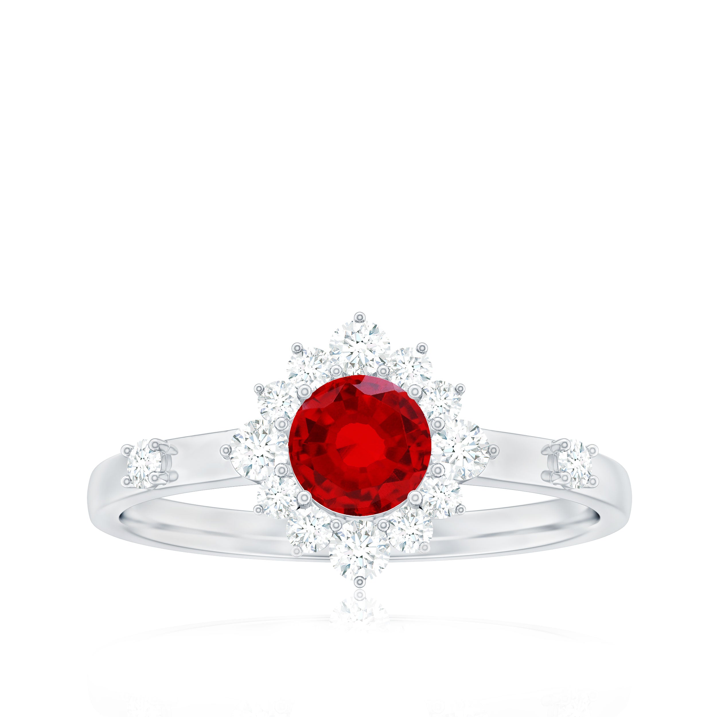 Promise a love that lasts forever with this elegant Lab Grown Ruby Promise Ring, a piece that speaks straight from the heart. At its center sits a 5 MM round cut lab grown ruby, glowing beautifully in secure prong setting. Surrounding the center stone is a sparkling diamond halo that adds a touch of brilliance and makes the ruby stand out even more. Two stones are set over the shank, giving the Ruby and Diamond Ring a graceful sparkle that catches the light from every angle. This Lab Created Ruby Ring is crafted with care and precision, blending classic charm with a modern look. The detailed work and fine finish give it a luxurious yet timeless feel that will never go out of style. Beautifully designed to express deep emotion, this Halo Engagement Ring is more than just jewelry, it is a promise, a memory, and a lasting connection. Whether worn every day or on special occasions, it reminds the wearer of the love and meaning it holds. Elegant, meaningful, and full of warmth, this Ruby Halo Ring will always be close to the heart.