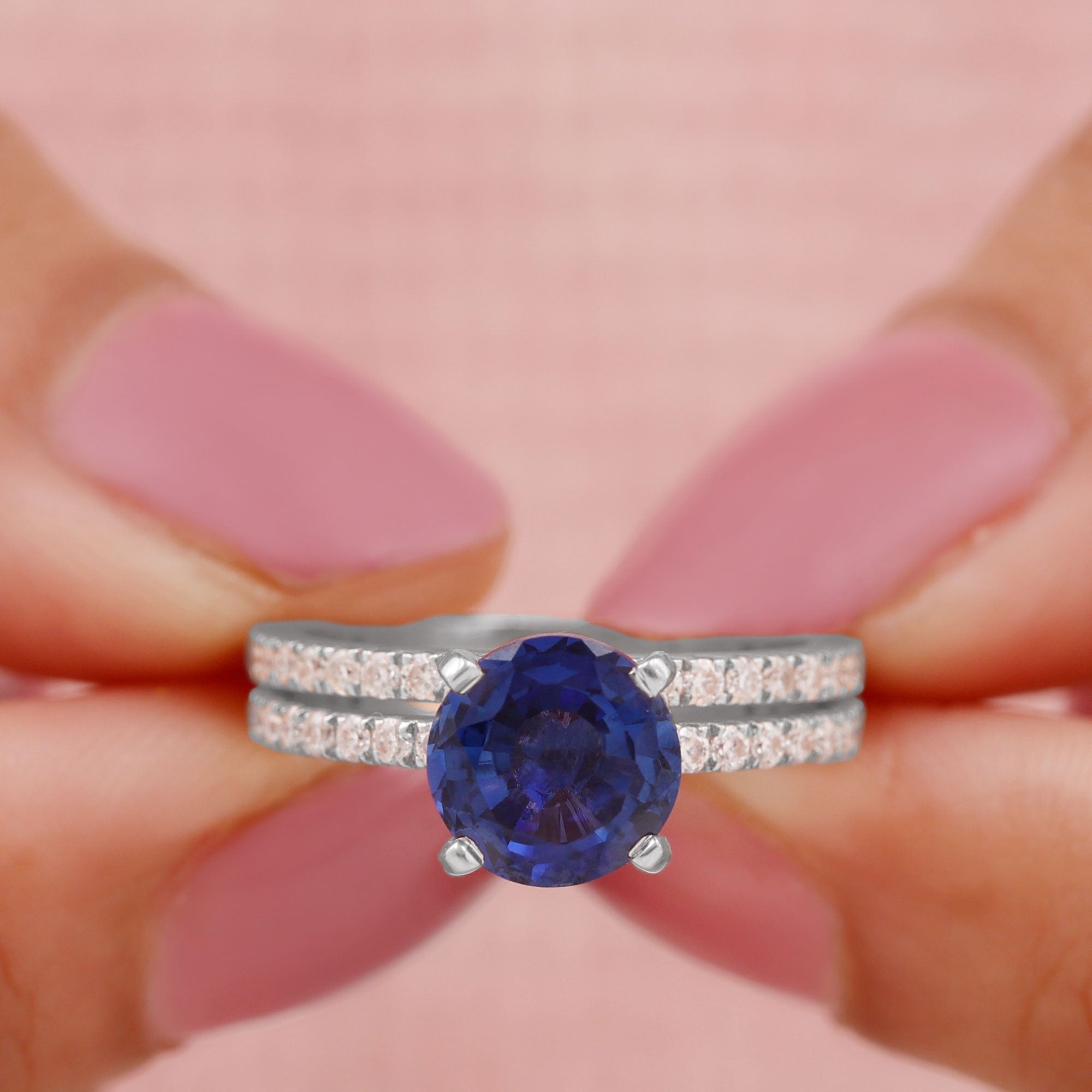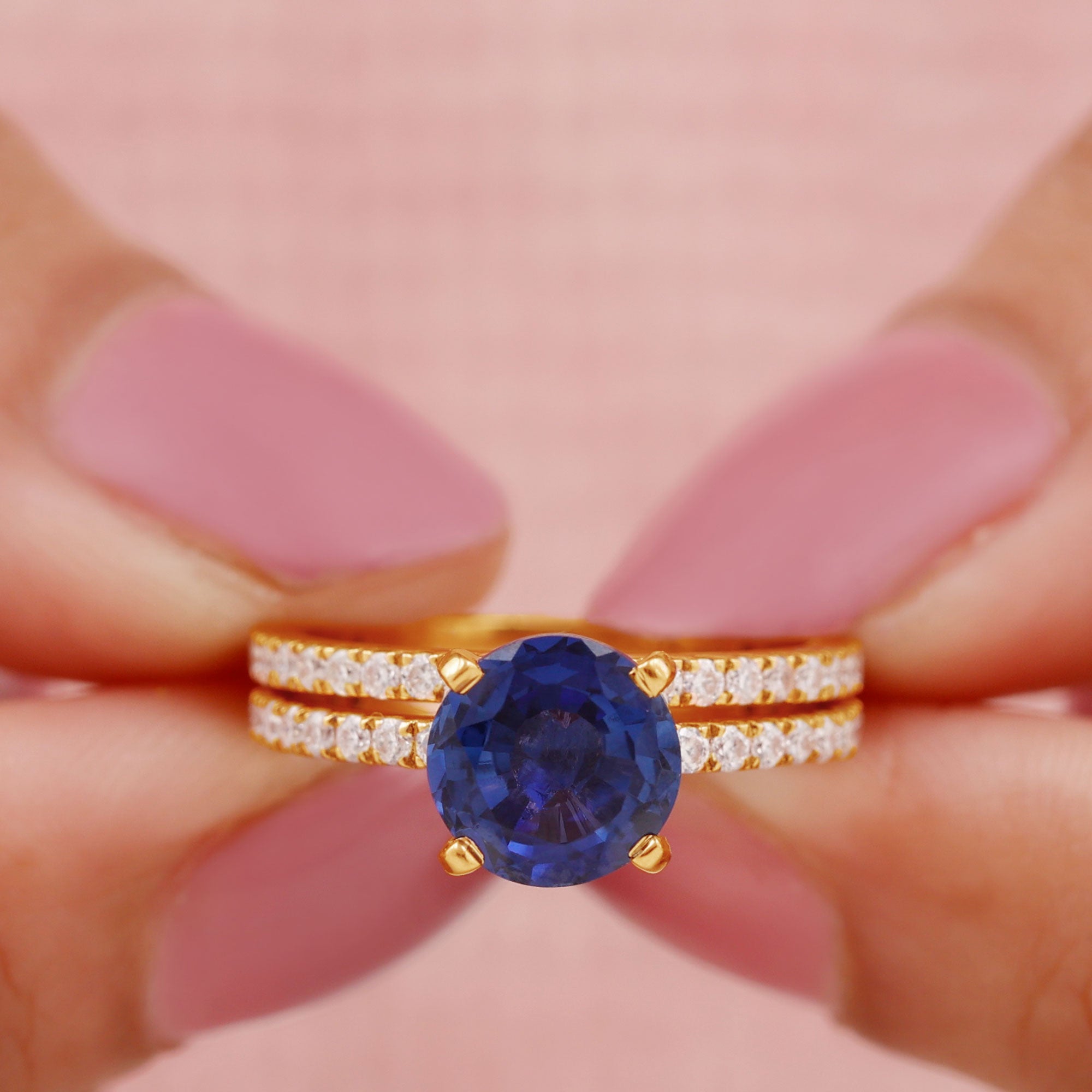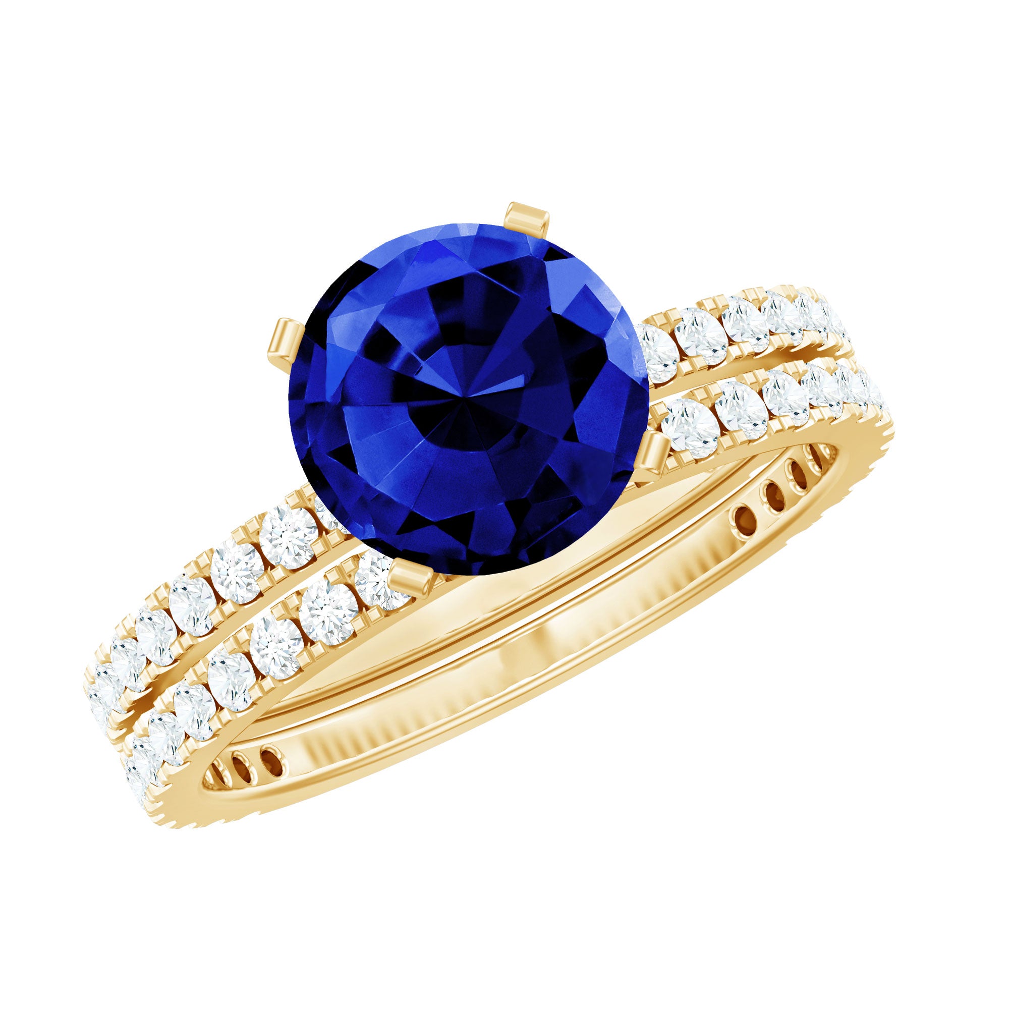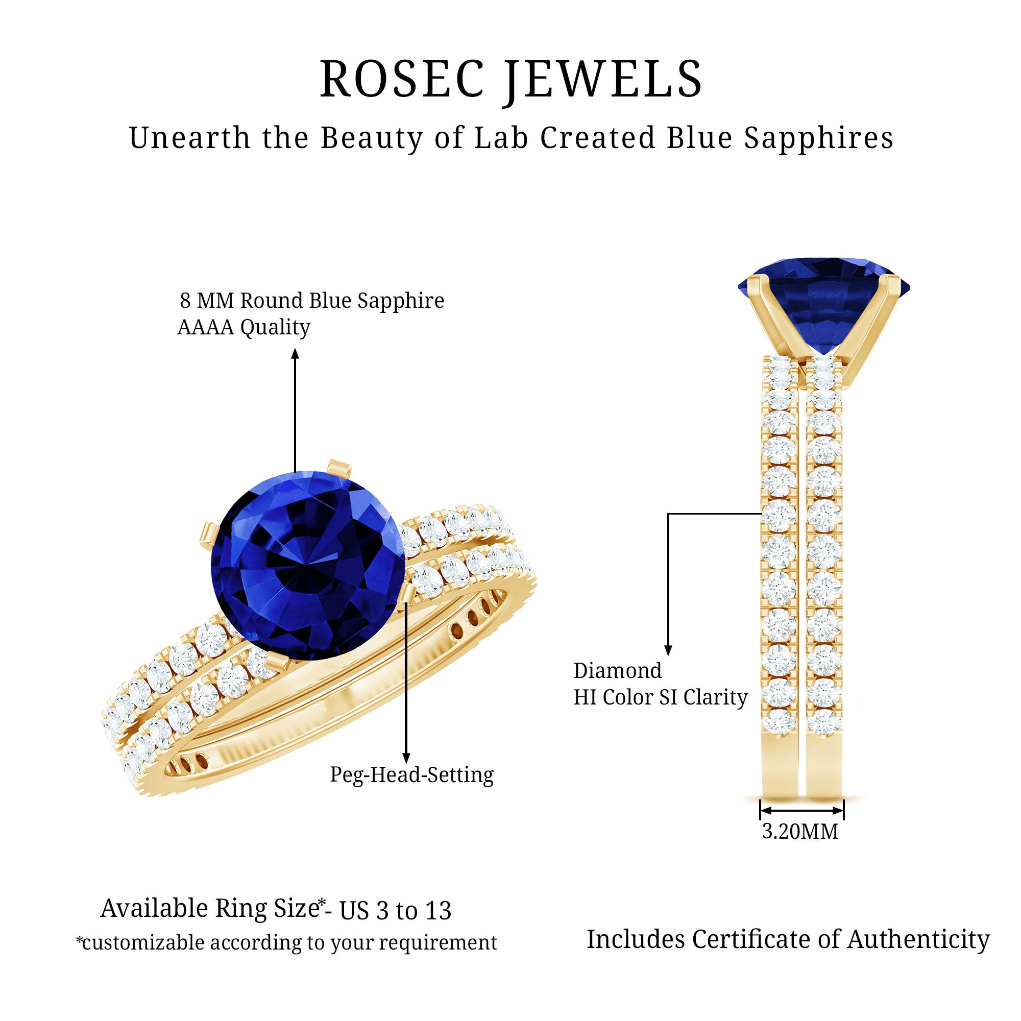 Round Lab Grown Blue Sapphire Solitaire Ring Set with Diamond