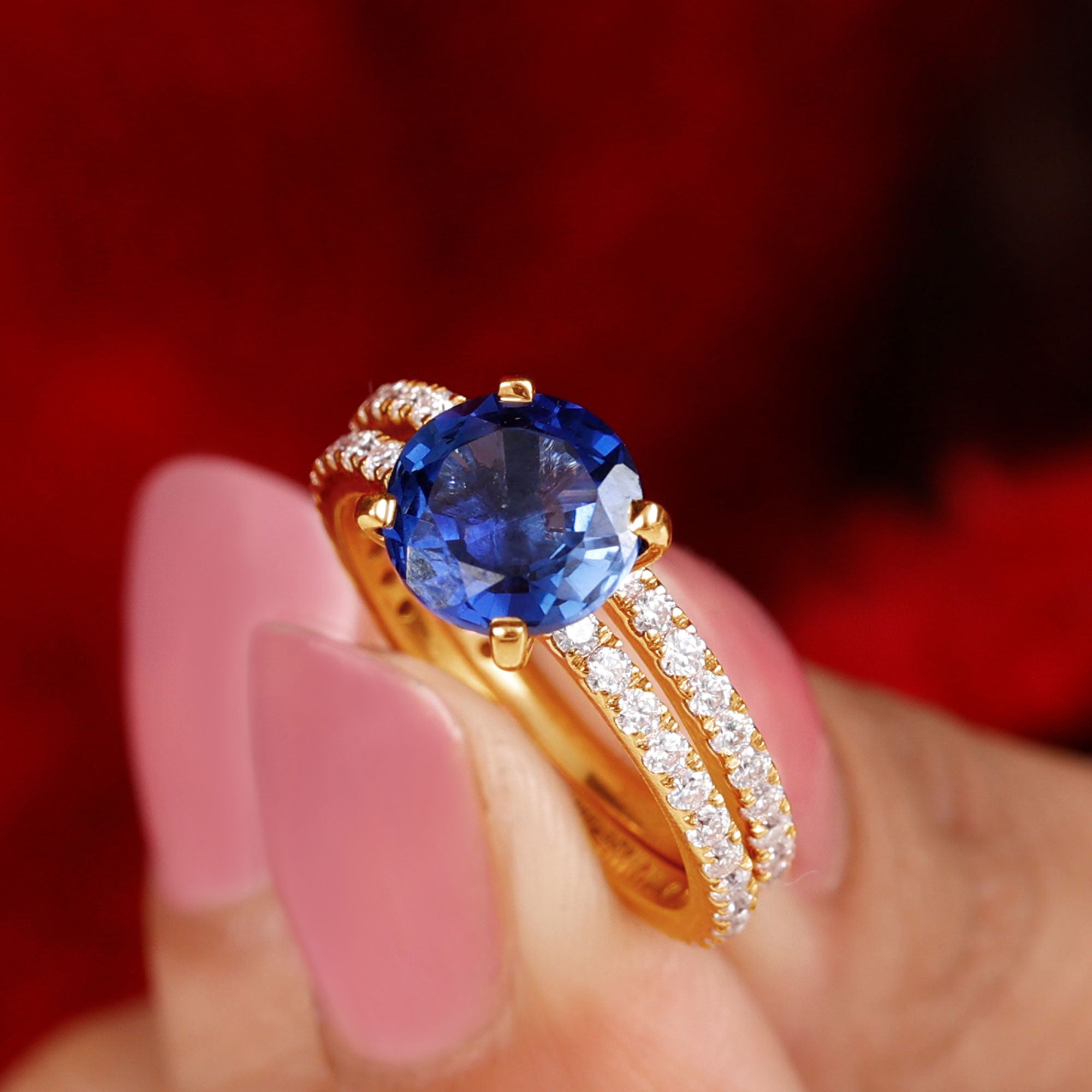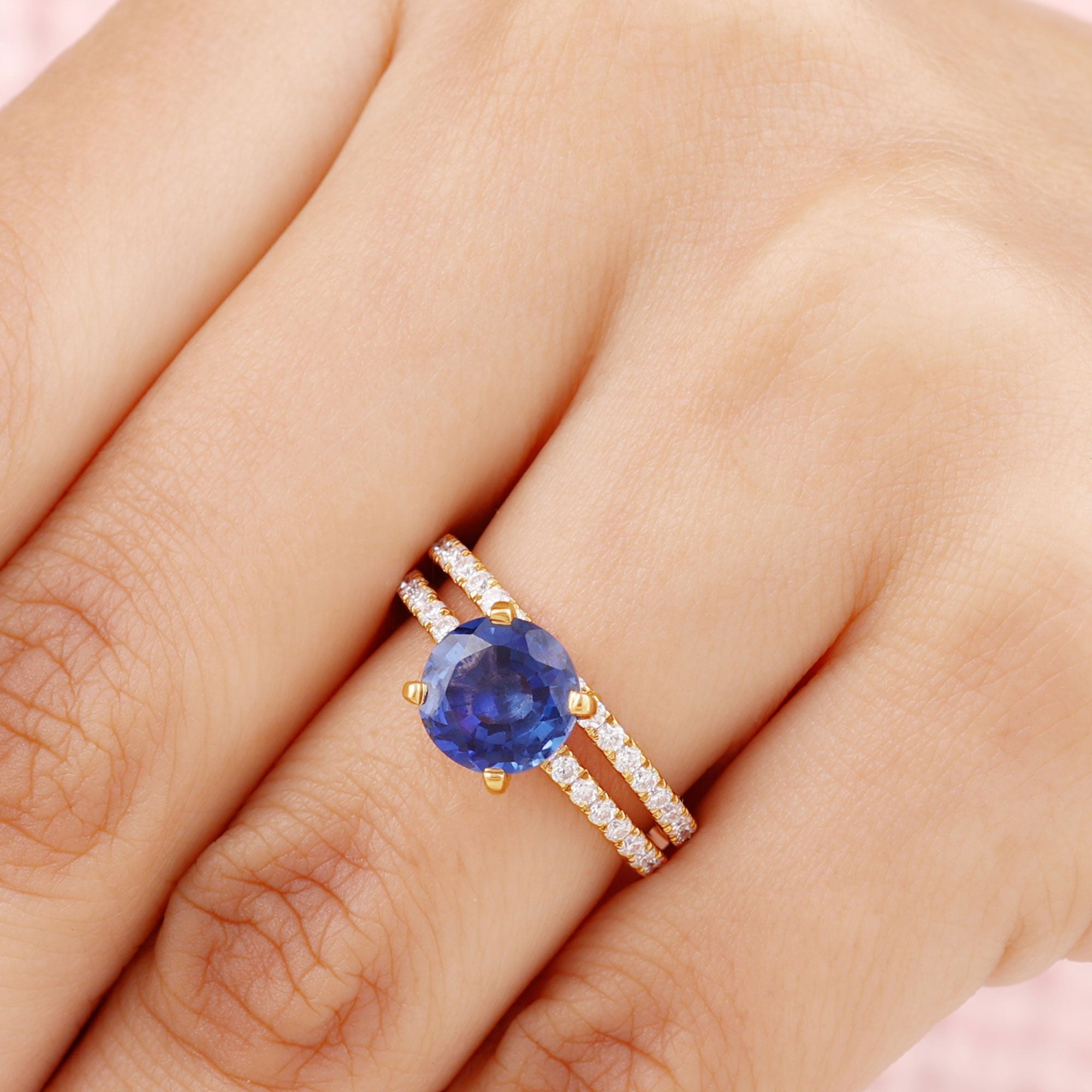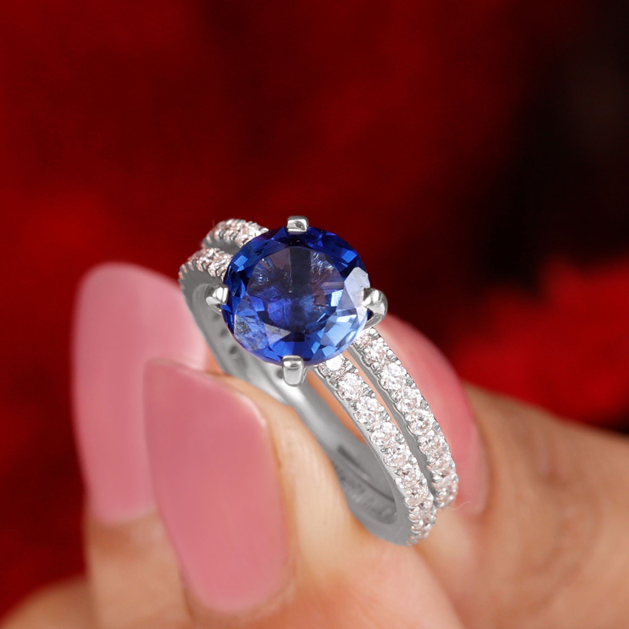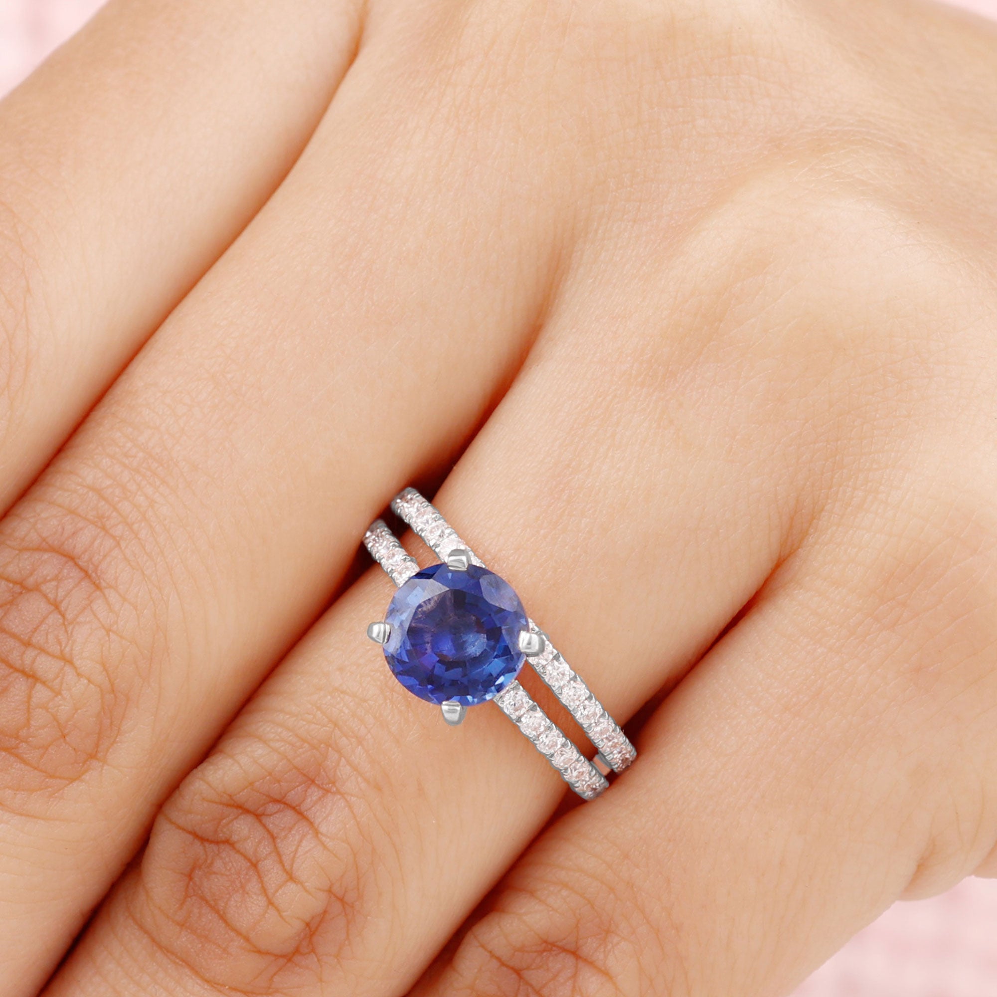 Round Lab Grown Blue Sapphire Solitaire Ring Set with Diamond