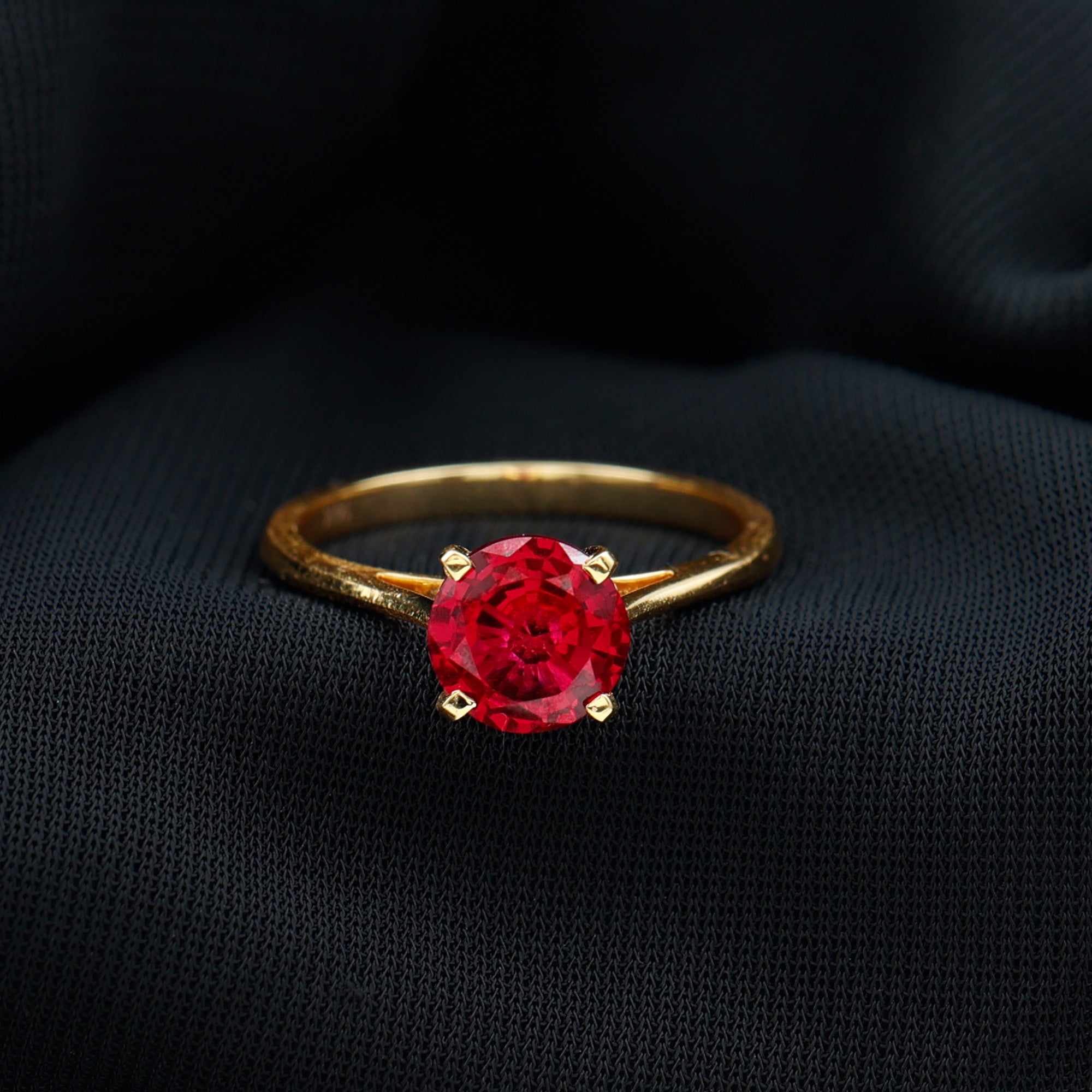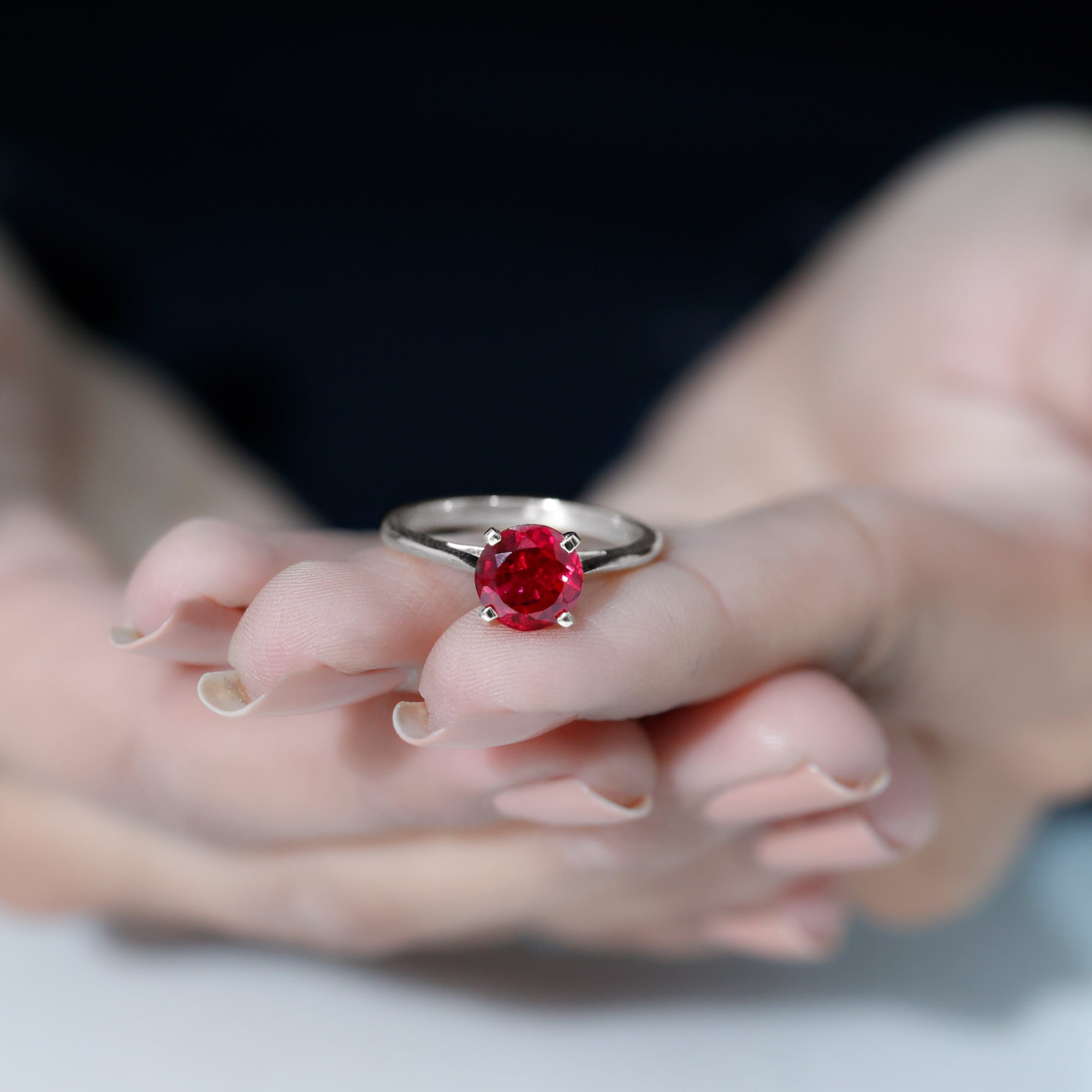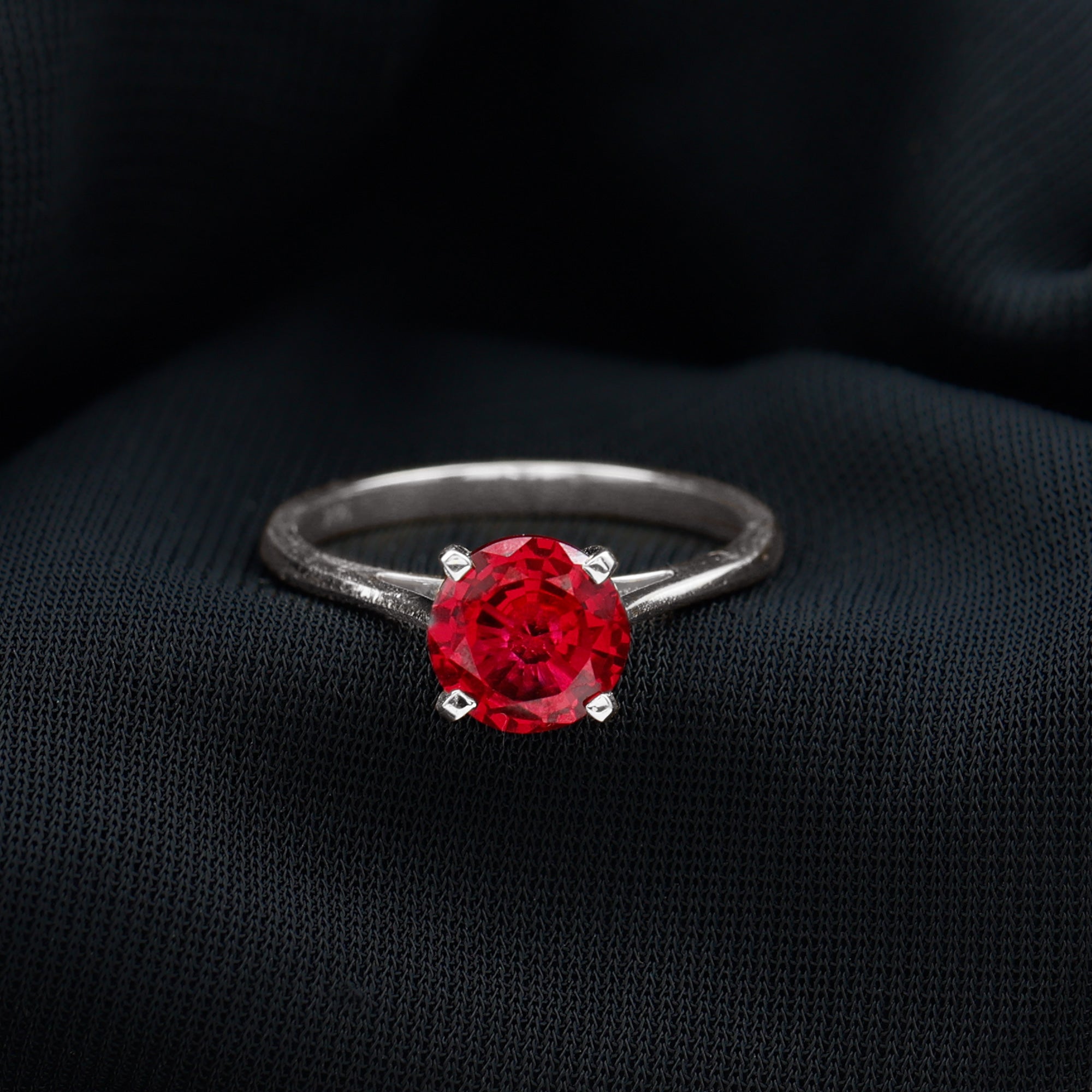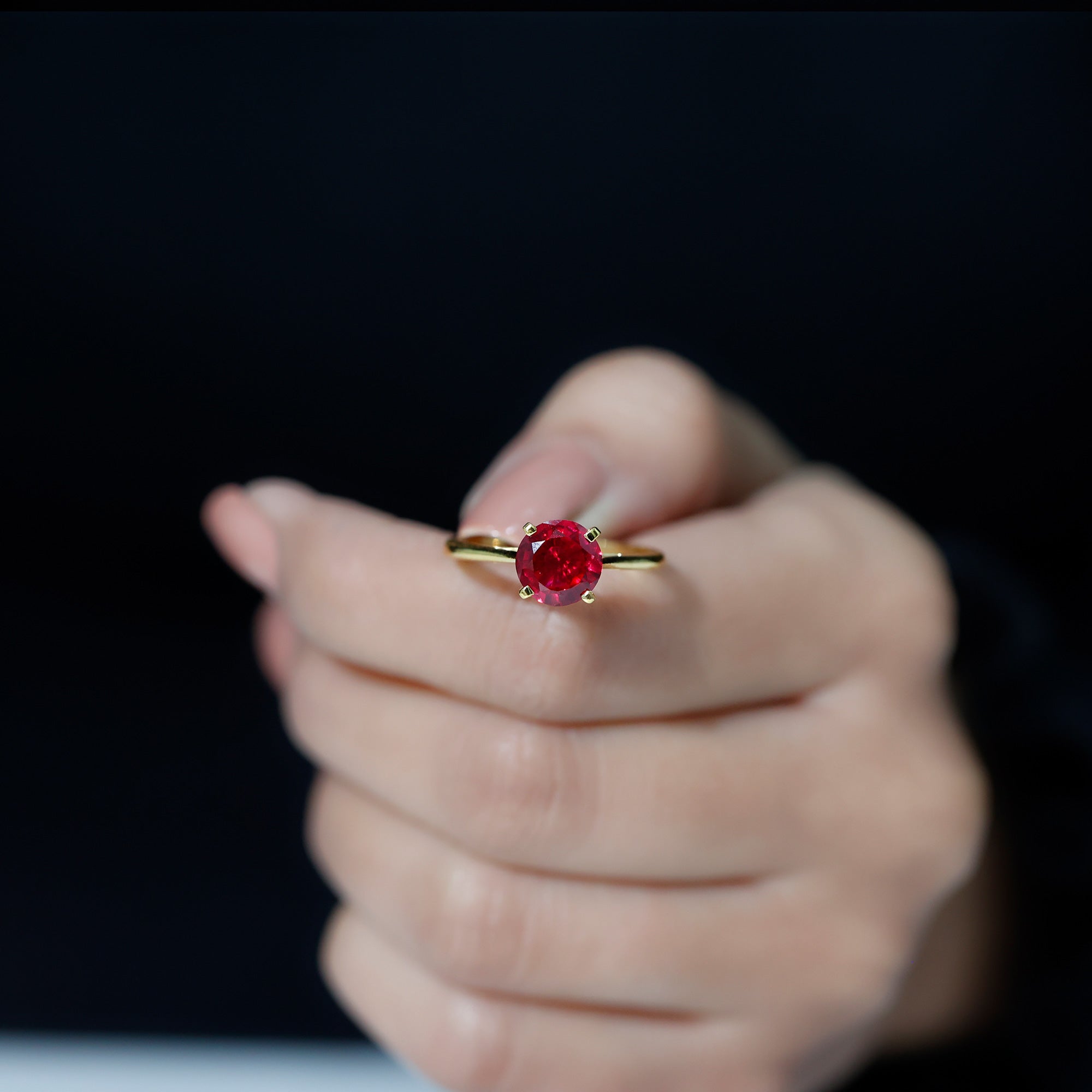 Discover the beauty of the extraordinary with this stunning Solitaire Ring. Adorned with a Round Lab Grown Ruby Gemstone, it graces the Cathedral-style shank with elegance. This Created Ruby ring, ideal for womens work wear.