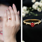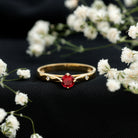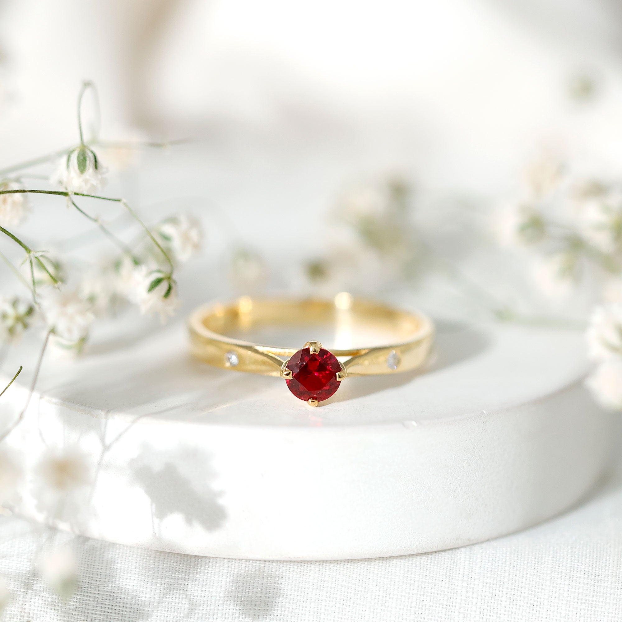 This solitaire ring features a Round Shape lab created ruby in a floral setting, with Diamond accents, making a bold addition to your jewelry collection. This created ruby ring will strike a statement every day.
