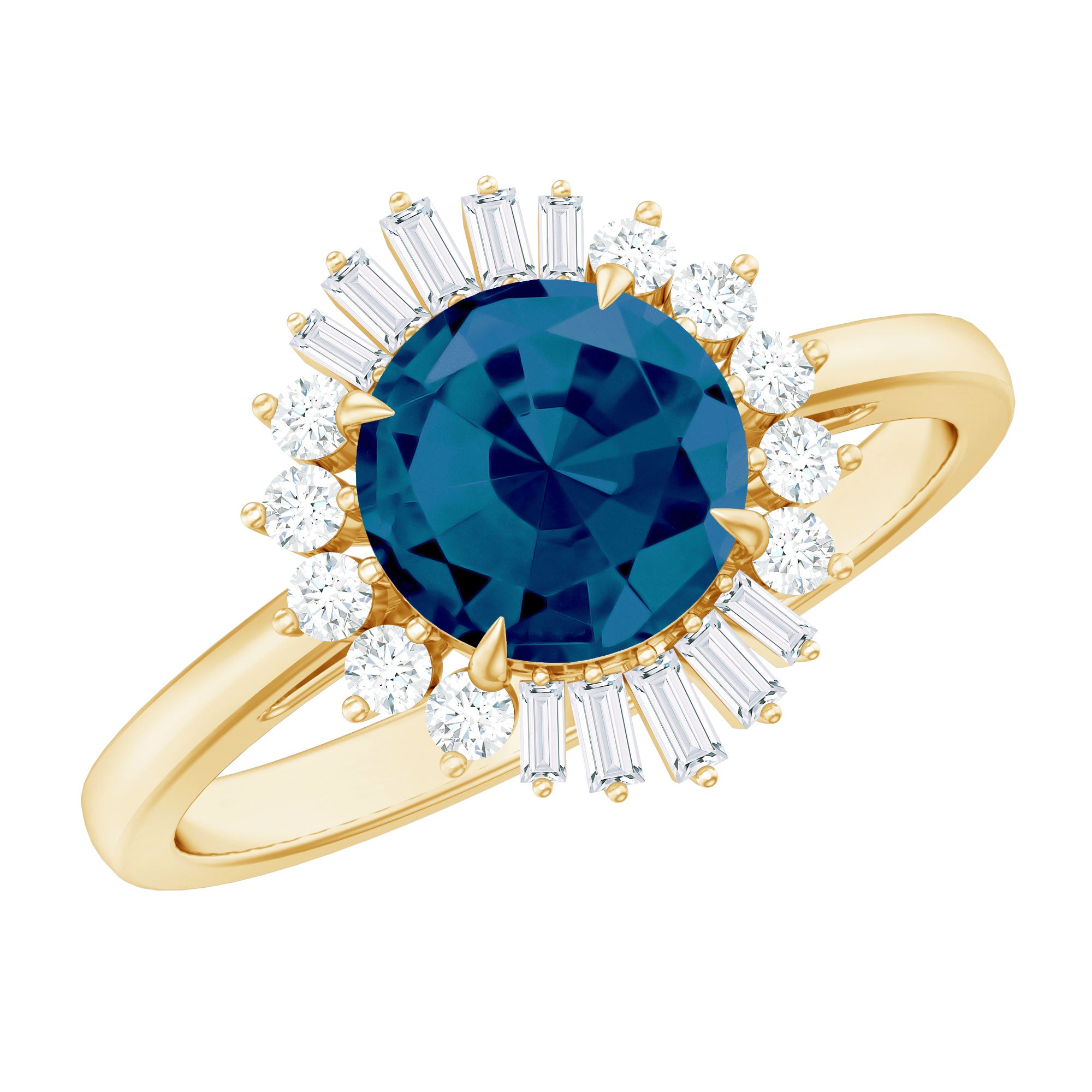 This exquisite London Blue Topaz Engagement Ring is crafted to capture the attention of all. It showcases an 7 MM round shape london blue topaz gemstone, elegantly set in a secure claw setting. Encircling the natural blue topaz is a stunning halo of shimmering baguette and round cut Diamond stones that enhance the designs brilliance and allure. The pairing of the deep blue AAA quality london blue topaz with the luminous HI-SI quality Diamonds produces a striking contrast that ensures this Halo Engagement Ring is truly distinctive. Each stone is meticulously arranged to reflect light flawlessly, providing the Round Engagement Ring with a glamorous and opulent look from every perspective. Designed with precision and sophistication, this Blue Topaz and Diamond Ring is perfect for those who appreciate timeless elegance with a contemporary flair. Its vibrant colors and intricate craftsmanship make it an ideal selection for anyone who cherishes beauty, confidence, and uniqueness. Create a memorable impression with this stunning Blue Topaz Cocktail Ring, allowing its radiance to convey its charm. With its blend of elegance, glamour, and classic appeal, this ring is destined to become a cherished piece in your jewelry collection.