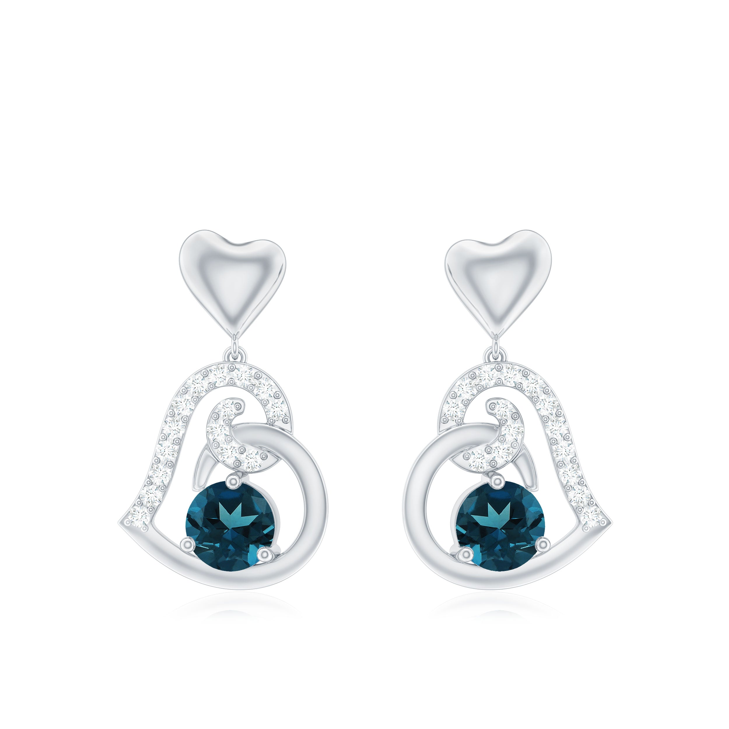 Make a stunning impression with these heart-shaped drop earrings. Adorned with round-shaped London Blue Topaz and Diamond, these earrings will add a touch of elegance to any outfit. The London Blue Topaz adds a beautiful, vibrant color to the design, making it a perfect choice for any occasion.