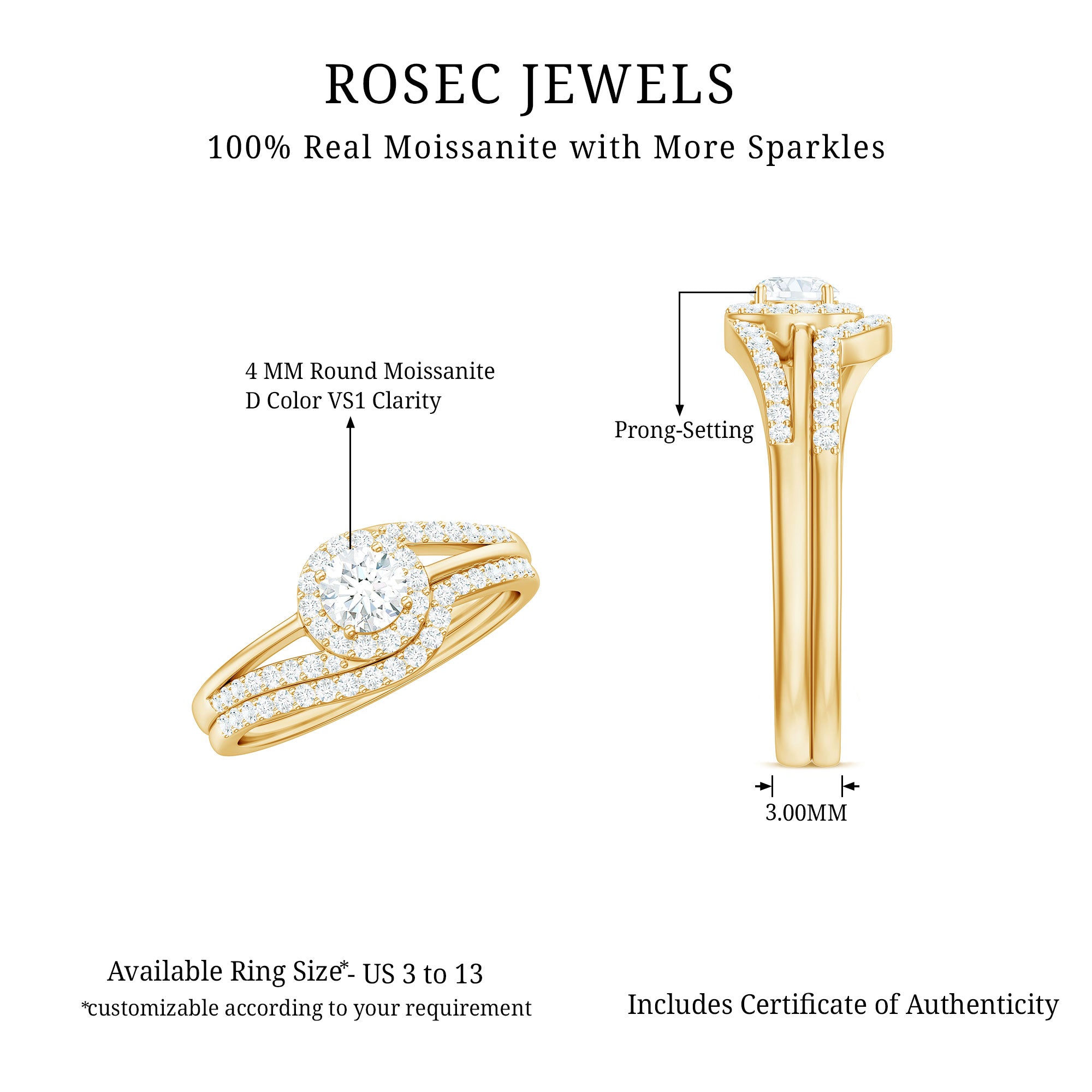 Romance and elegance come together beautifully in this Moissanite Bridal Ring Set. The set features a unique bypass engagement ring, designed to wrap gracefully around your finger. At its center sits a 4 MM round brilliant cut moissanite, sparkling brightly in secure prong setting. A halo of smaller round moissanite stones surrounds the center stone, adding extra shine and glamour. The bypass band itself is also decorated with moissanite stones, creating a seamless and dazzling look. A matching curved wedding band completes the Moissanite Engagement Ring Set, designed to hug the ring perfectly. Together, they form a Stackable Wedding Ring Set that looks elegant whether worn alone or paired with other rings. Crafted with careful attention to detail, this Engagement Ring and Wedding Band Set combines modern design with timeless charm. Comfortable to wear and designed to last, the rings are ideal for everyday elegance as well as formal occasions. Every angle of the Halo Bridal Set reflects light beautifully, creating a brilliant shine that will be noticed wherever you go.