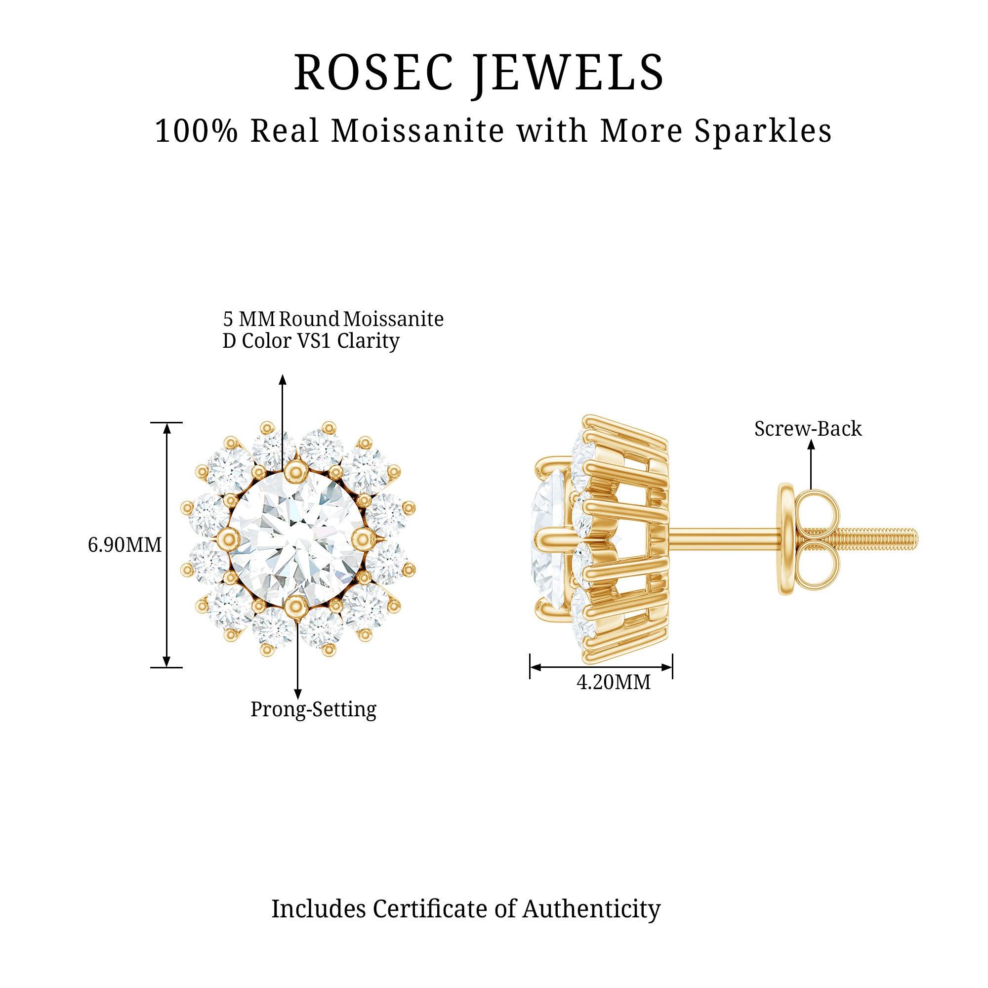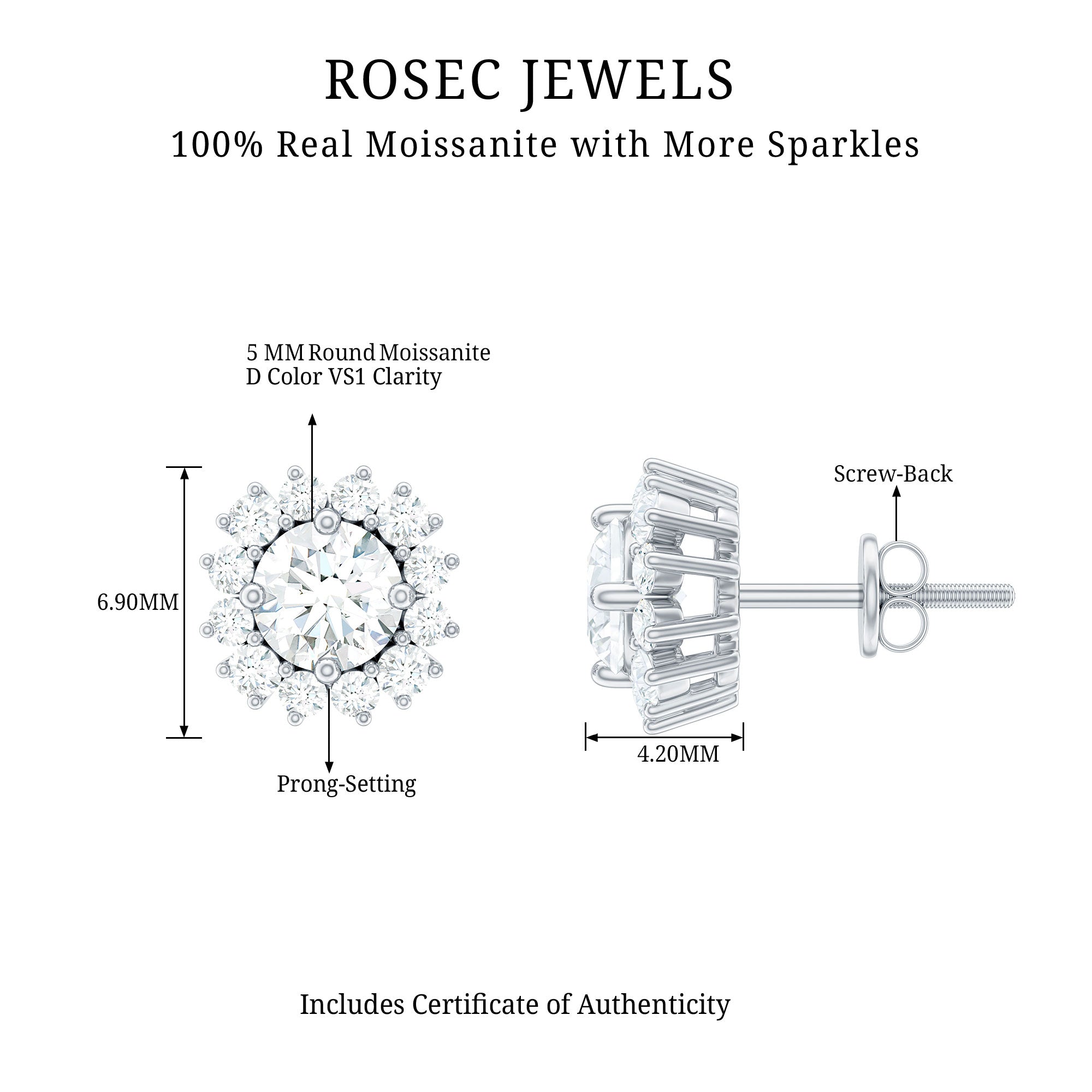 Elegant and sparkling stud earrings featuring a round shape Moissanite solitaire with a halo of tiny Moissanites. Perfect for parties and special occasions.