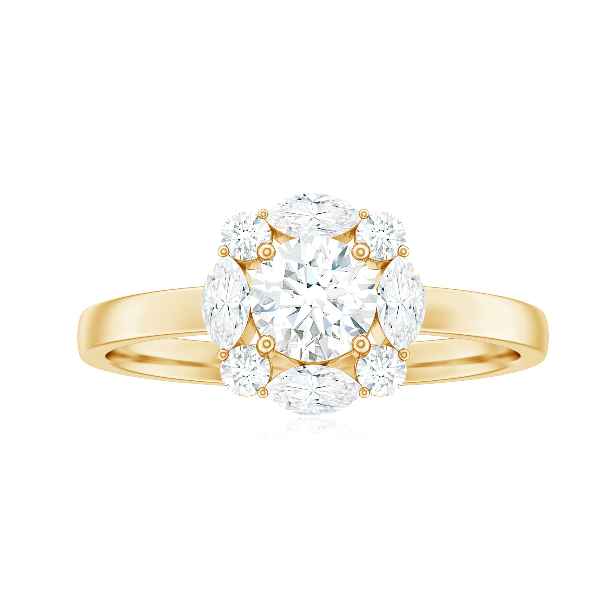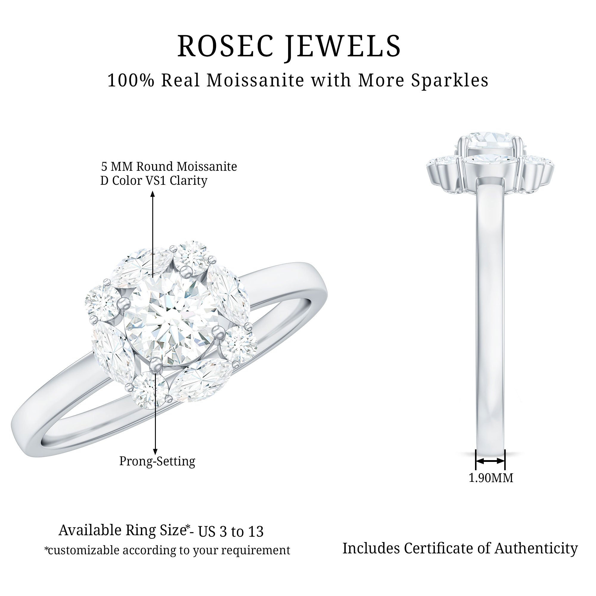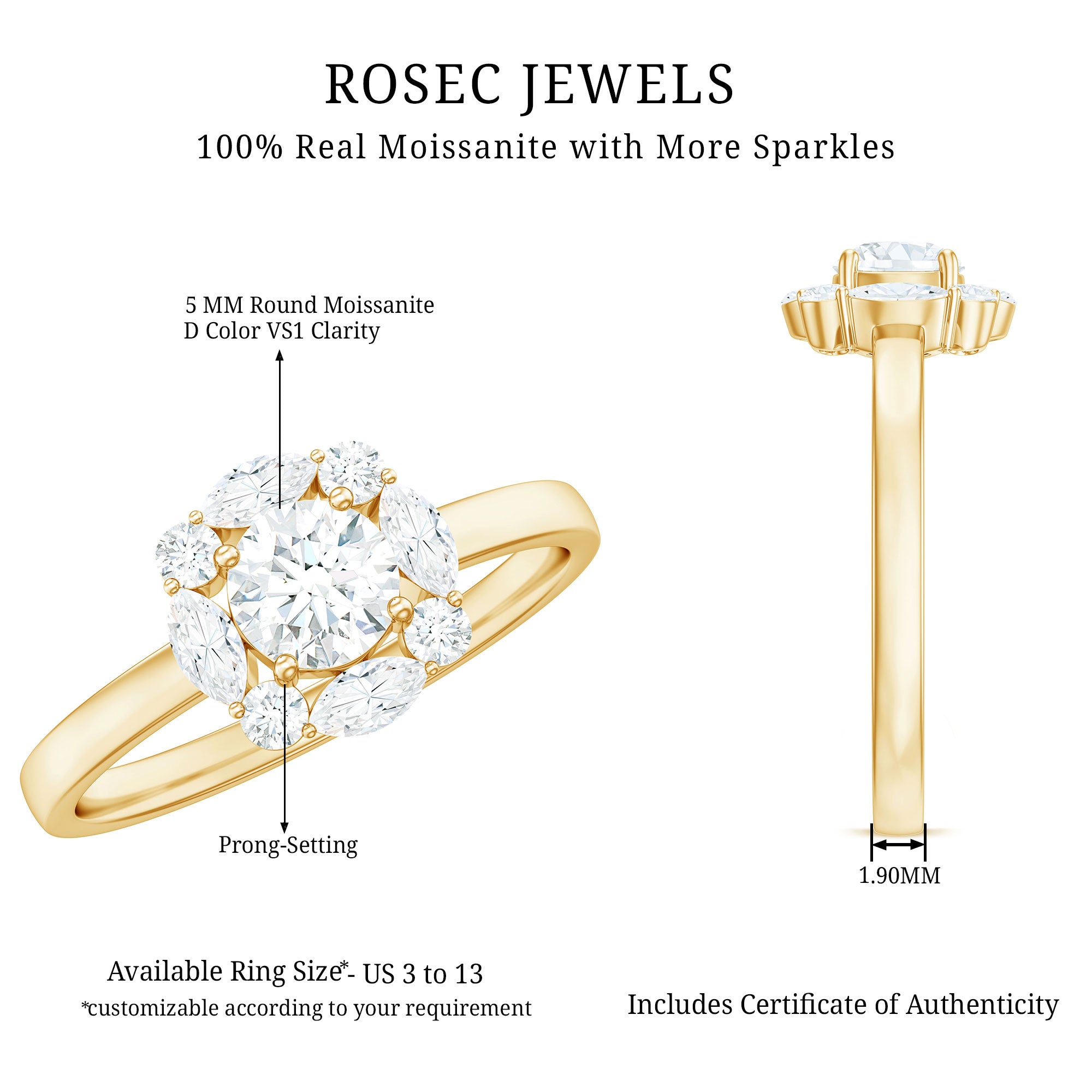 Begin your love story with this Moissanite Engagement Ring, thoughtfully designed to reflect the beauty and strength of your bond. At the center is a brilliant 5 MM round cut moissanite, set securely in prongs that let it shine from every angle. Surrounding the center stone is a halo of marquise and round moissanite stones that enhance the sparkle and add a romantic touch. The unique mix of cuts gives the Halo Engagement Ring a timeless charm, while still feeling fresh and eye-catching. The band is sleek and simple, allowing the center design to stand out while ensuring a comfortable fit for everyday wear. Crafted with care, this Round Moissanite Ring combines traditional beauty with modern values, using moissanite, an eco-friendly gemstone that shines just like a diamond. This Round Engagement Ring is perfect for those who love classic styles with a twist of uniqueness. It is a piece meant to be treasured, worn daily, and admired for years to come. Available in US ring sizes 3 to 13, it is designed to fit perfectly and feel just right. Your ring will arrive in a luxury jewelry box, ready to mark one of life’s most special moments. Let this Moissanite Halo Ring be a shining reminder of love, promise, and the forever you are building together.