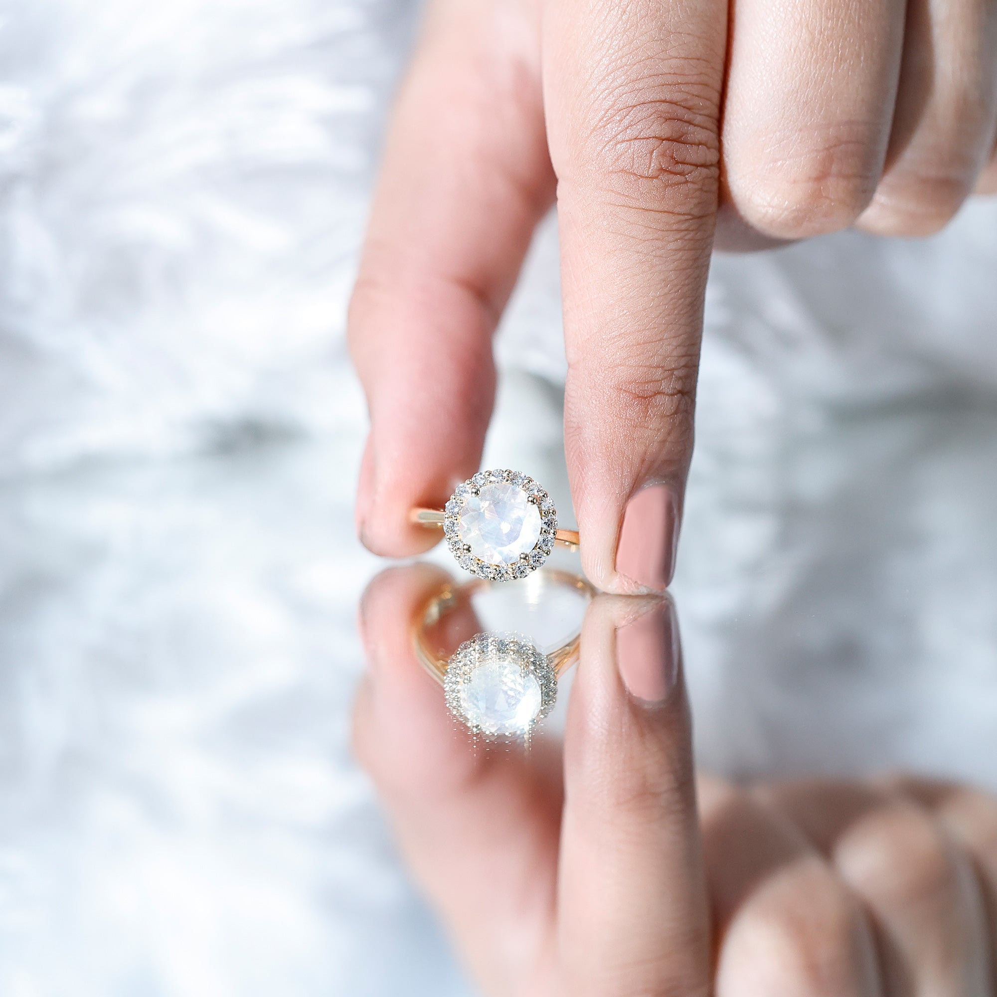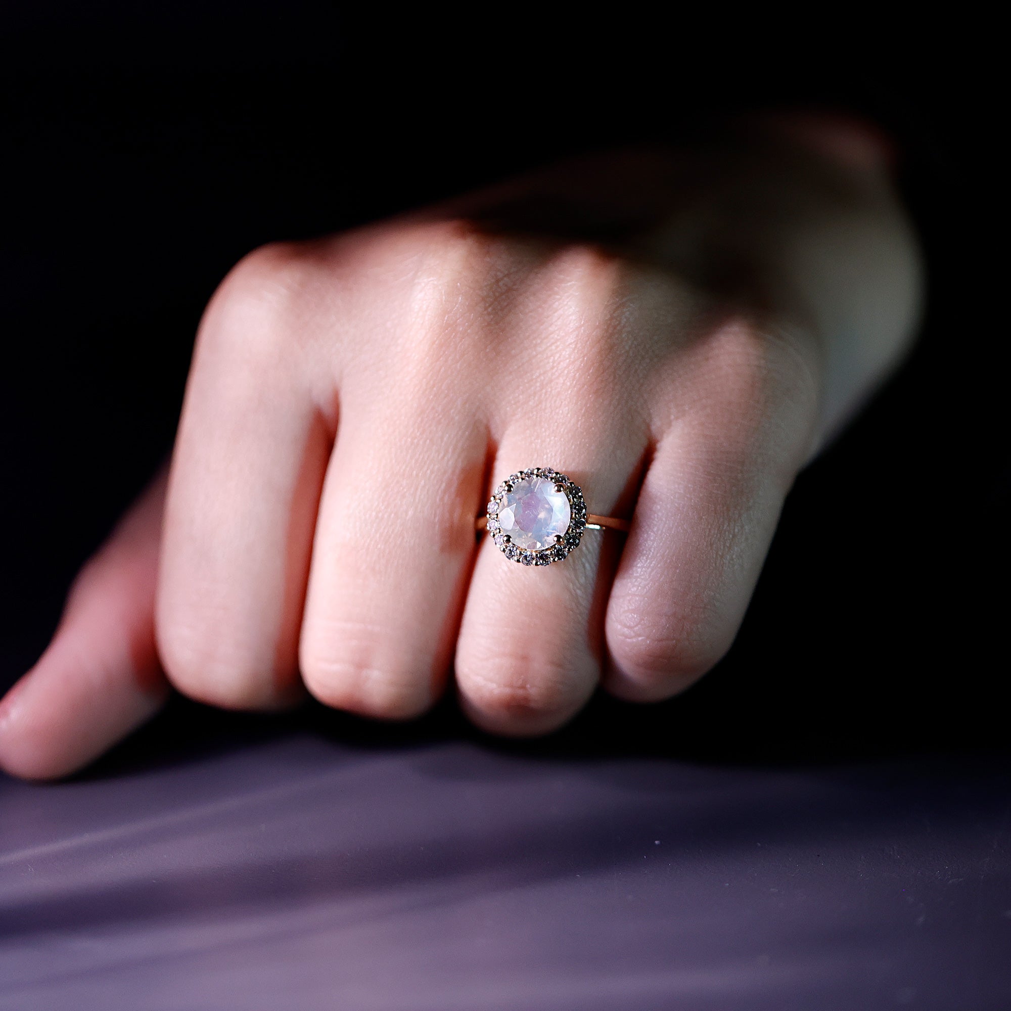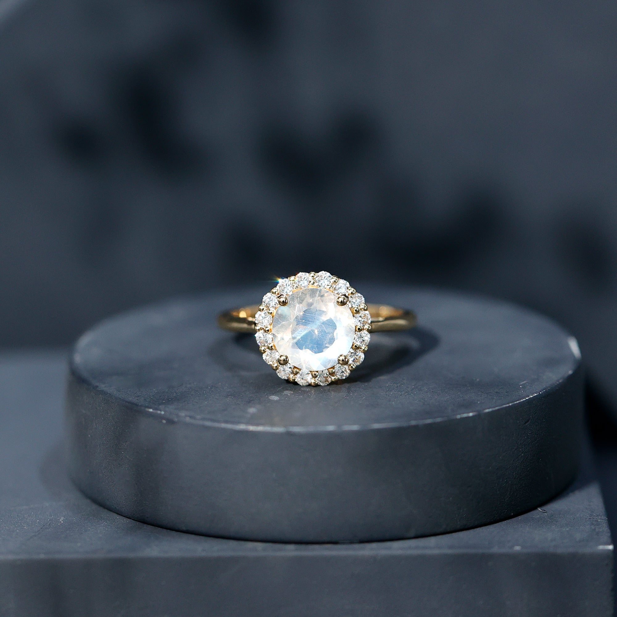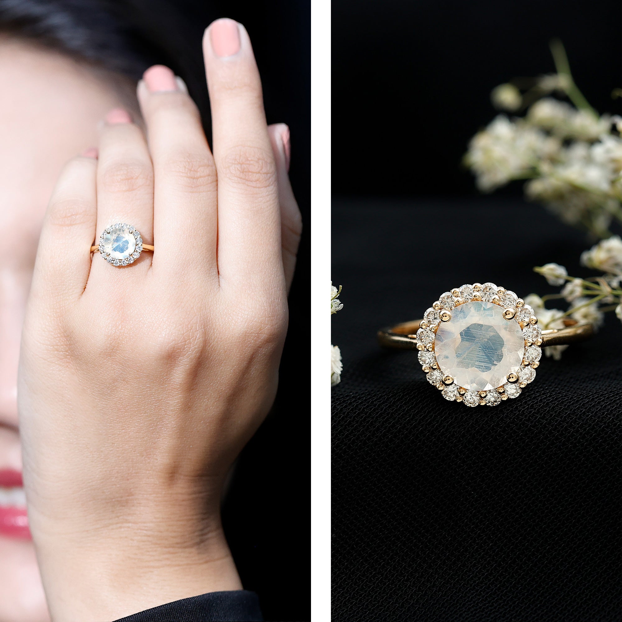 Indulge her in royalty with this sophisticated Moonstone Engagement Ring. The ring features a Round Shape moonstone center in a Halo, elegantly crafted in solid gold. It has a total weight of 1.25 carats, with AAA quality gems that are certified and thoroughly inspected for quality. Make her feel special with this stunning Moonstone Engagement Ring.