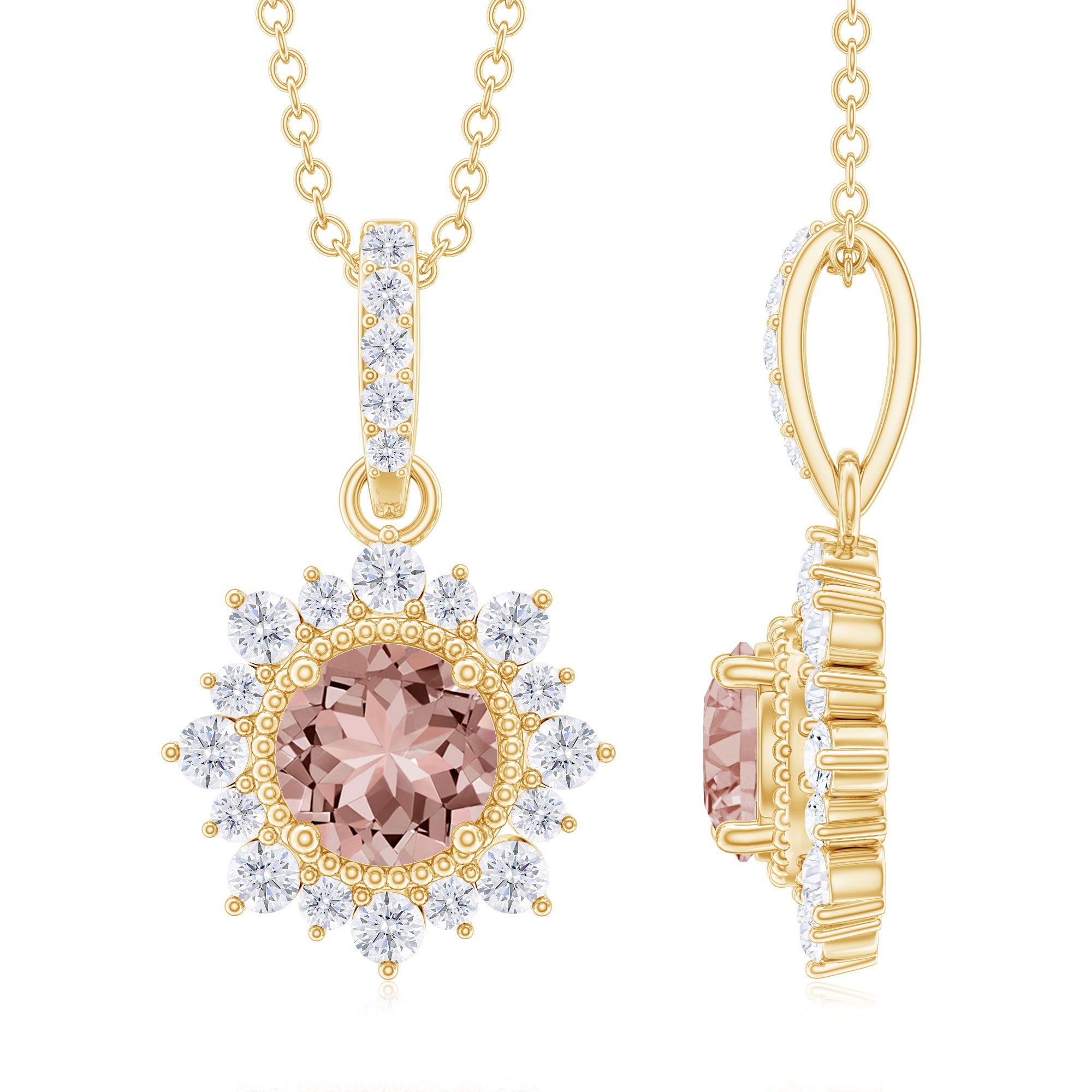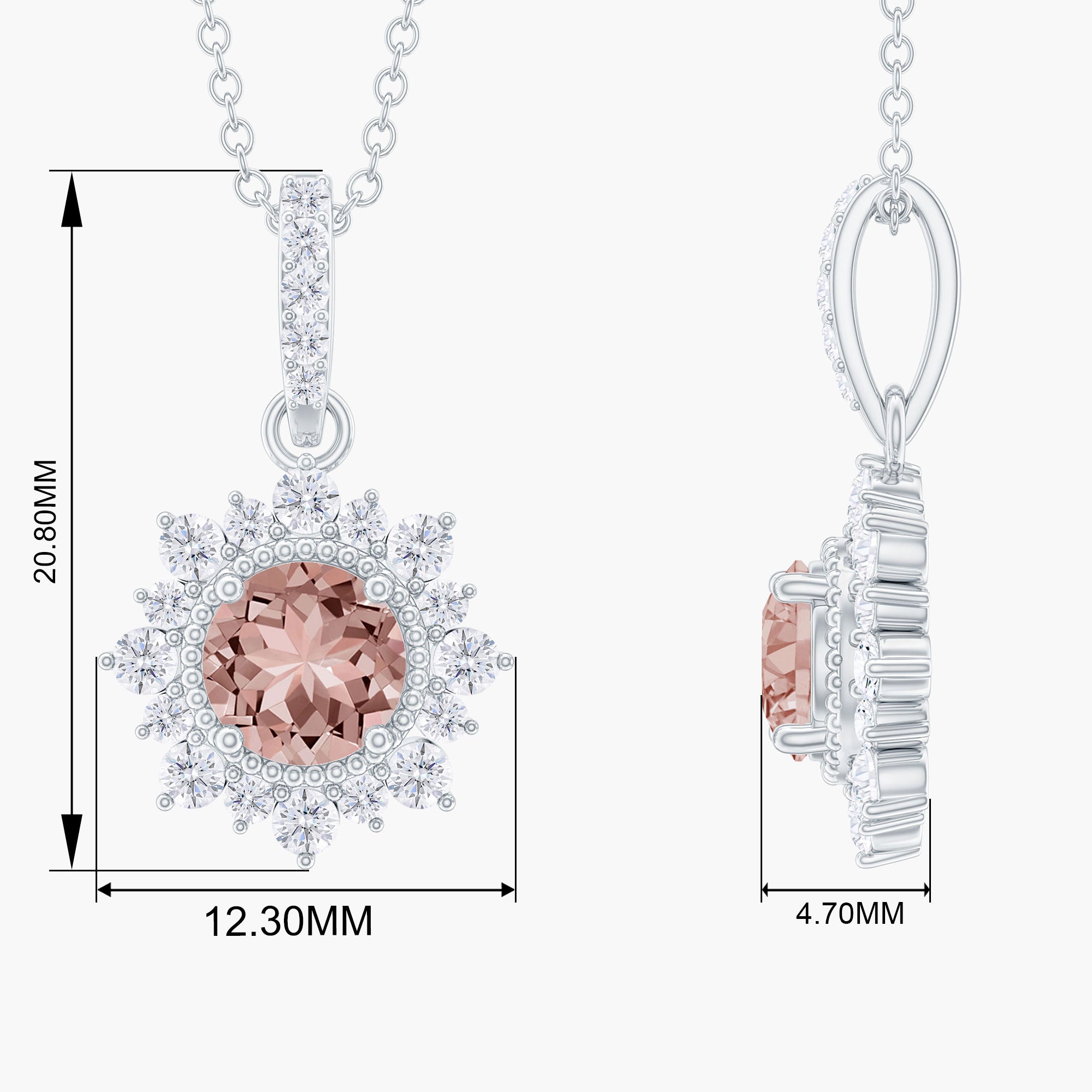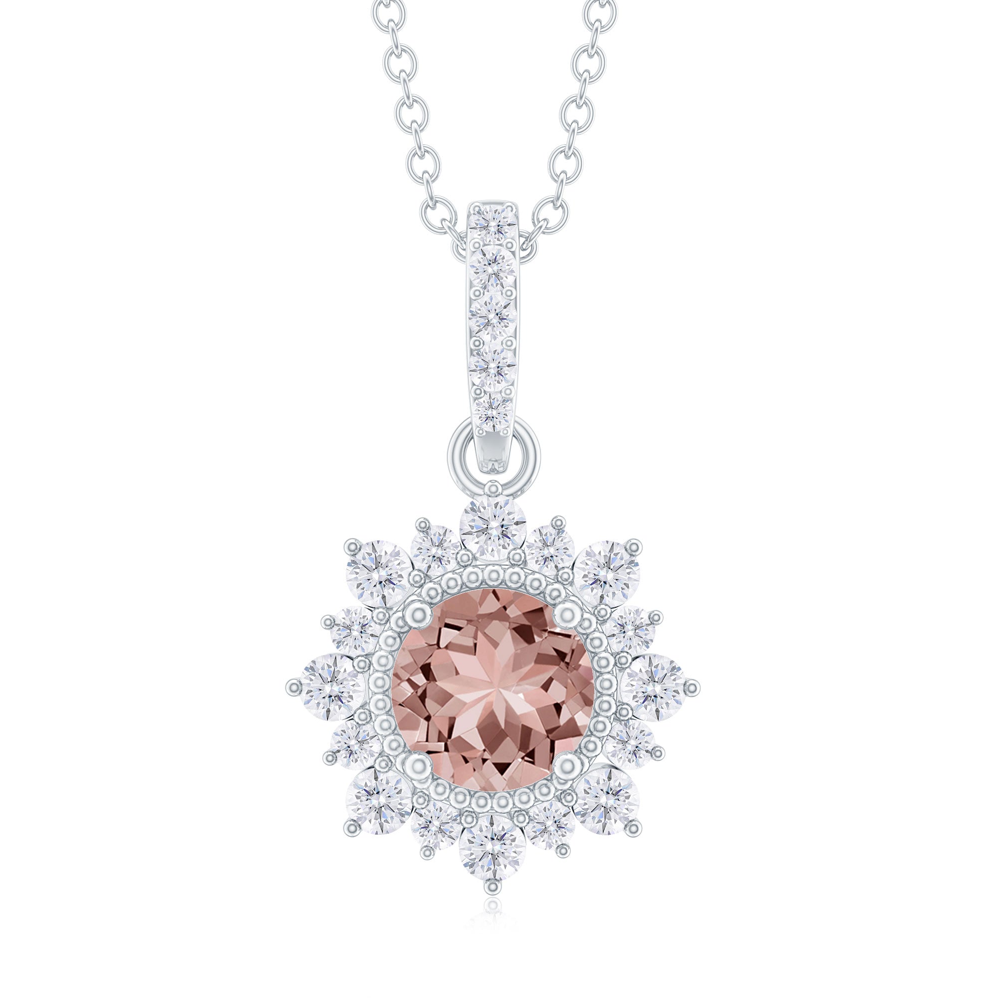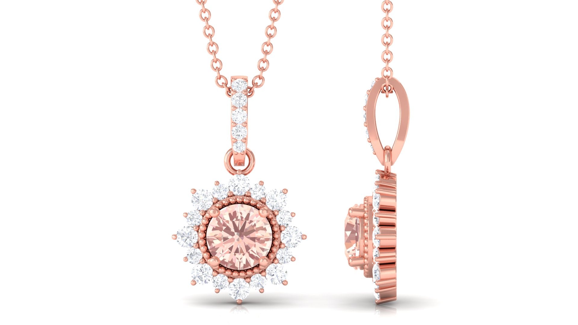 Level up your fashion game by donning this Halo Pendant Necklace embedded with Round Shape Morganite in 4 Prong Setting and Round Shape Diamonds studded as Halo and on the bail of the pendant. This Morganite Pendant has been crafted with Solid Metal and could easily match your most stylish outfits for you to look breathtakingly stunning, making it a perfect birthday present.