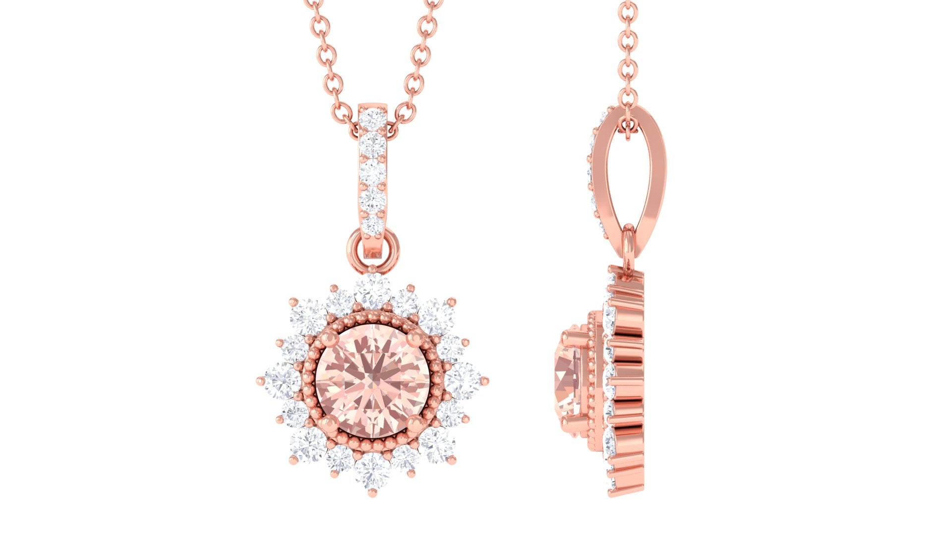 Level up your fashion game by donning this Halo Pendant Necklace embedded with Round Shape Morganite in 4 Prong Setting and Round Shape Diamonds studded as Halo and on the bail of the pendant. This Morganite Pendant has been crafted with Solid Metal and could easily match your most stylish outfits for you to look breathtakingly stunning, making it a perfect birthday present.