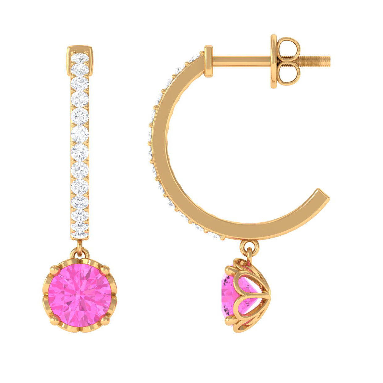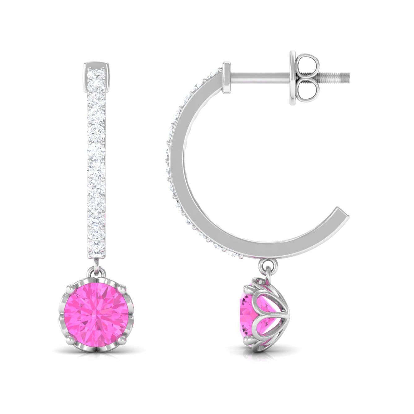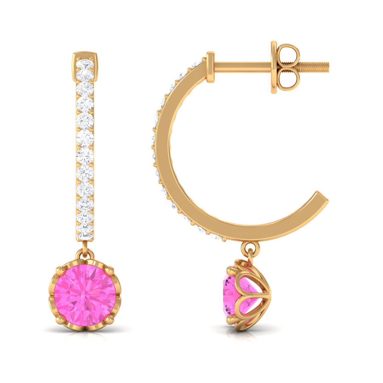 Choose something truly extraordinary with these stunning Pink Sapphire Drop Earrings. They showcase Round Pink Sapphire drops securely placed in a Prong Setting and feature a hoop adorned with sparkling round Diamond stones set in a Pave Setting. These hoop earrings add an element of elegance and allure to your appearance, allowing you to shine effortlessly without requiring extra accessories. Additionally, they come with a secure screw back closure for added comfort.