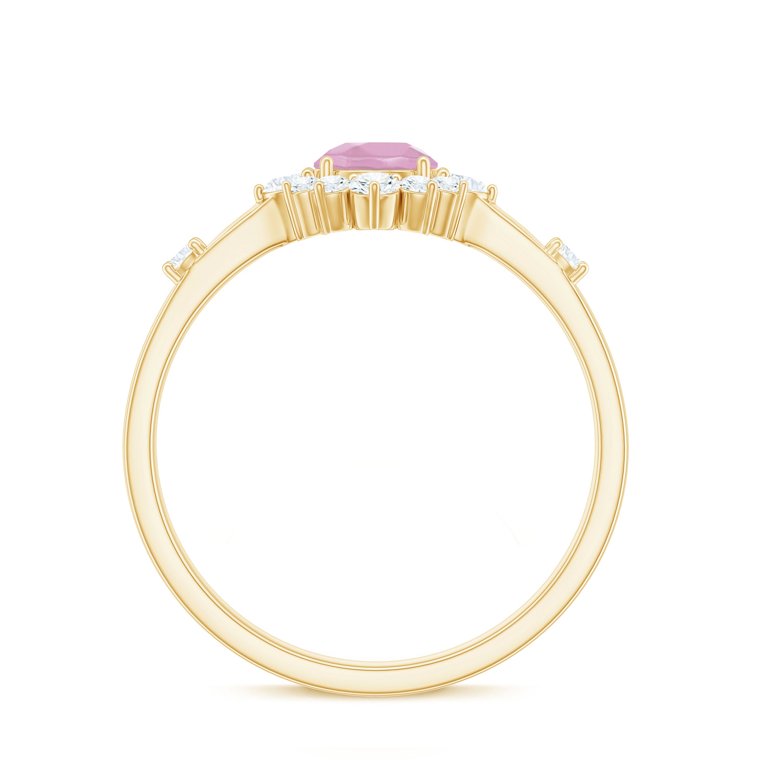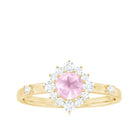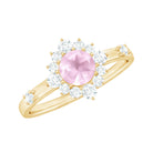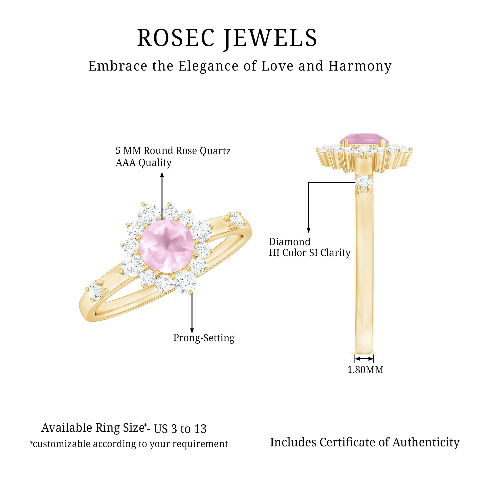 Add a touch of elegance to your attire with this charming Rose Quartz Ring, crafted from solid gold. The Engagement ring features a Round Shape Rose Quartz set in a Halo style, surrounded by Diamond stones to create a captivating appeal. This classic gold ring with its stunning design is the perfect accessory to complement any outfit.