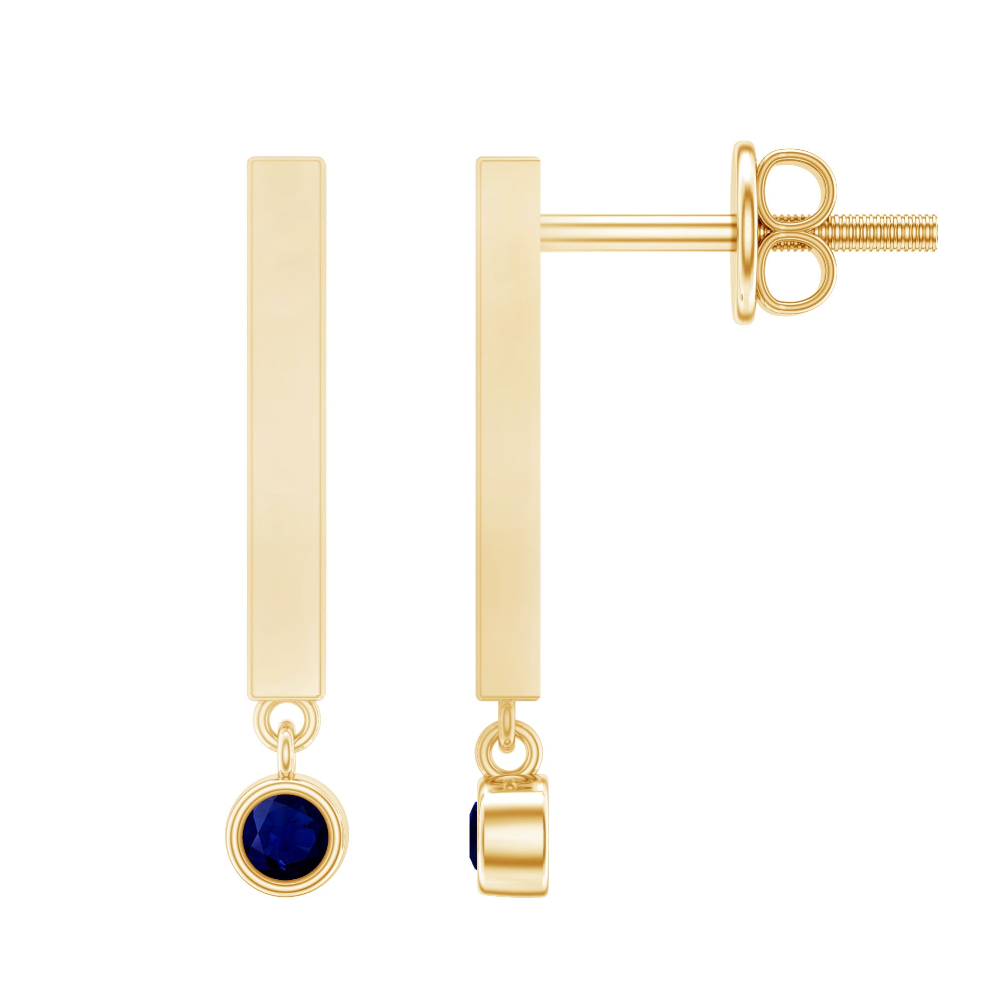 As unique as you these Gold Bar Drop Earrings with a Round Shape Blue Sapphire in a Bezel Setting, these will enhance your style and set you apart from the crowd.