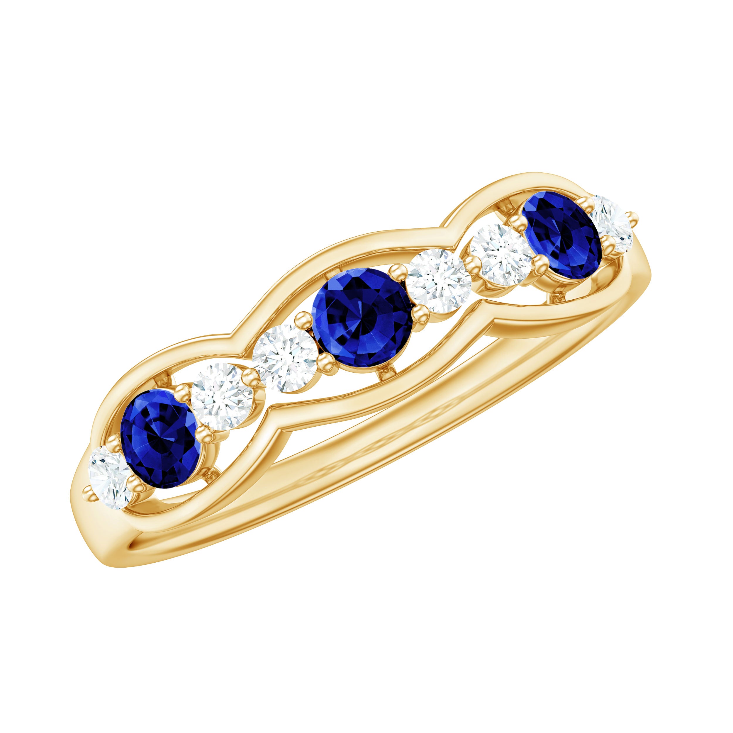 Round Shape Certified Created Blue Sapphire and Diamond Anniversary Ring