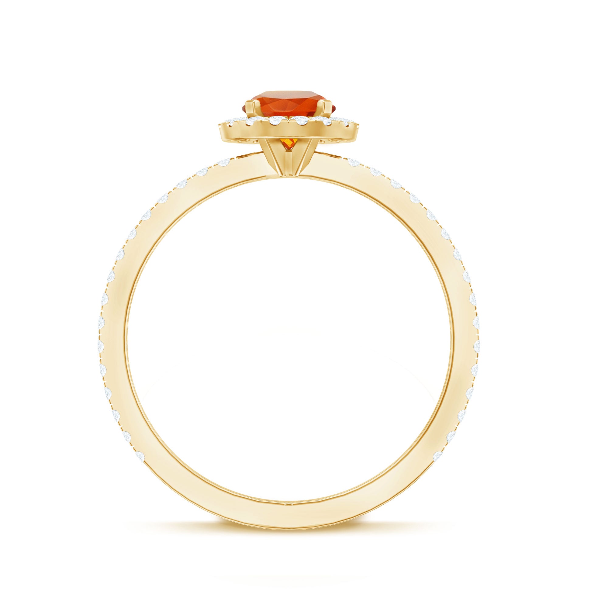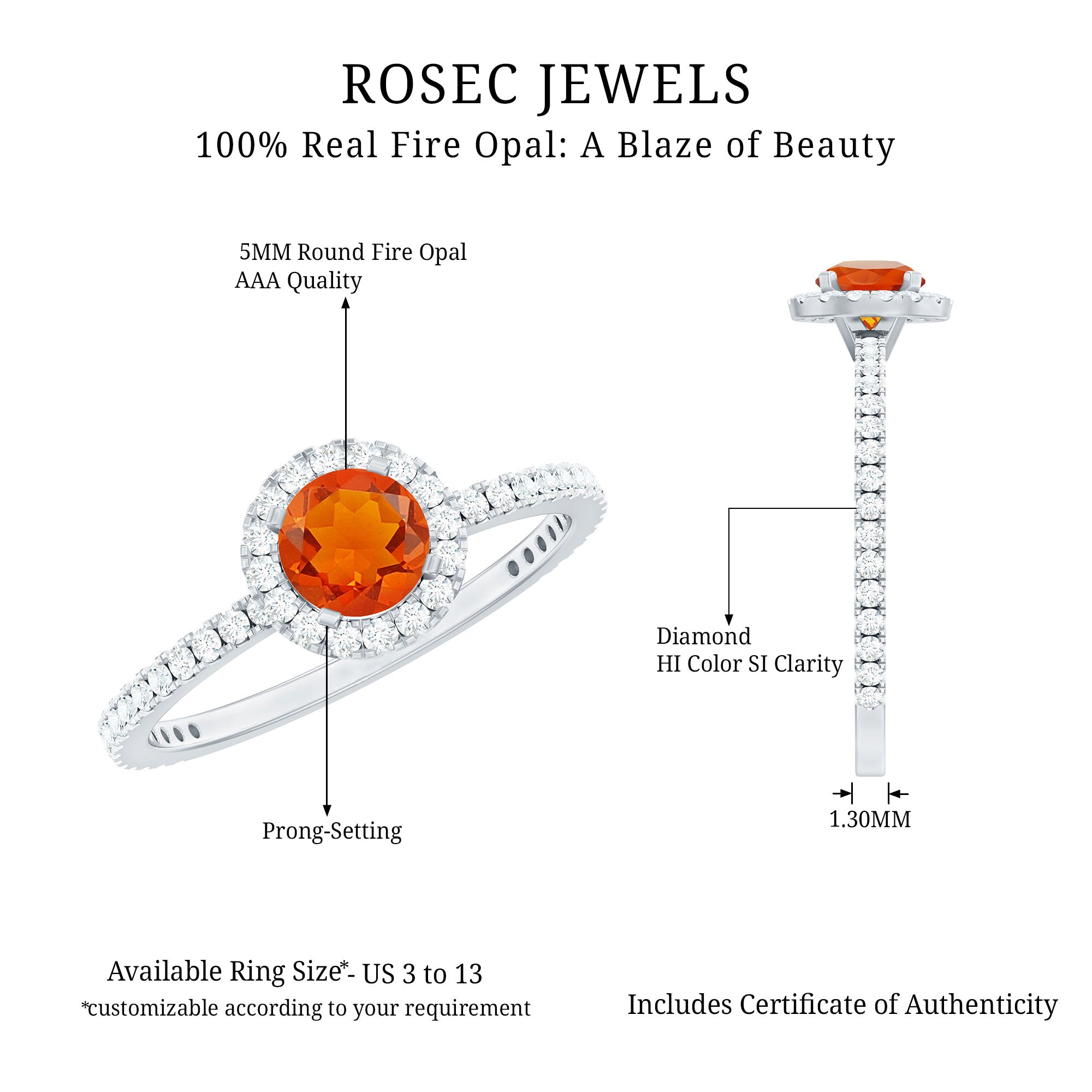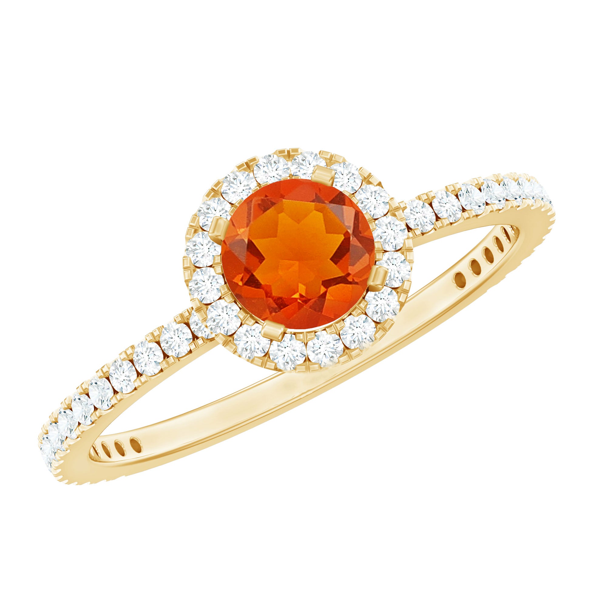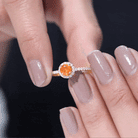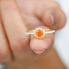 Make your special day more memorable with this stunning engagement ring that features a round shape fire opal center stone, beautifully surrounded by a halo of sparkling Diamond stones. The fiery orange-red hue of the opal is truly captivating, symbolizing passion and desire. The halo of Diamond stones adds a touch of sparkle and elegance, creating a beautiful contrast against the rich opal. The band is also studded with similar Diamond stones. This ring is the perfect choice for those who want a unique and vibrant engagement ring that is sure to make a statement. It is a true symbol of love and commitment.