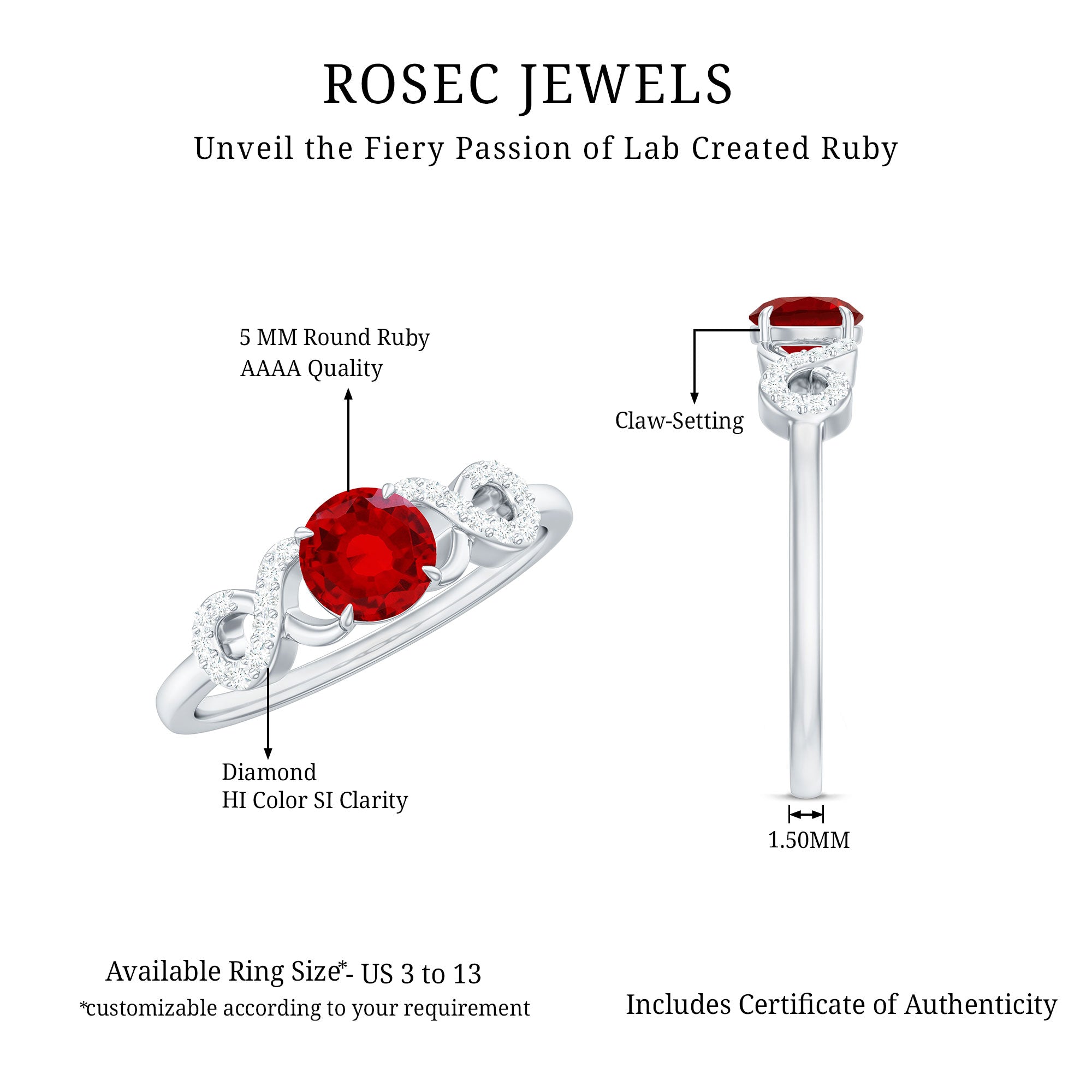 Indulge in the exquisite beauty of this Infinity Ring adorned with a Round Shape Created Ruby set as a solitaire with Diamond gemstones. The infinity symbol represents never ending affection, making this piece a heartfelt declaration of your lasting bond.