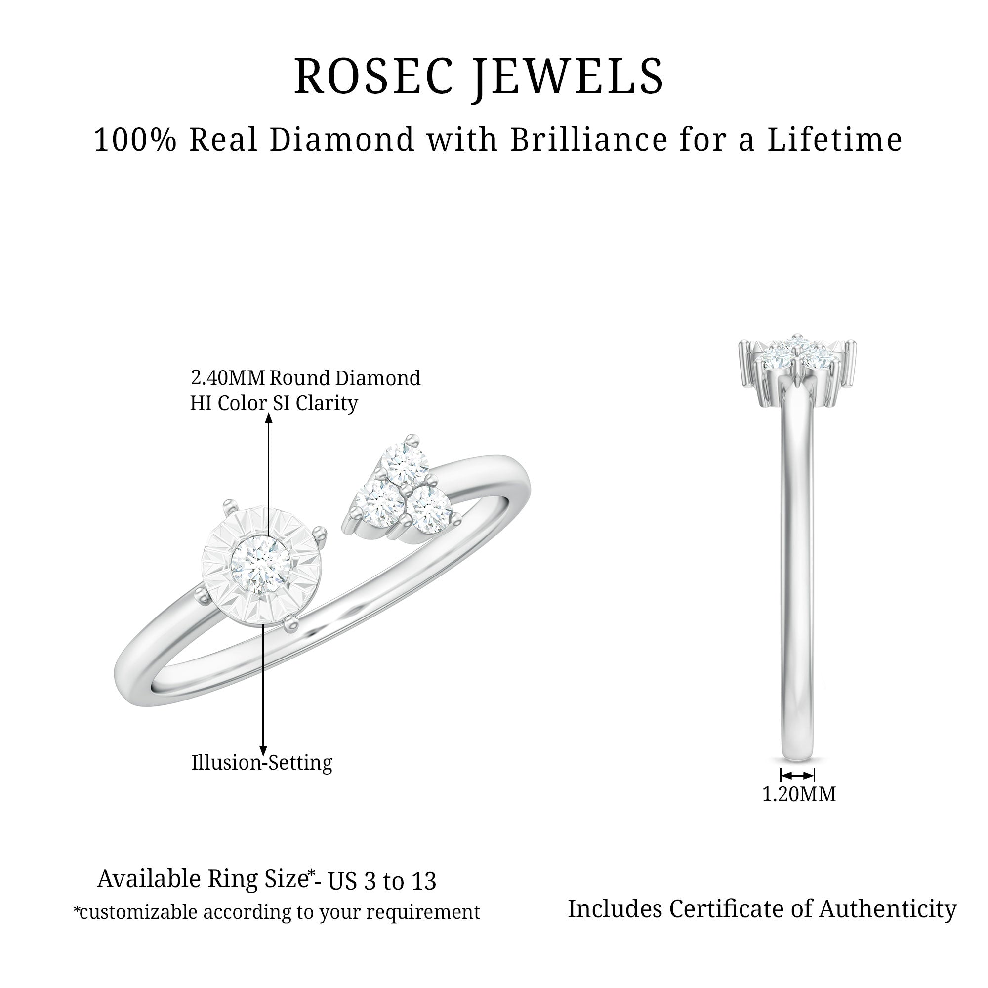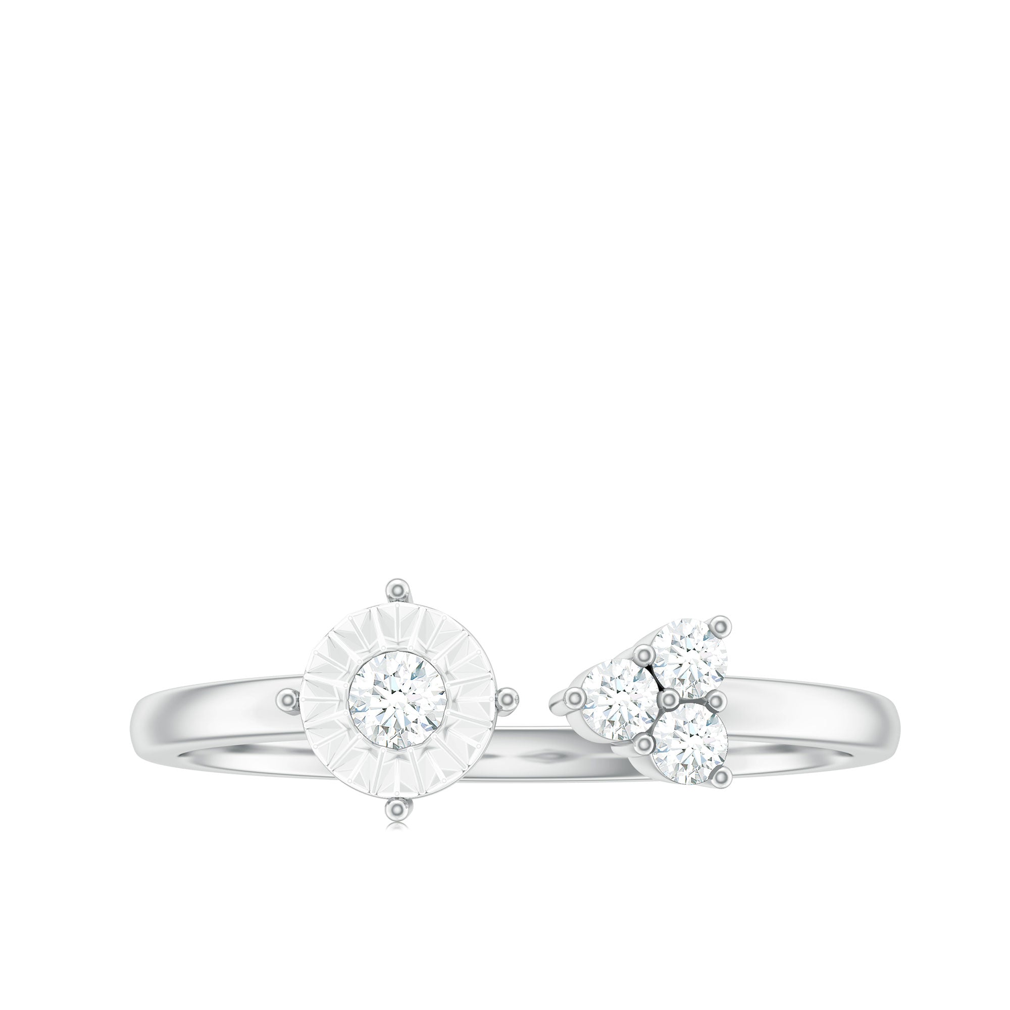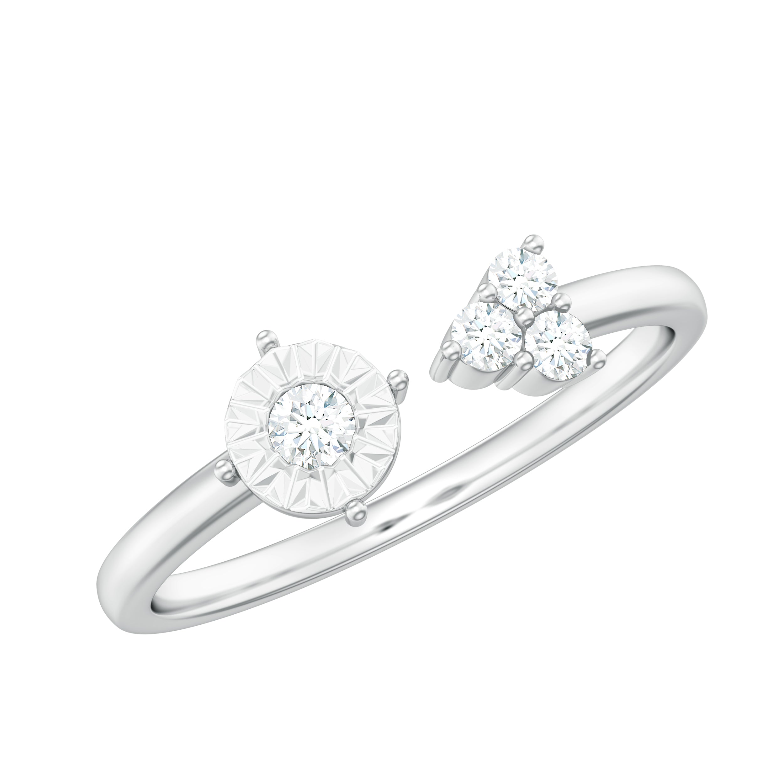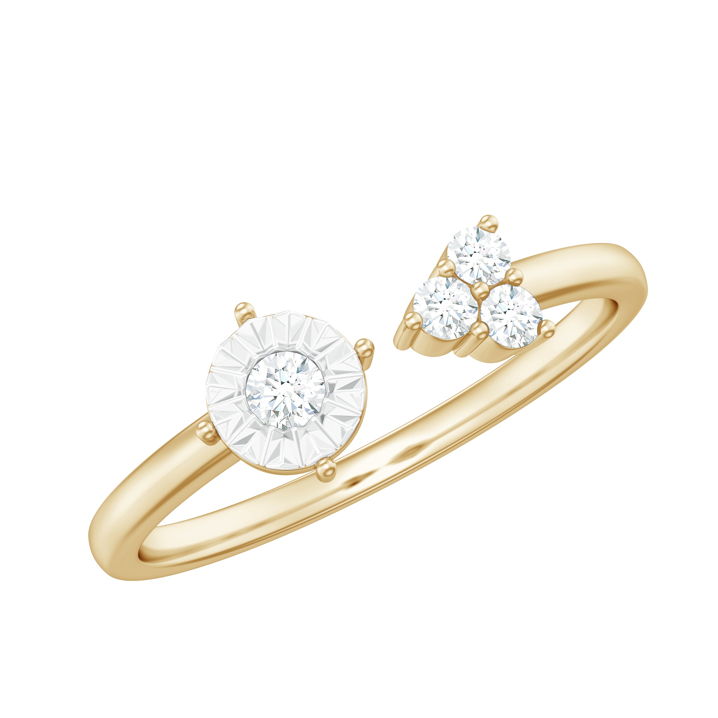 Make a bold fashion statement with the Miracle Plate Diamond Cuff Ring. This ring features a Round Cut Diamond surrounded by a Miracle Plate on one end, and three diamonds on the other, making it a stylish and refined piece. Ideal for Aries Zodiac Women, this Solid Gold Ring is a must-have for those who love to flaunt their fine taste.