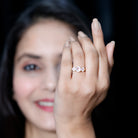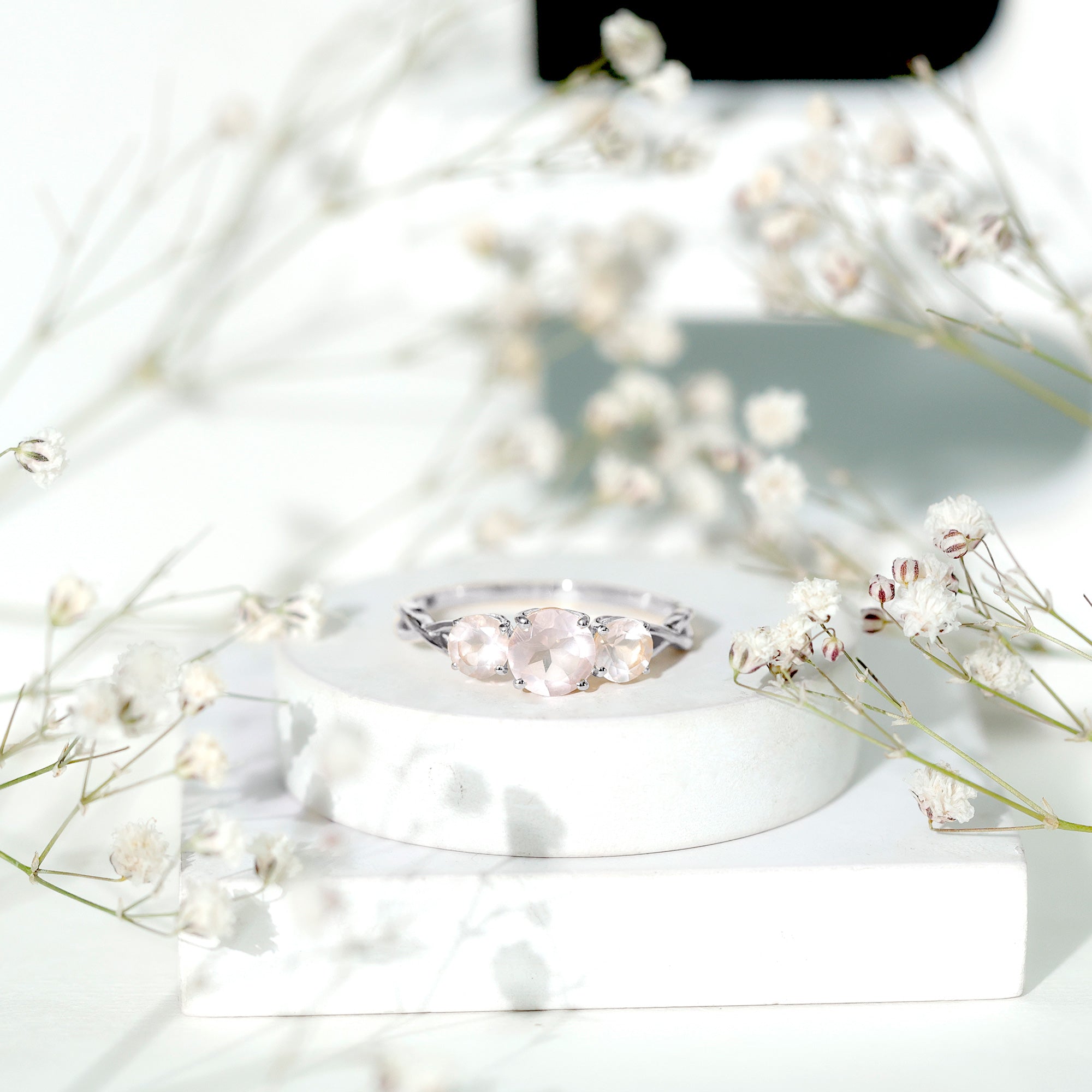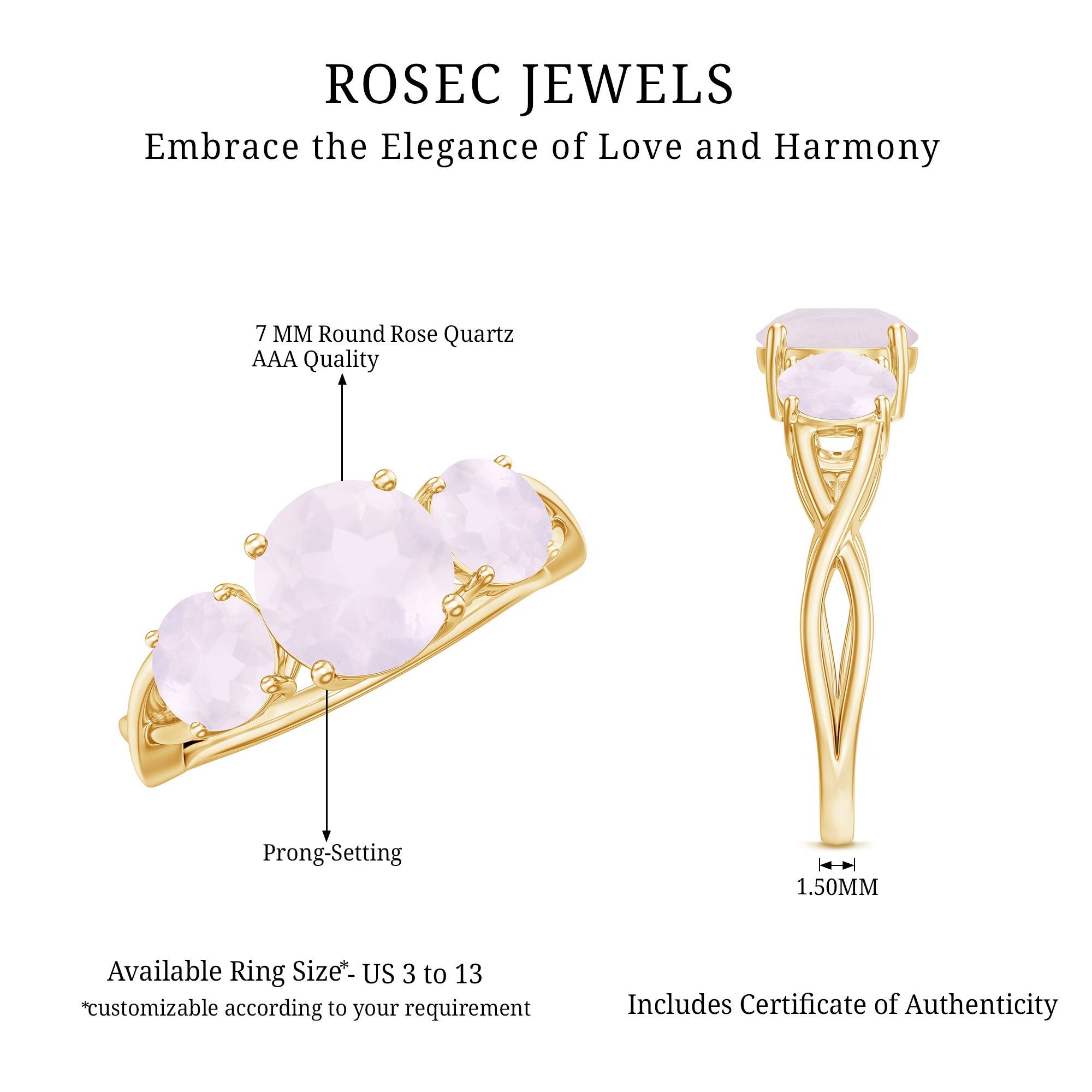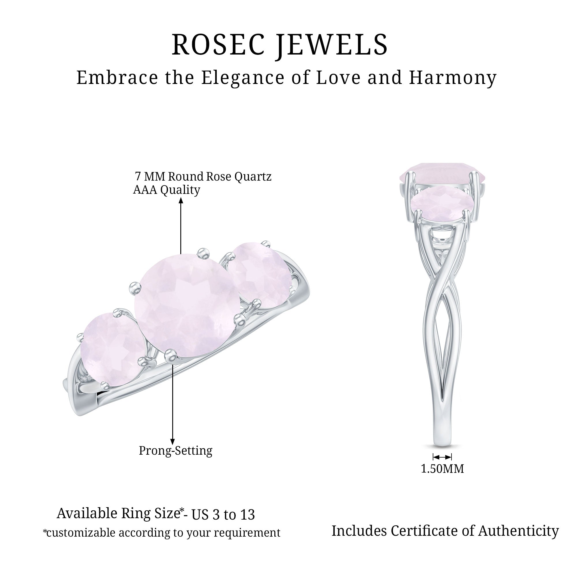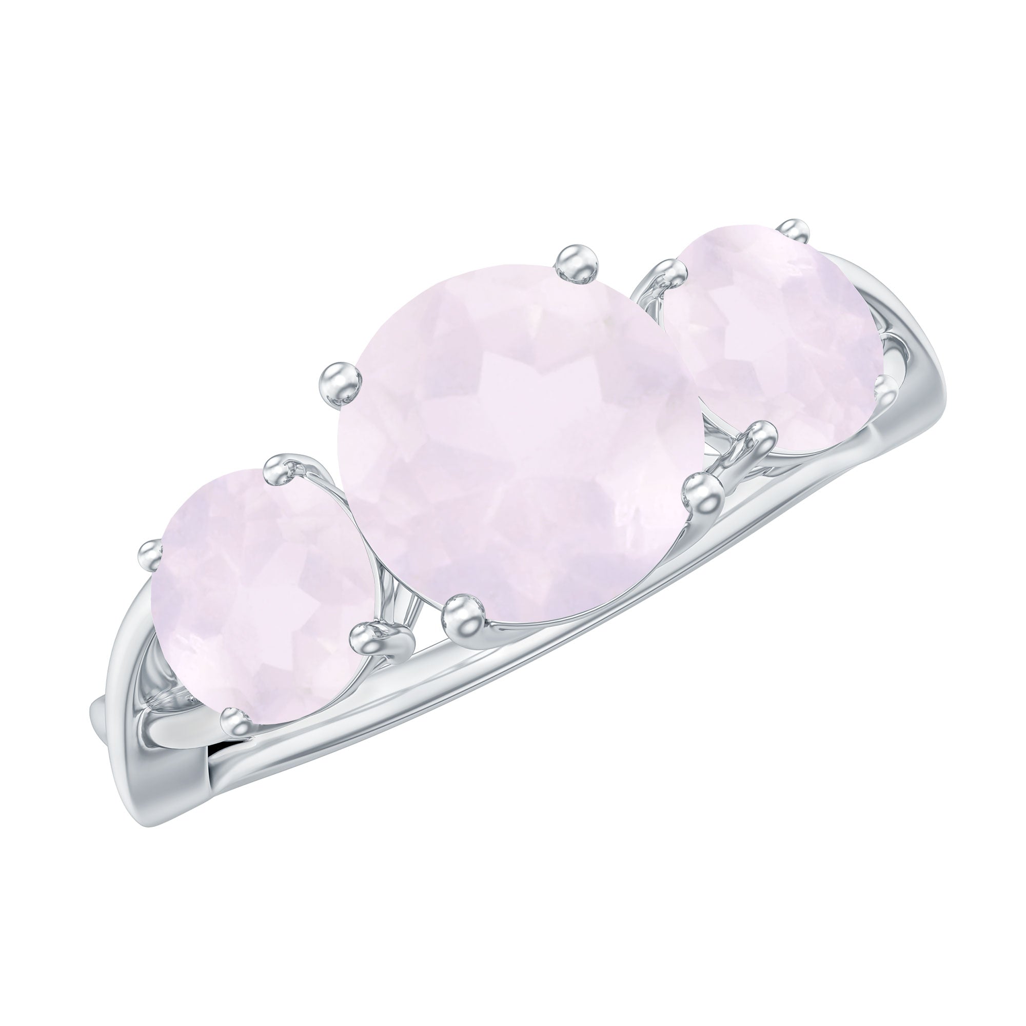 Mark a cherished moment by presenting your beloved with this exquisite Three Stone Ring, featuring a Round Rose Quartz elegantly nestled in a prong setting. Available in different metal choices, this Anniversary Ring for Women boasts a Crossover Shank design, reigniting the flames of affection and making her heart resonate with love once more.