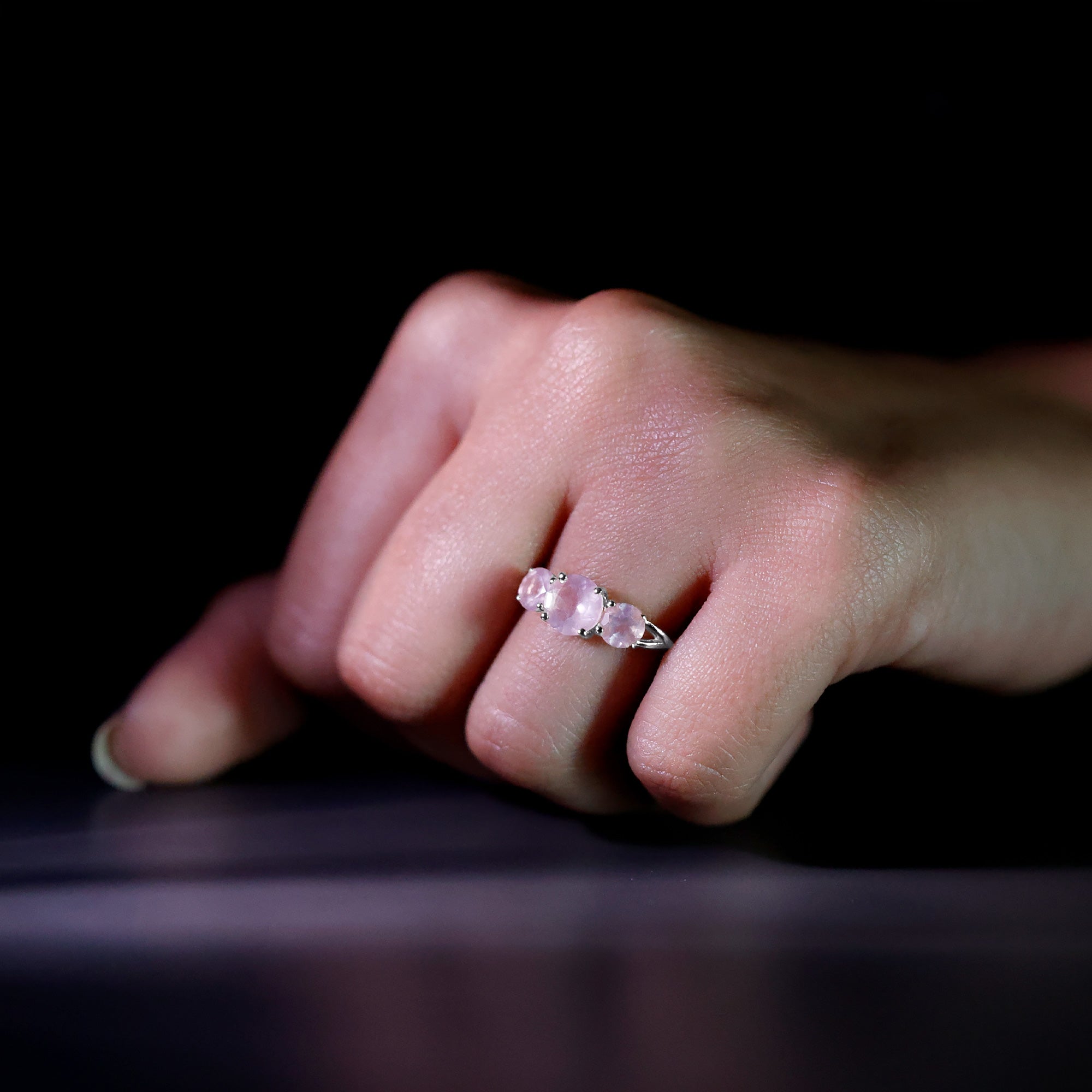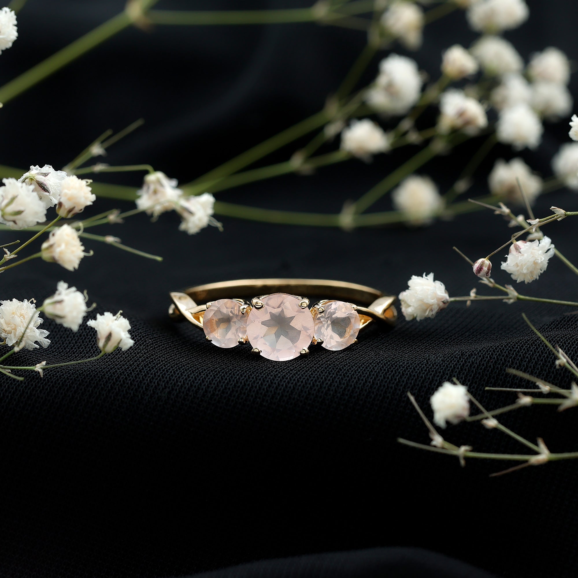 Round Shape Rose Quartz Three Stone Crossover Ring