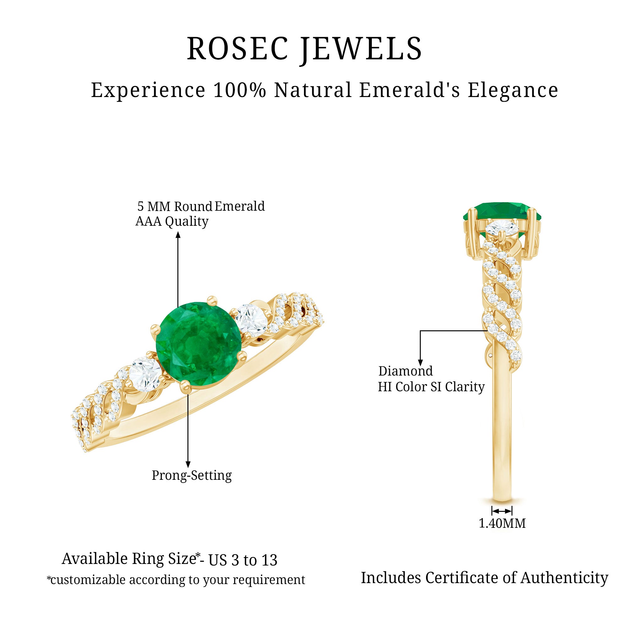Embrace the magic of timeless romance with this breathtaking Emerald Engagement Ring, a creation that captures the soul of everlasting love. At its center lies a vivid 5 mm Round Shape Emerald gemstone set in 4 Prong Setting, radiating with a lush green hue. The exquisite band with a unique design, gracefully adorned with sparkling Diamond stones, adds a touch of elegance. The contrast between the deep, enchanting green of the AAA Quality Emerald and the dazzling shimmer of the HI-SI Diamond stones creates a harmony that feels both regal and romantic. Every curve and detail of this Emerald Diamond Ring is thoughtfully crafted to celebrate the rare beauty of love, making it a treasure that will be adored for generations. Presented in a luxurious jewelry box and available in a variety of sizes, this Emerald Solitaire Engagement Ring is the perfect expression of your eternal bond. Whether you are proposing to the love of your life or commemorating a milestone, this Real Emerald Engagement Ring is as unforgettable as the love it represents.