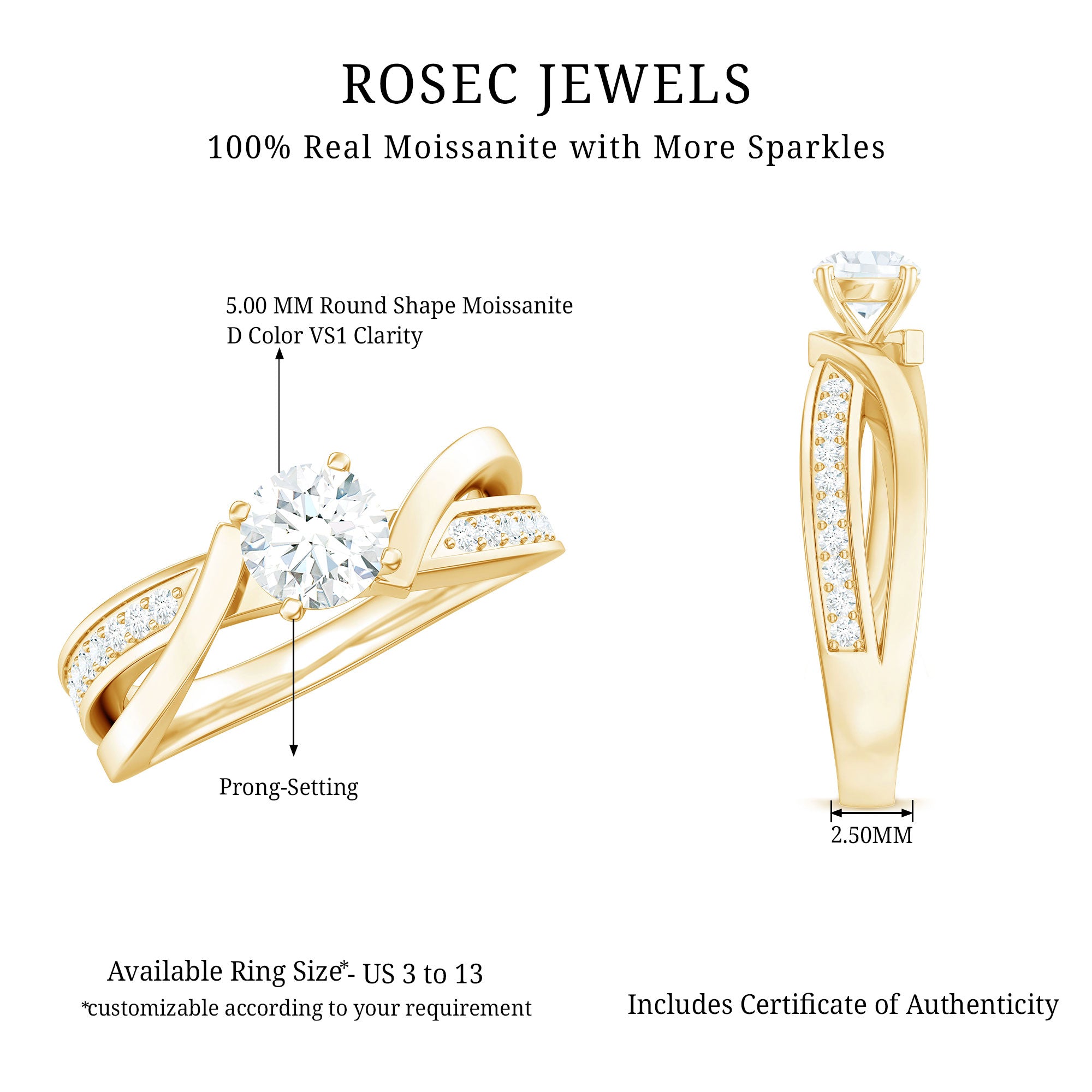 Transform every moment into an everlasting memory with this stunning Infinity Engagement Ring. Designed to honor eternal love, this gorgeous piece showcases a brilliant 5 MM round cut moissanite at its heart, securely nestled in prong setting. The band elegantly twists in a flowing infinity-inspired style, representing a connection that knows no bounds, two souls intertwined in everlasting harmony. Dazzling moissanite accents adorn the band, boosting its brilliance and providing just the right touch of sparkle from every perspective. Thoughtfully crafted for the modern heart, this Moissanite Engagement Ring fuses classic elegance with a contemporary twist. The D color and VS1 clarity of the moissanite stone reflect the purity of your promise and love story. Whether you are proposing on a special day or simply sharing your deepest feelings, this Solitaire Engagement Ring is a beautiful symbol of your unbreakable bond. Each ring is carefully handcrafted to ensure it shines as brightly as your future together. Perfect for anniversaries, engagements, birthdays, or any treasured occasion - this Moissanite Ring for Women is more than just jewelry, it is a lifelong reminder of love, commitment, and forever.