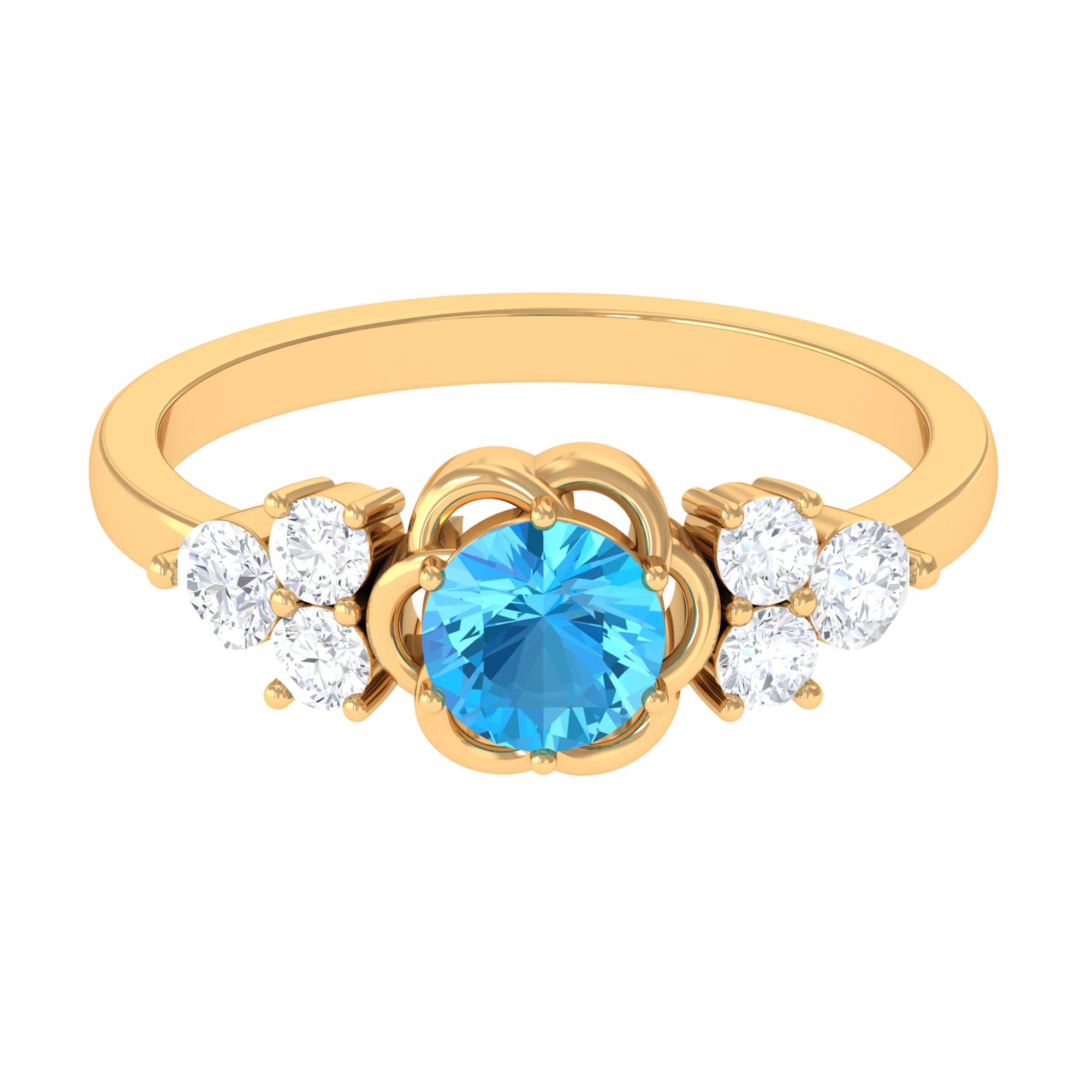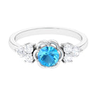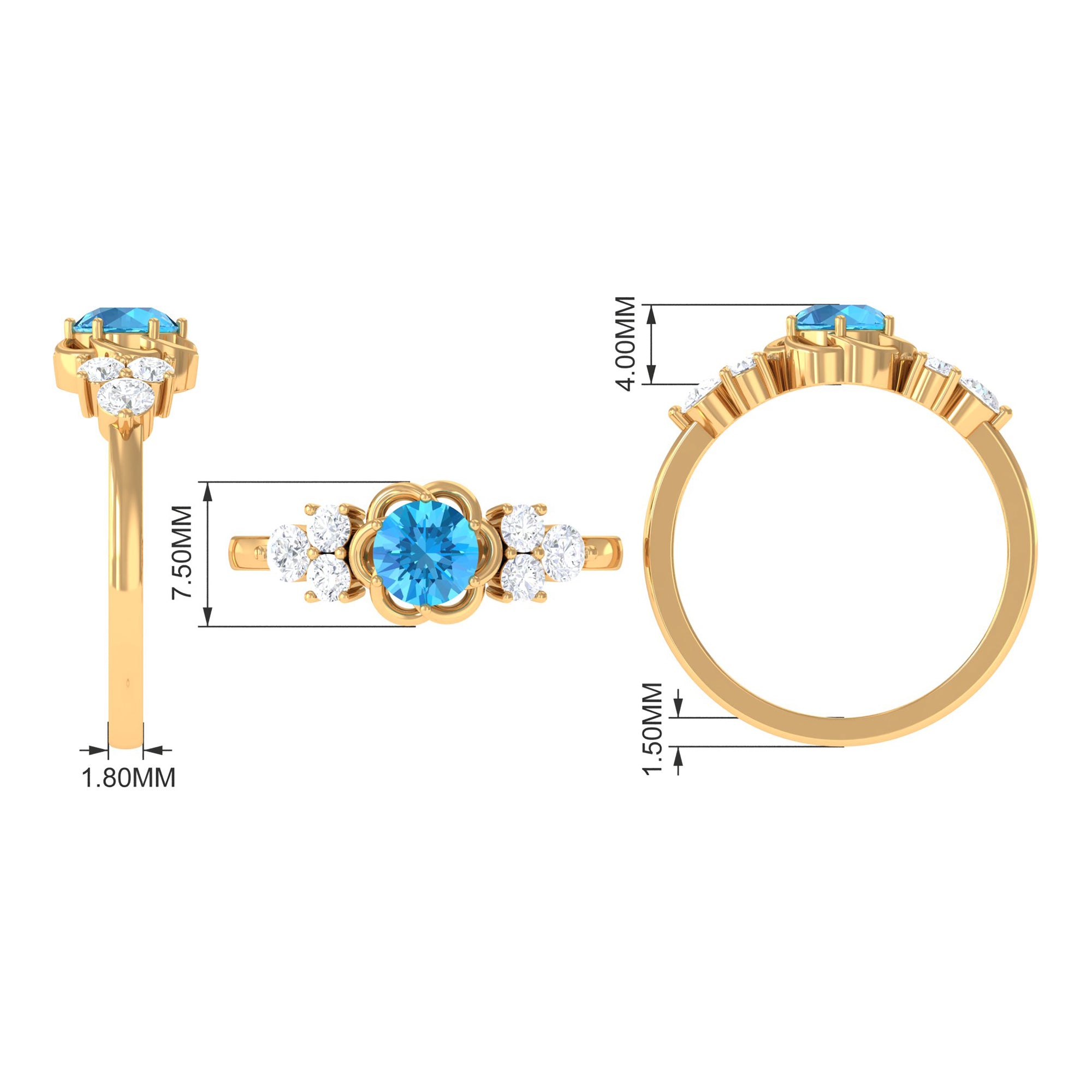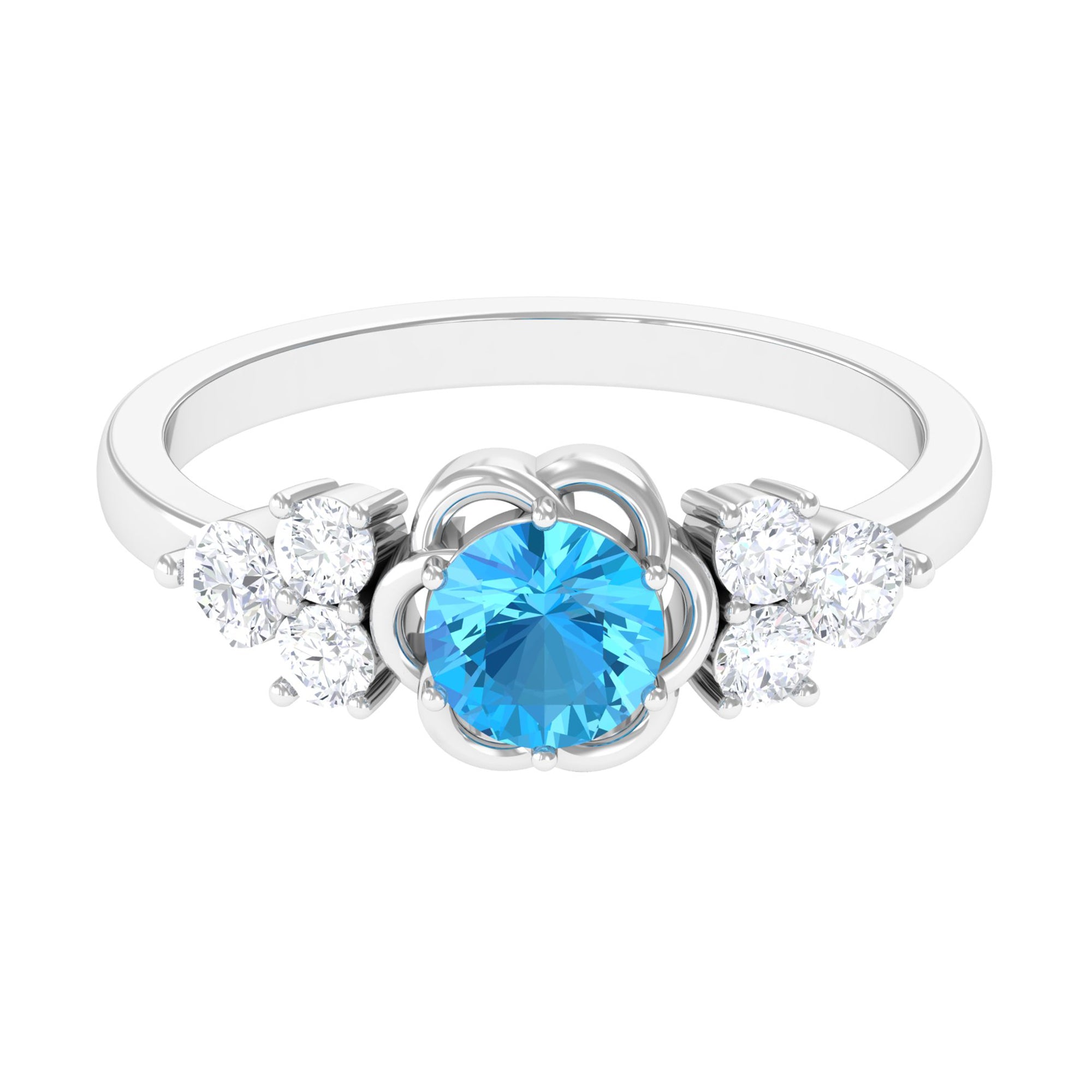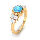 Round Shape Swiss Blue Topaz Floral Engagement Ring with Diamond Trio