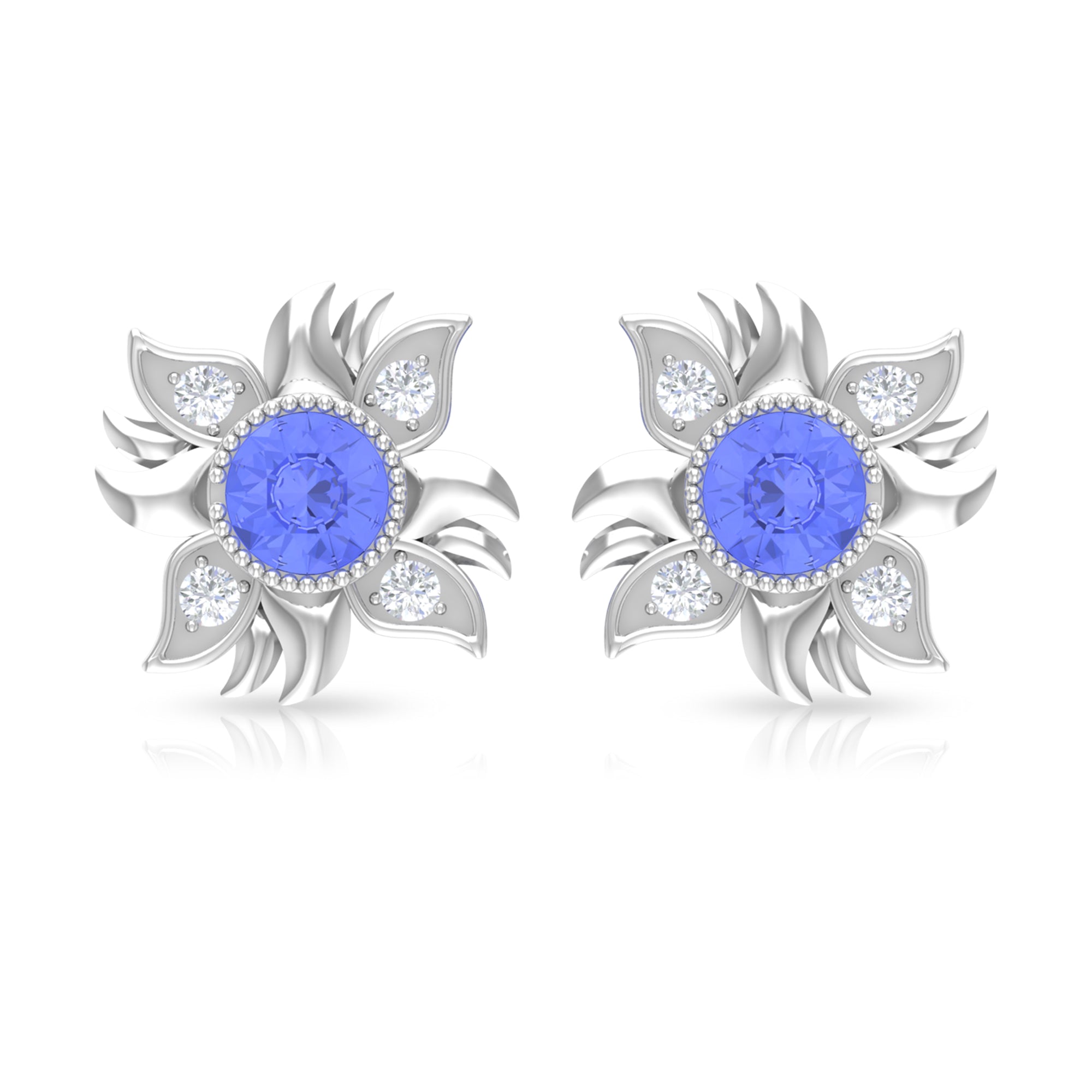 Round Shape Tanzanite and Diamond Sunburst Stud Earrings
