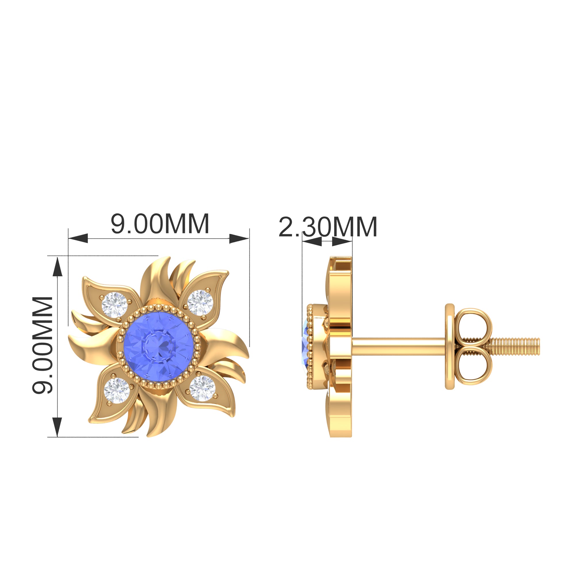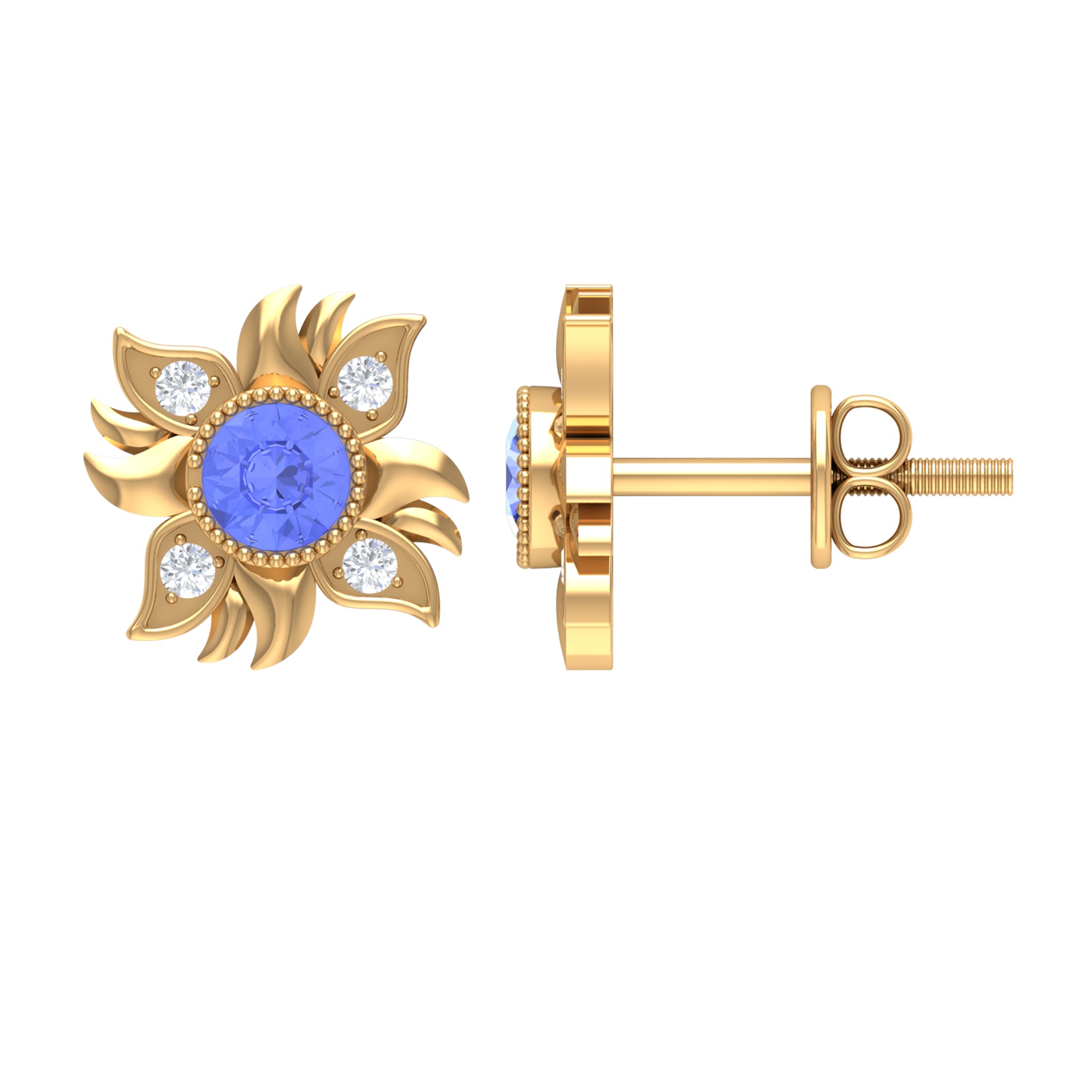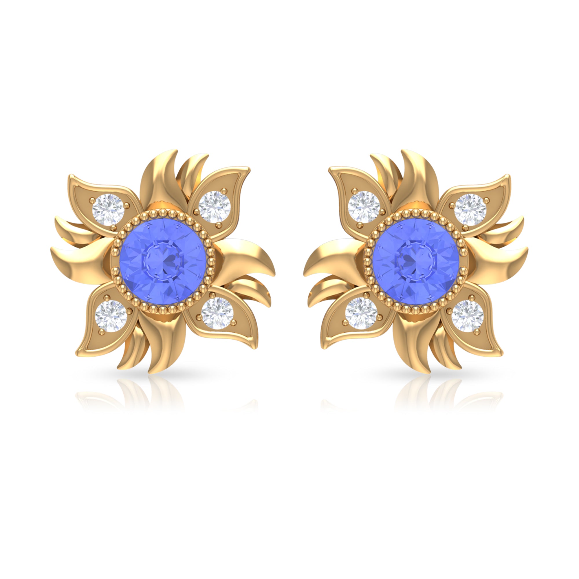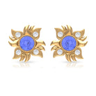 This Sunburst Stud Earrings is embellished with Round Shape Tanzanite is set at the center in a Bezel Setting and round shape Diamond are set as floral pattern.