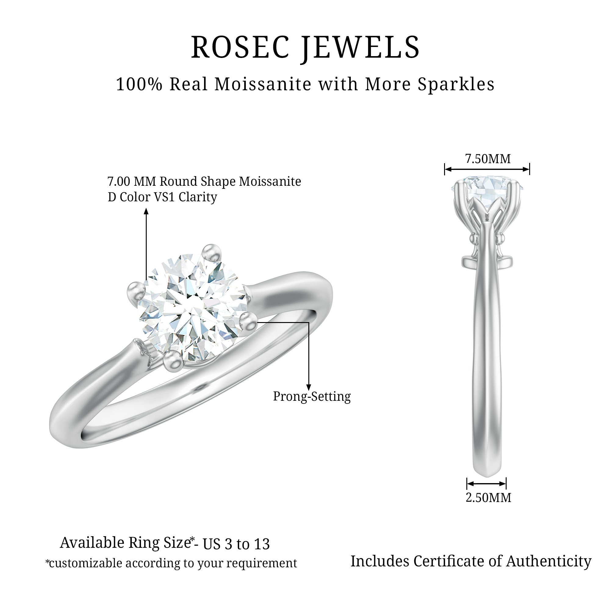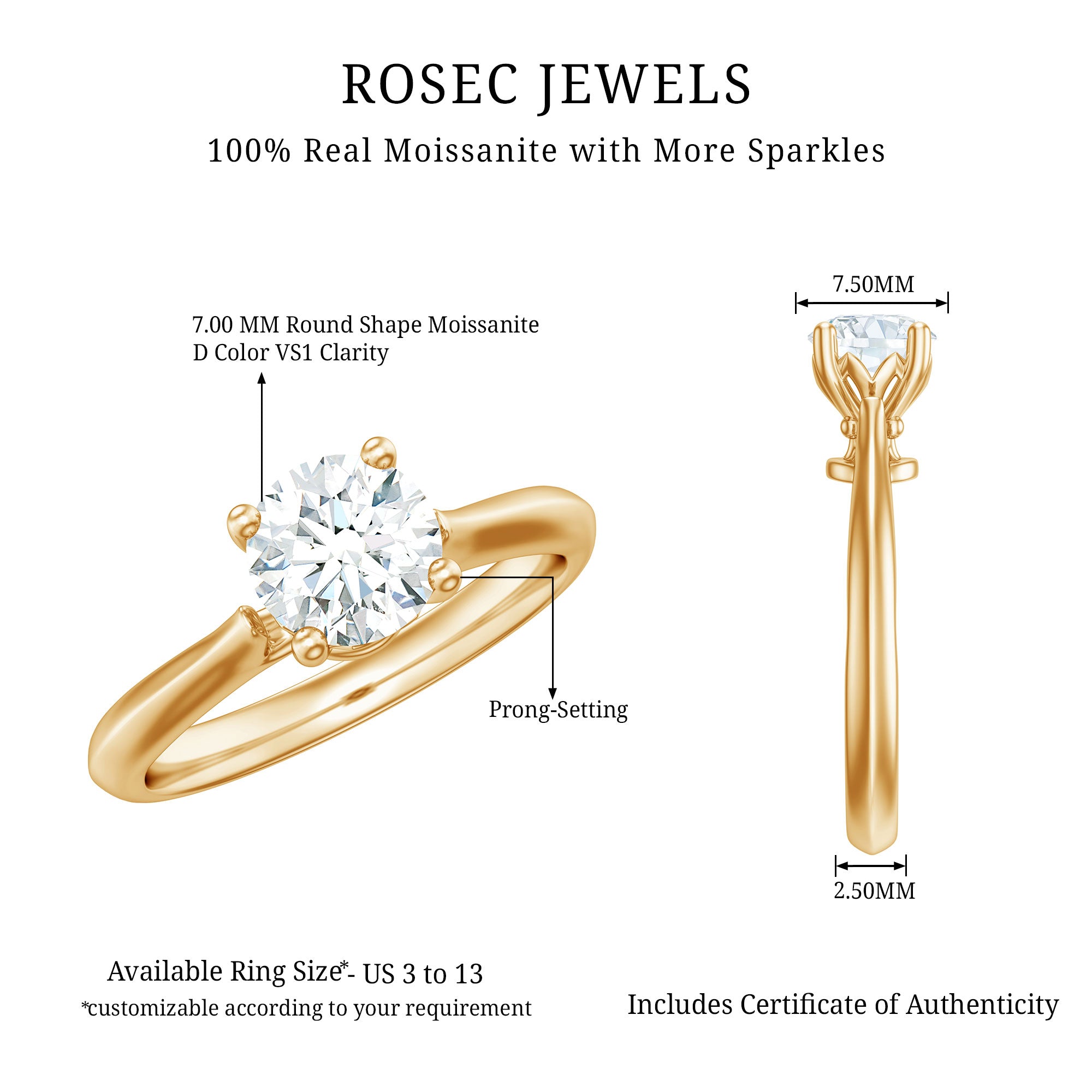 Simple yet eye-catching, this Moissanite Solitaire Engagement Ring is made to make your special moments even more memorable. Designed with a classic yet refined feel, it features a 7 MM round cut Moissanite held securely in prong setting. With its D color and VS1 clarity, the center stone shines with impressive brilliance and fire, creating a radiant look that never goes unnoticed. This Round Engagement Ring takes elegance a step further with its unique designer gallery. Look closely and you will notice delicate artistic detailing beneath the stone that adds character and charm from every angle. The sleek and polished metal band gives it a modern and clean finish, allowing the Moissanite to be the true star of the piece. Whether you are proposing, celebrating an anniversary, or marking a meaningful milestone, this 1 Carat Moissanite Ring is a perfect choice. It is timeless enough to be worn every day and special enough to symbolize your once-in-a-lifetime love story. The comfortable band design ensures it is easy to wear, while the designer touch makes it stand out from traditional solitaire rings. Every detail of this ring reflects quality and thoughtfulness. It comes with a gemstone certificate verifying the authenticity and quality of the Moissanite. Packaged in a premium jewelry box, this Solitaire Moissanite Ring is all set for gifting, whether to a loved one or as a treat for yourself.
