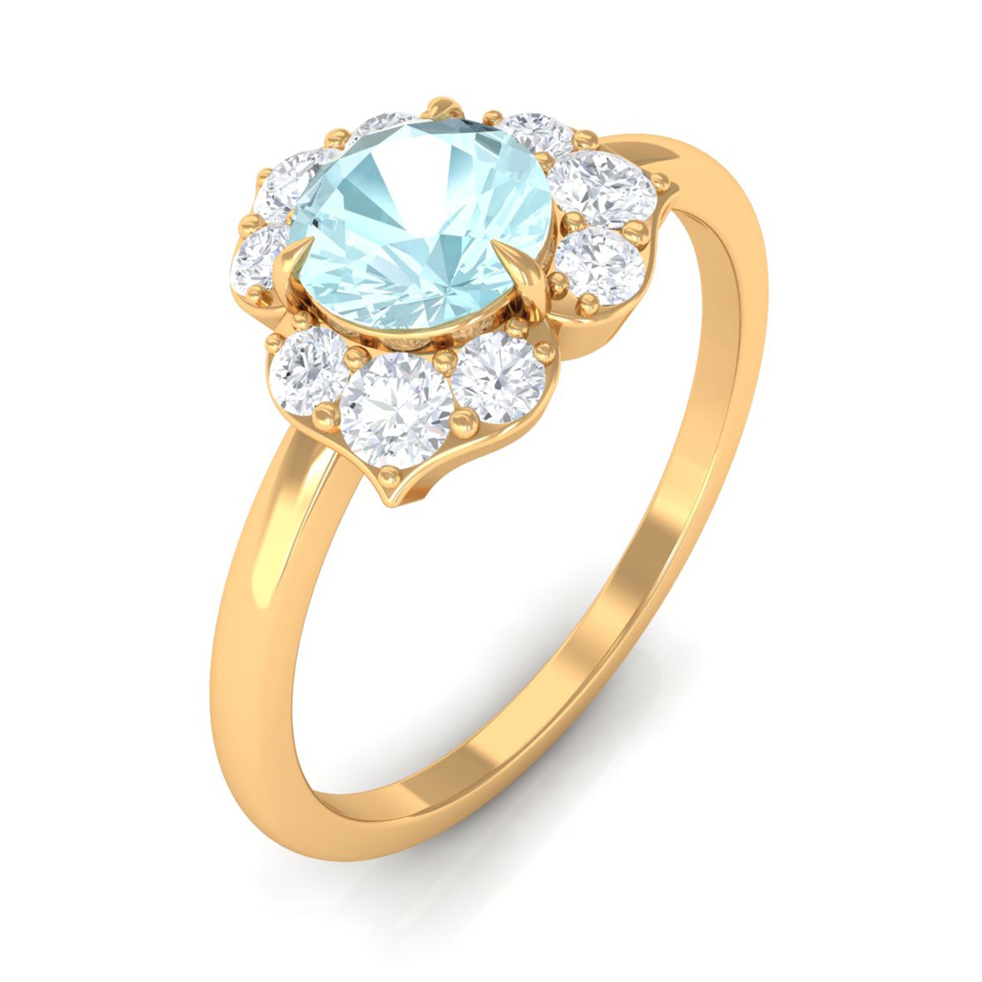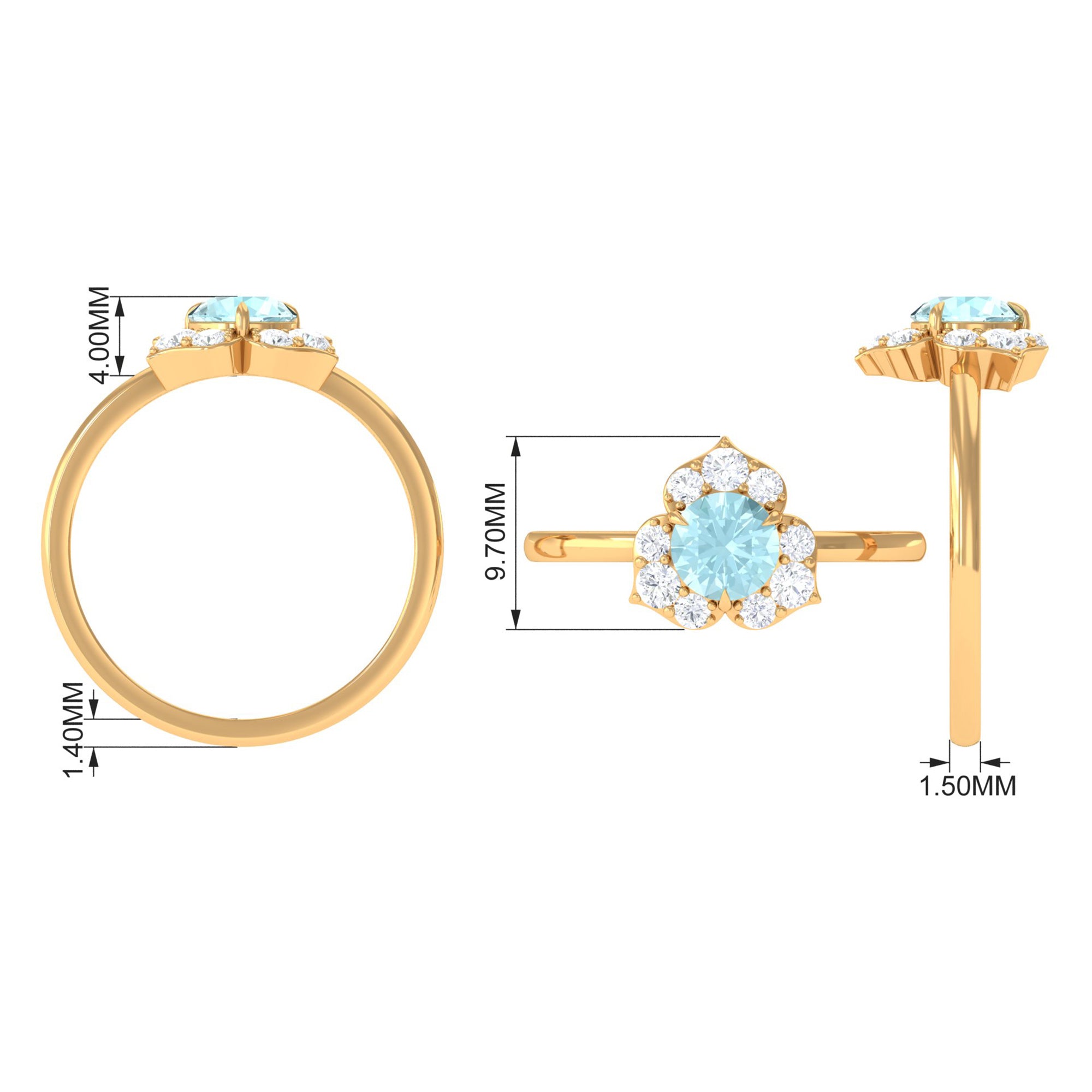 Indulge in the enchanting beauty of our Round Sky Blue Topaz Flower Ring with Diamond Accent. The centerpiece, a brilliant round Sky Blue Topaz, captures the essence of a clear, blue sky. Surrounding it, delicate petals formed by Diamond stones add a touch of floral grace and eternal sparkle. Meticulously designed, this ring combines the serenity of the Sky Blue Topaz with the brilliance of Diamond, creating a harmonious and captivating composition. The floral motif symbolizes growth and the enduring beauty of your love. Let this exquisite ring be a radiant expression of your unique bond, where the natural allure of the Sky Blue Topaz meets the timeless sparkle of Diamond in a beautiful floral arrangement.