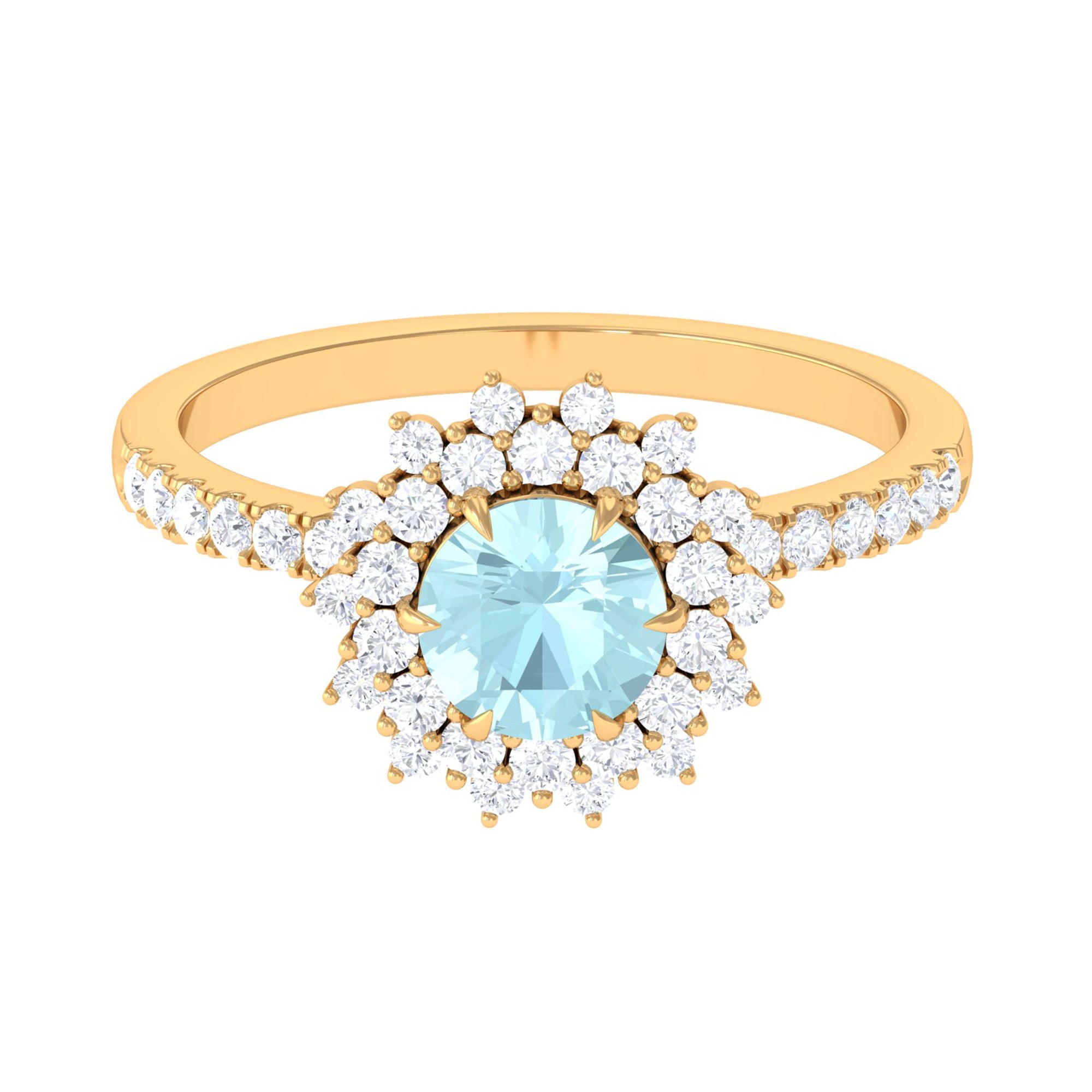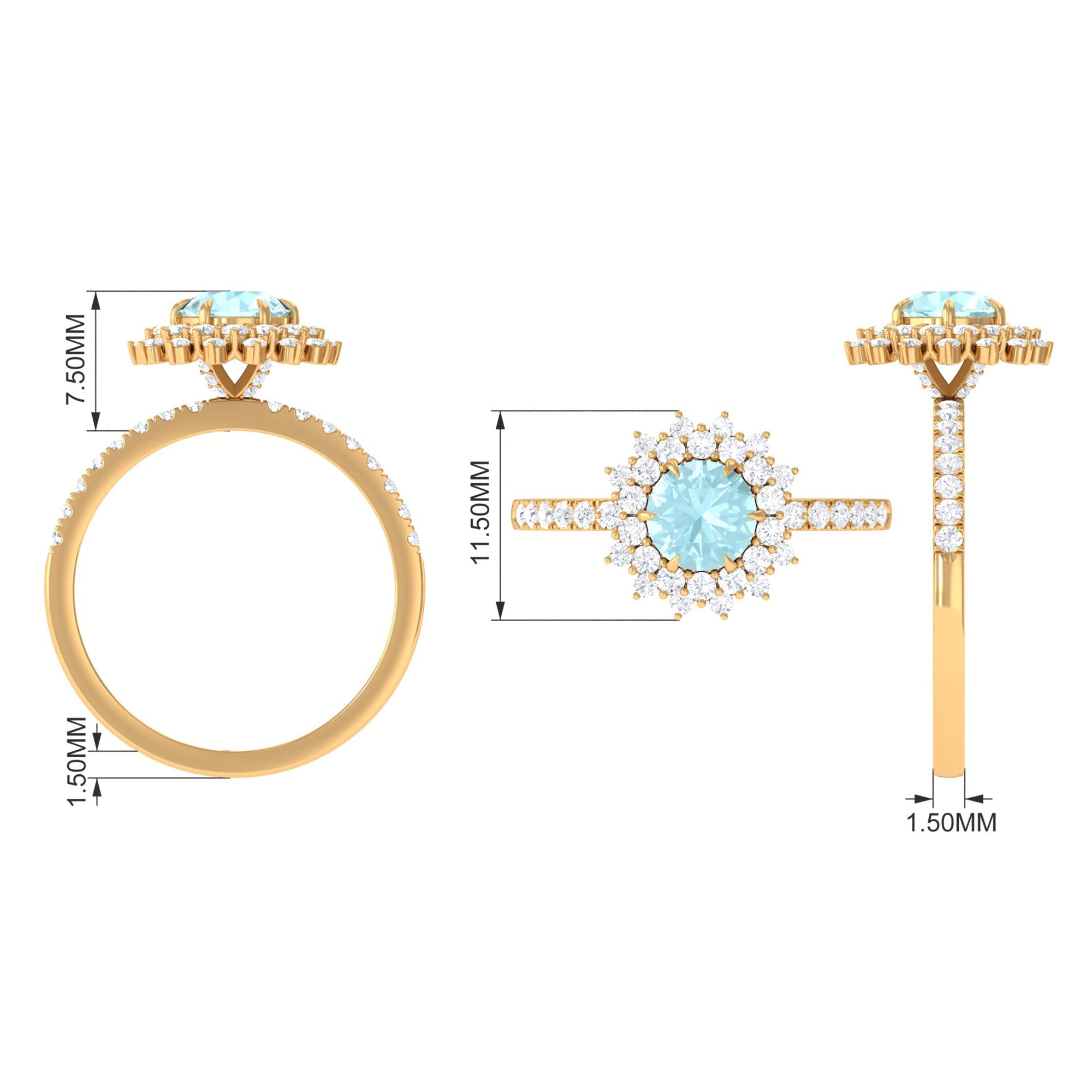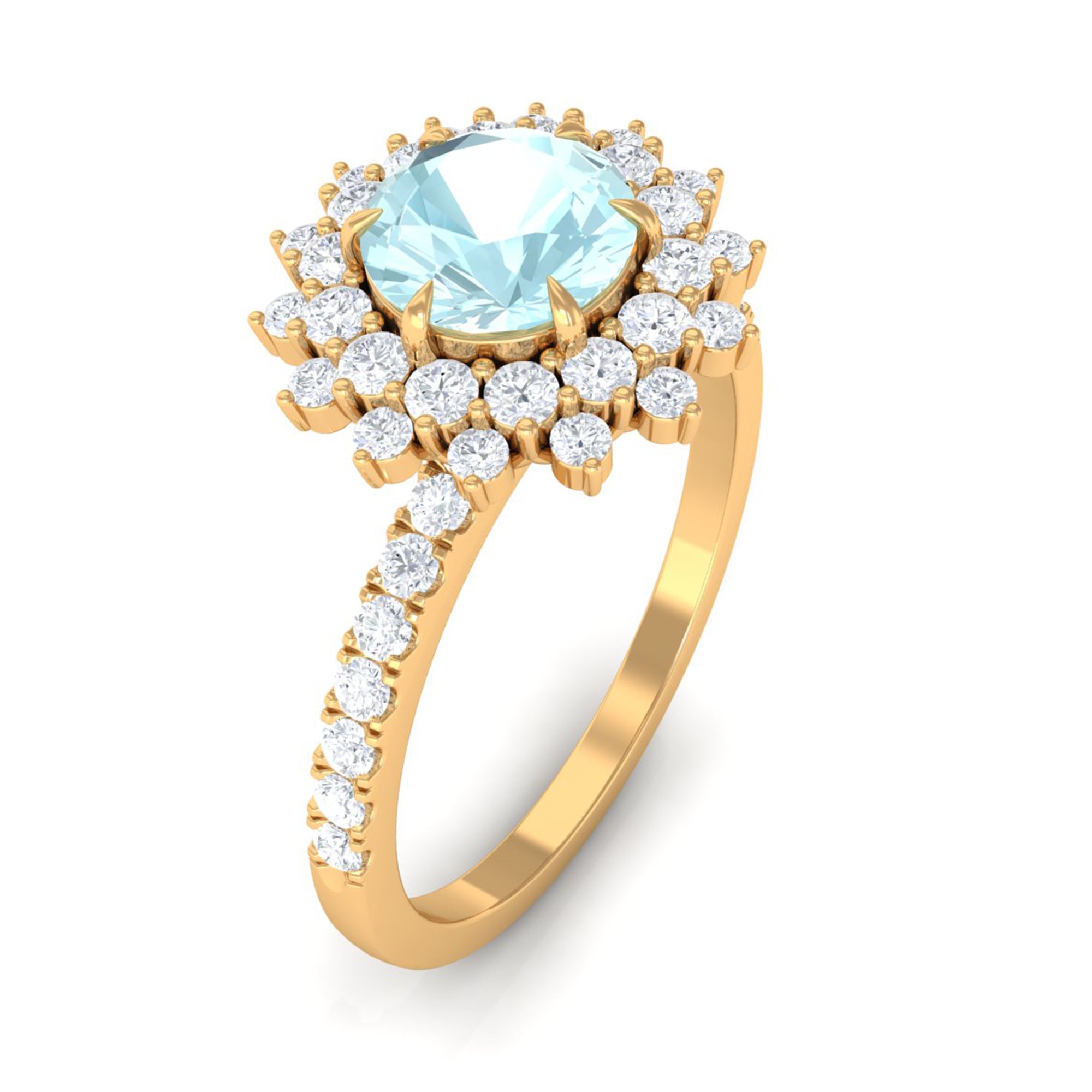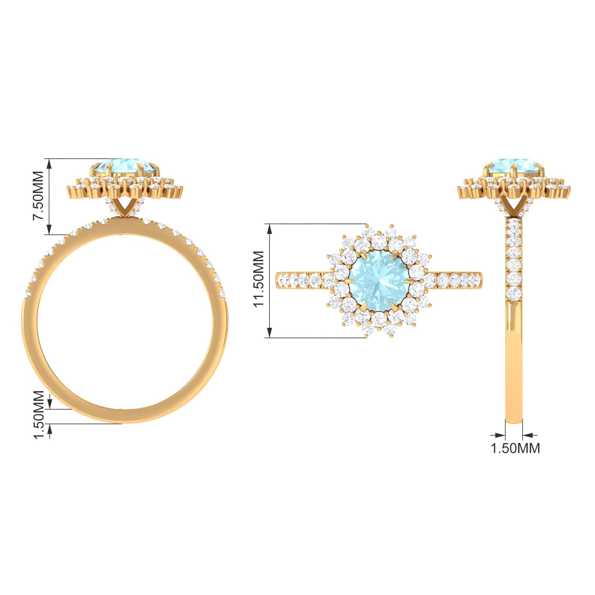 Cluster Halo of Moissanite forming an alluring Halo around Round Sky Blue Topaz which is held in 6 Claw Prong. This Sky Blue Topaz Statement Engagement Ring is crafted in Gold for sumptuous appeal. This Sky Blue Topaz Ring gives a royal appearance, through its intricate design. Get this Sky Blue Topaz Engagement Ring for your lady and elate her with your choice.