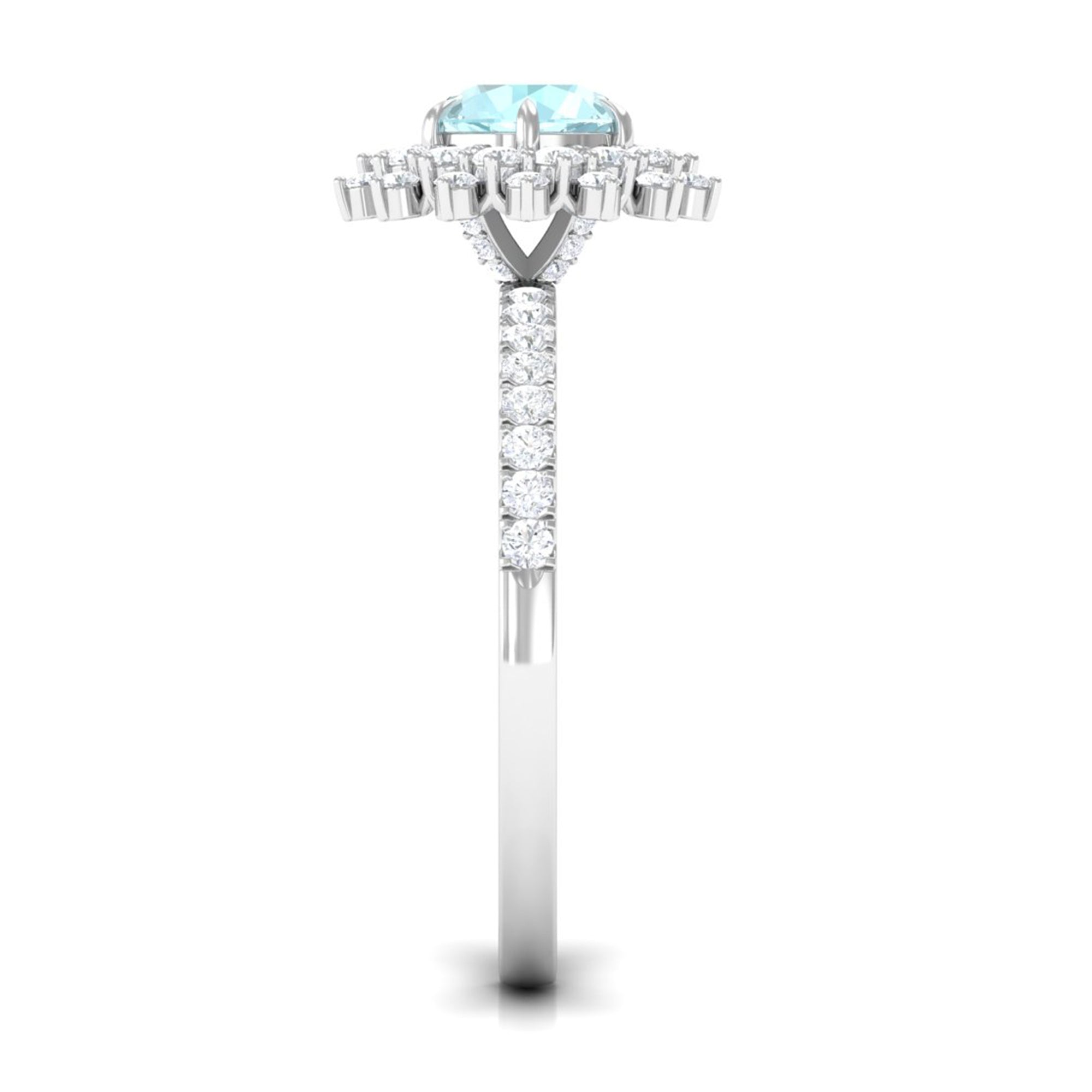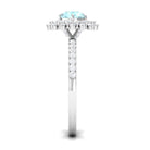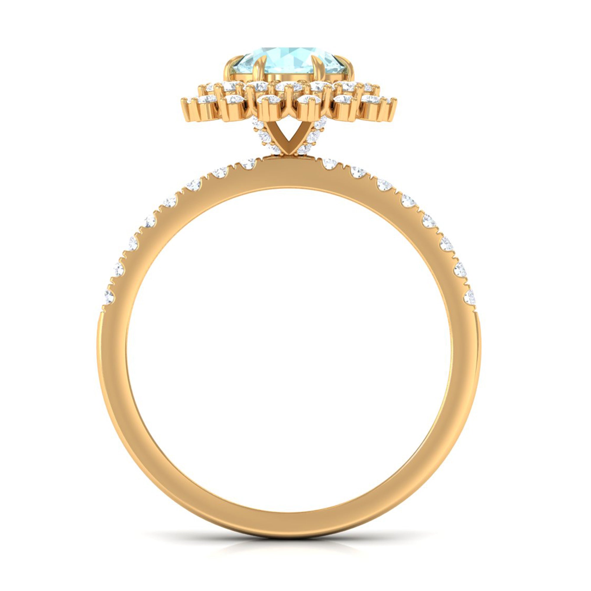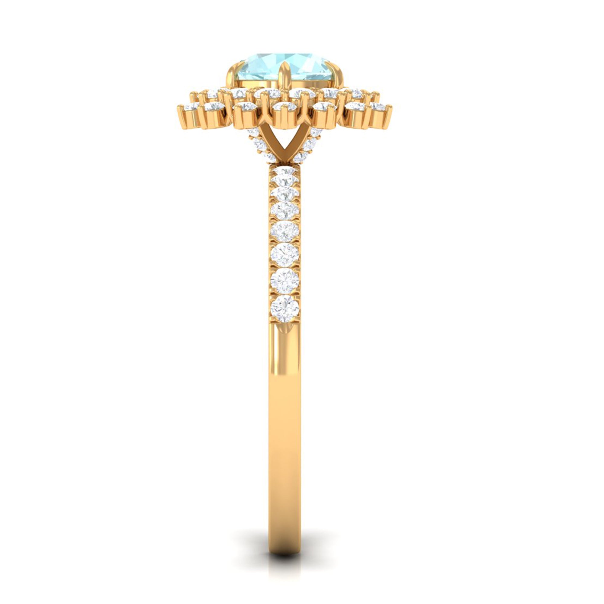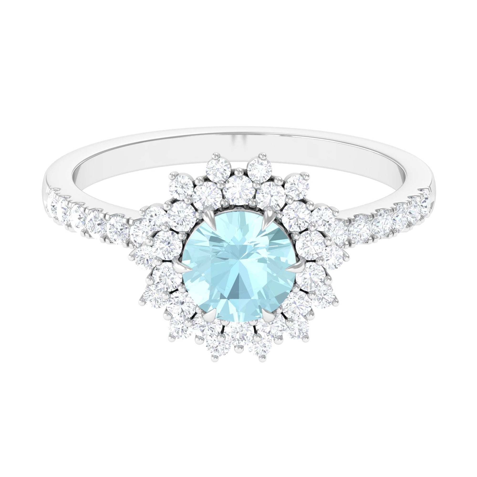 Cluster Halo of Moissanite forming an alluring Halo around Round Sky Blue Topaz which is held in 6 Claw Prong. This Sky Blue Topaz Statement Engagement Ring is crafted in Gold for sumptuous appeal. This Sky Blue Topaz Ring gives a royal appearance, through its intricate design. Get this Sky Blue Topaz Engagement Ring for your lady and elate her with your choice.