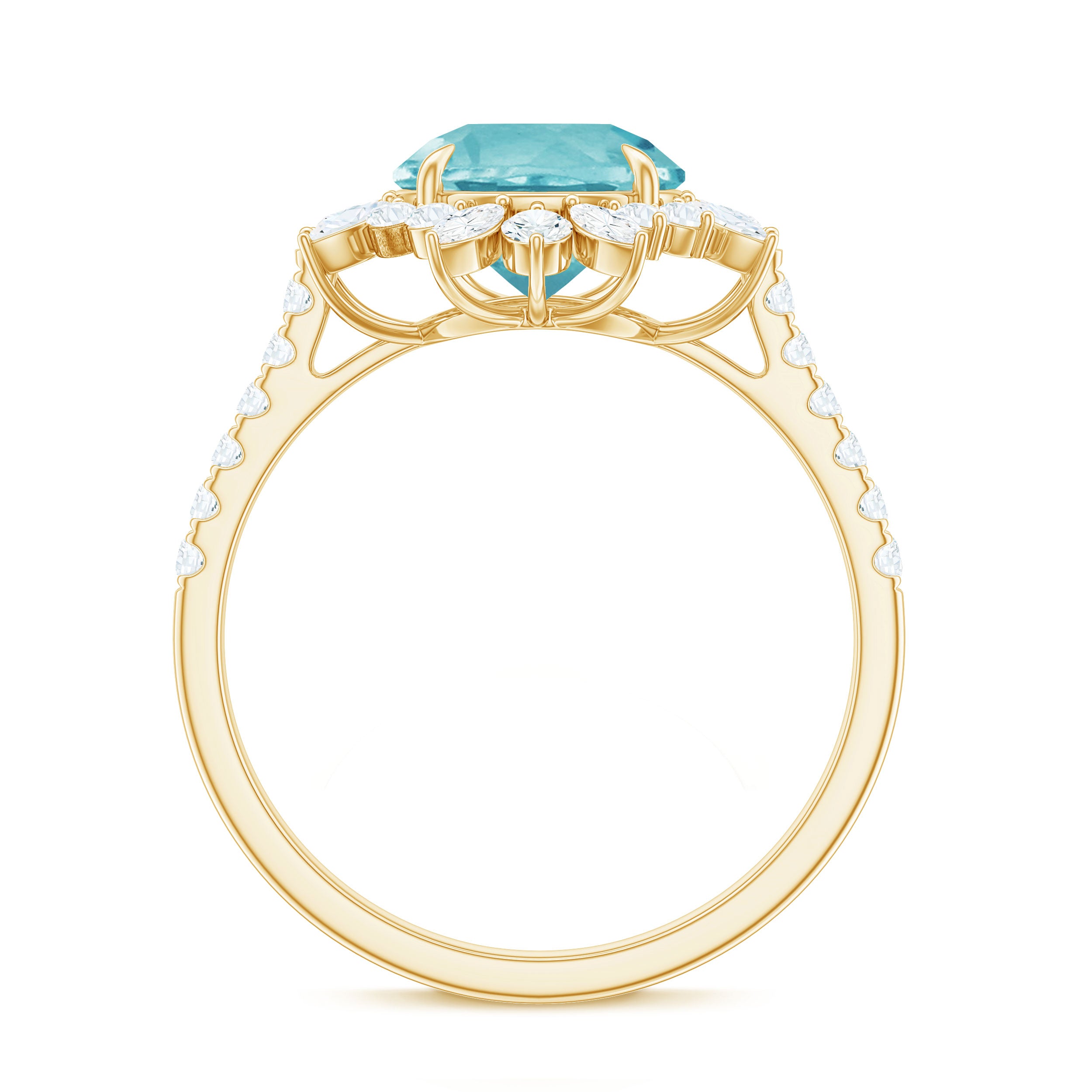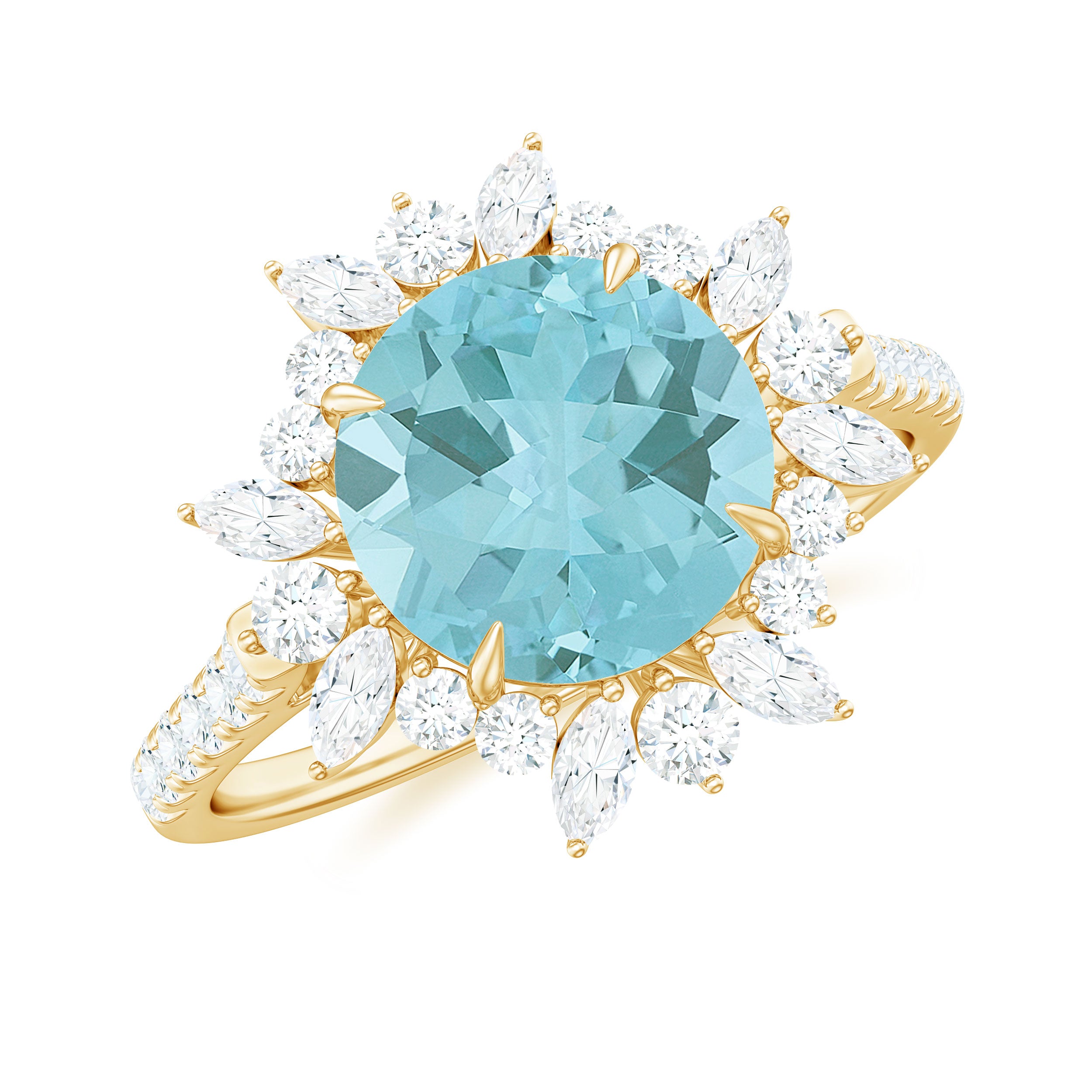 Make a bold fashion statement with this stunning Sky Blue Topaz Cocktail Ring, adorned with a shimmering Round Shape Sky Blue Topaz, as well as Marquise and Round Shape Moissanite stones in a Claw Setting. The intricate Floral design of this Engagement Ring exudes elegance and sophistication, and it is expertly crafted from Solid Gold. This one-of-a-kind piece is the perfect addition to any jewelry collection and is sure to complement any style.