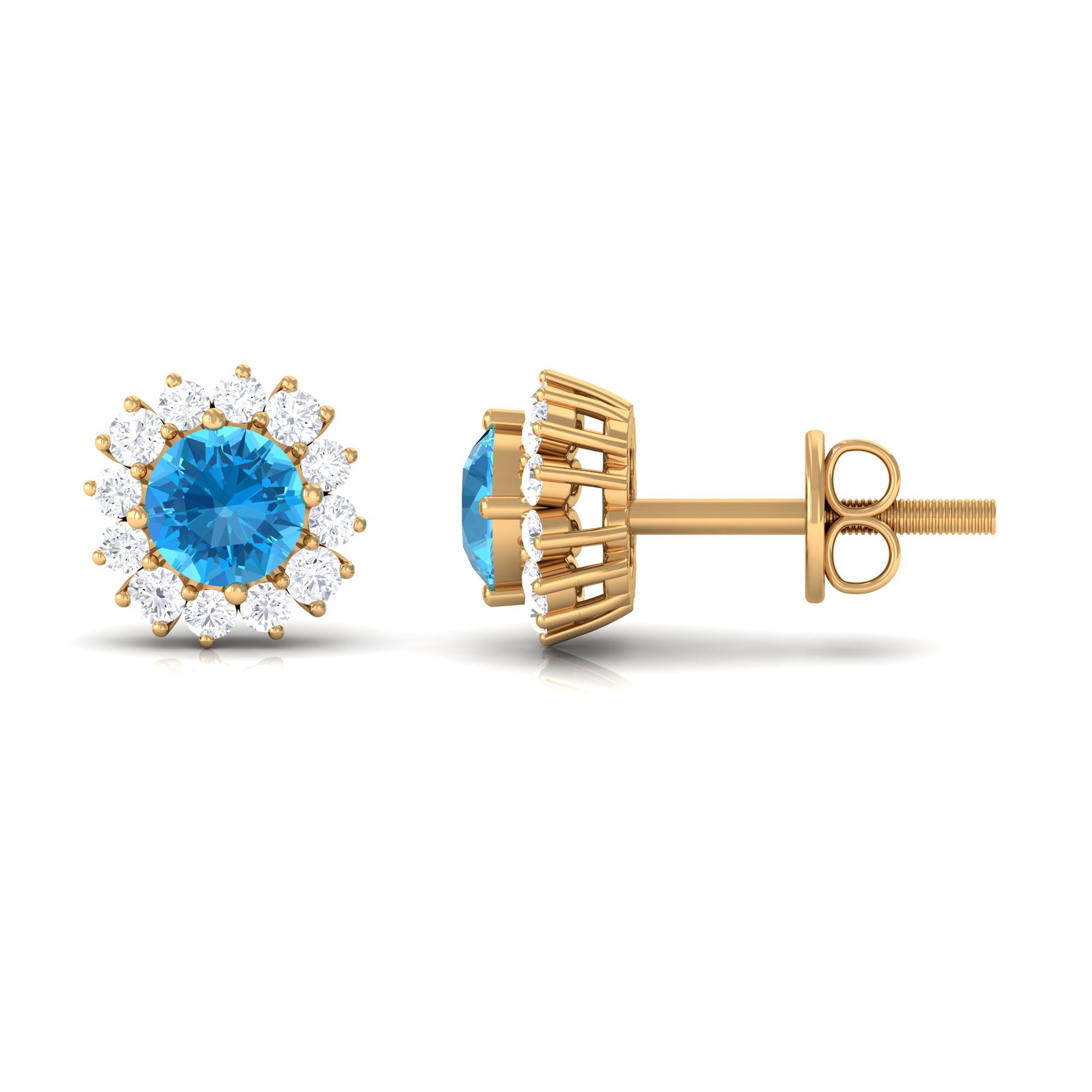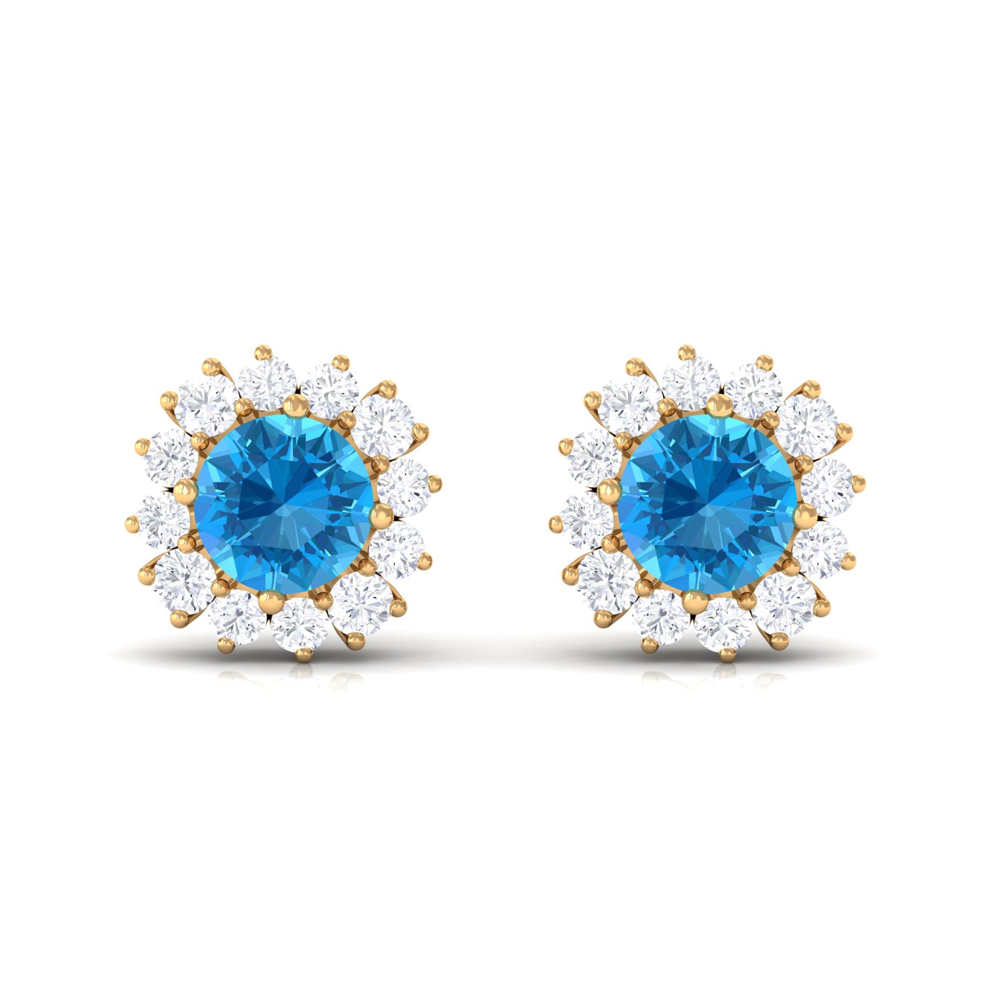 Introducing the Classic Stud Earrings with Round Shape Swiss Blue Topaz, specially crafted for women who appreciate timeless elegance. These exquisite earrings feature a Round Shape Swiss Blue Topaz gemstone, delicately placed in a prong setting, radiating its natural beauty. Additionally, they are adorned with a halo of round-cut Diamond stones, carefully set in a prong setting, adding a brilliant sparkle to the overall design. This captivating combination of Swiss Blue Topaz and Diamond creates a stunning piece of jewelry that embodies sophistication and grace.