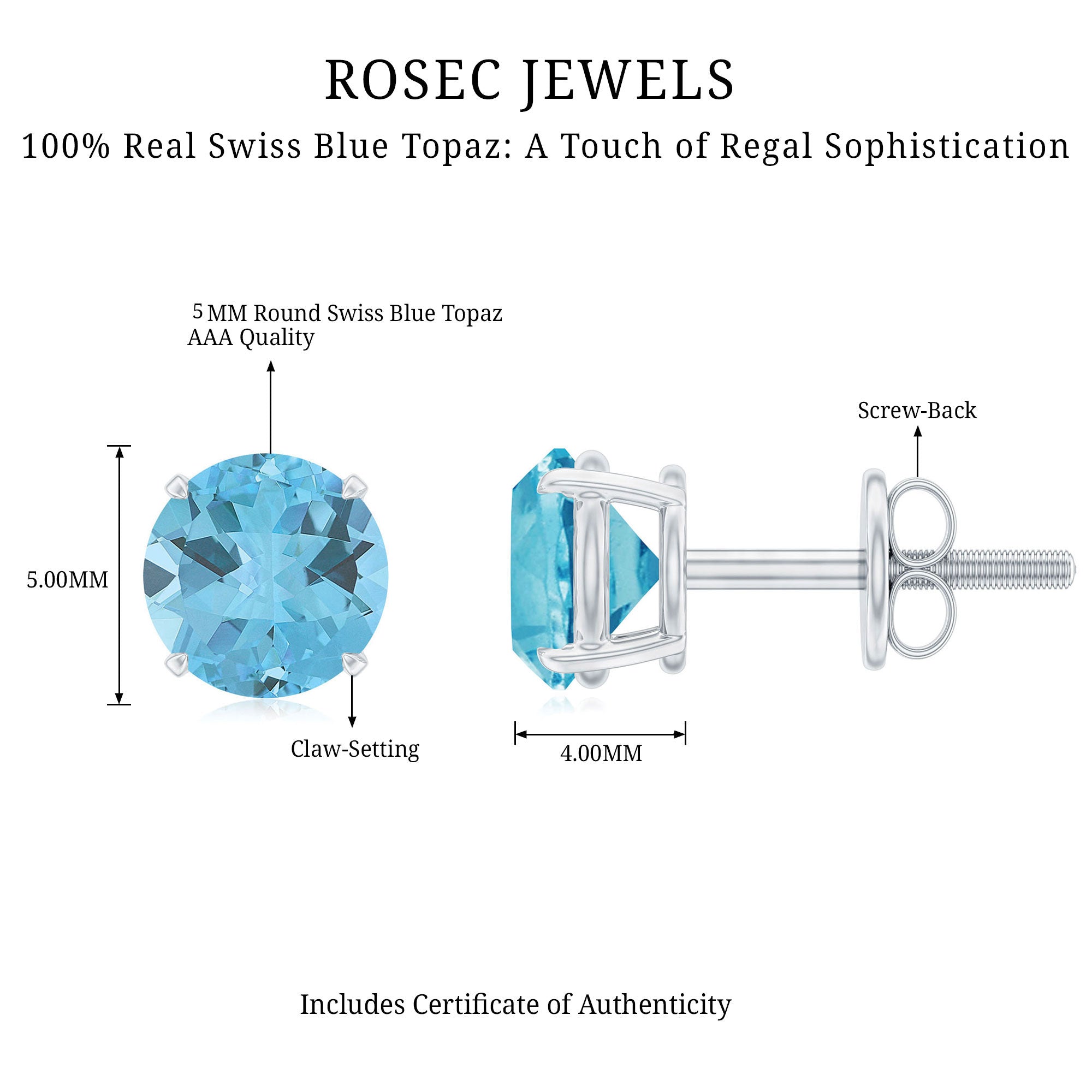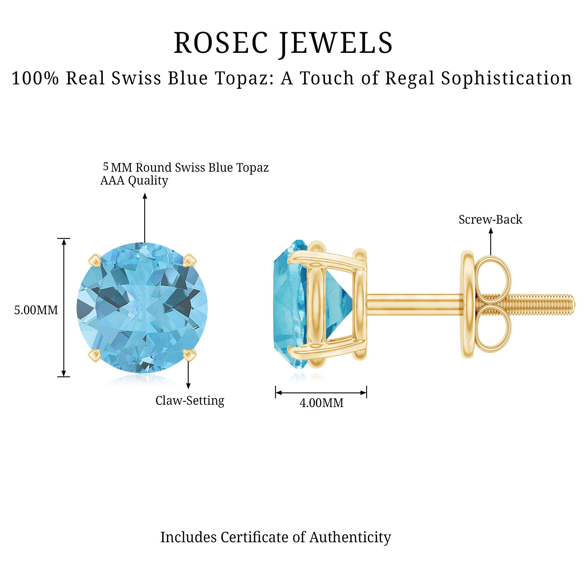 Round Swiss Blue Topaz Solitaire Stud Earrings in Claw Setting