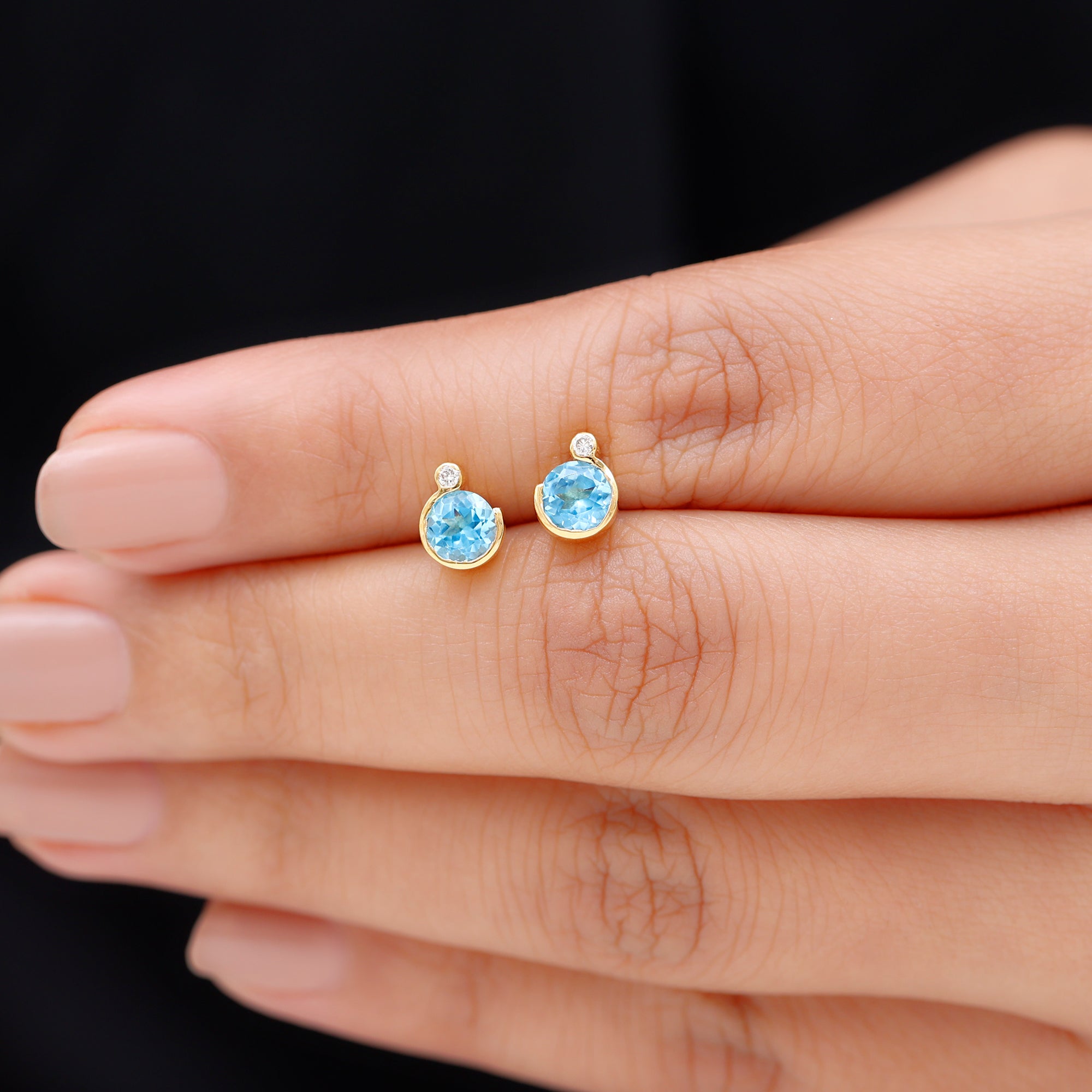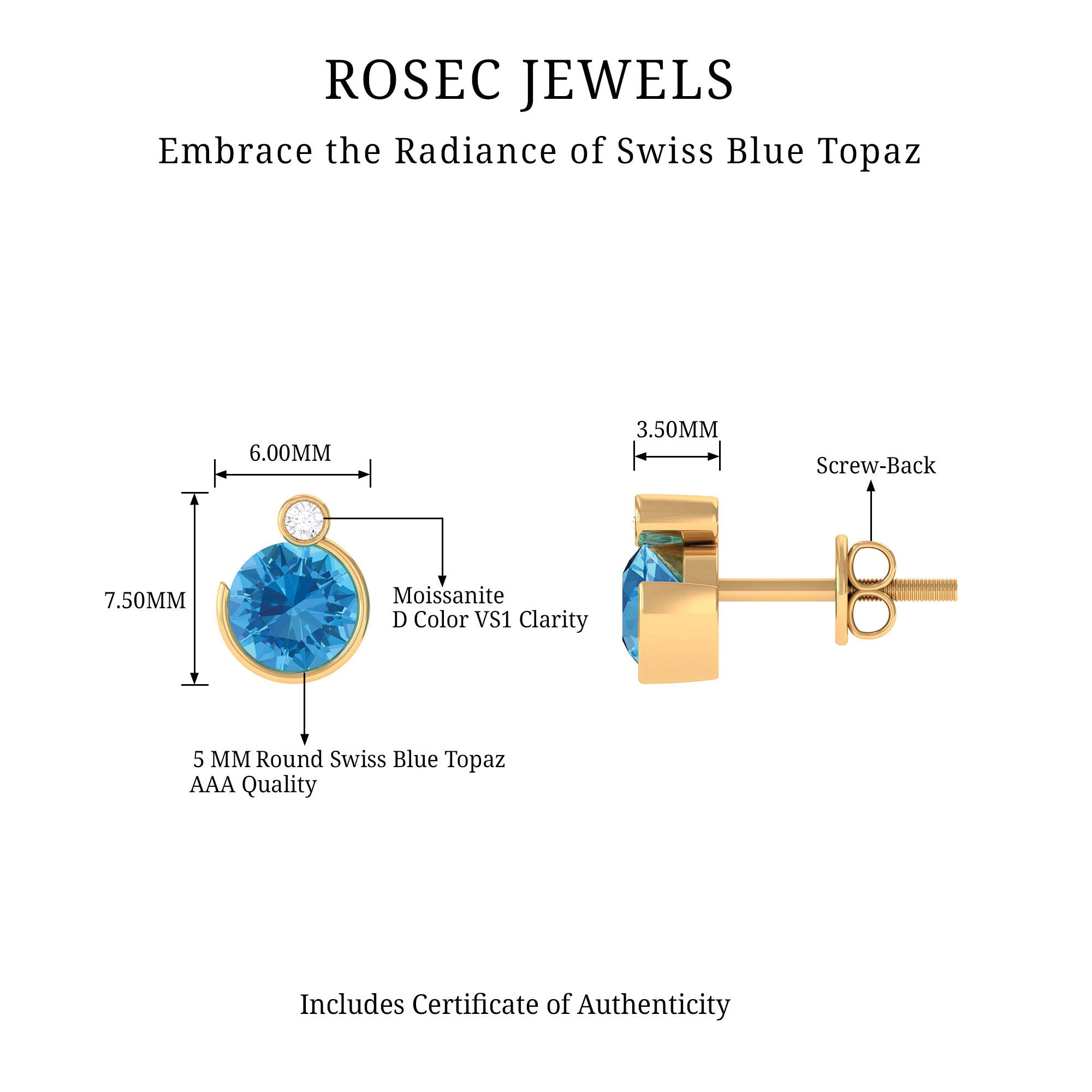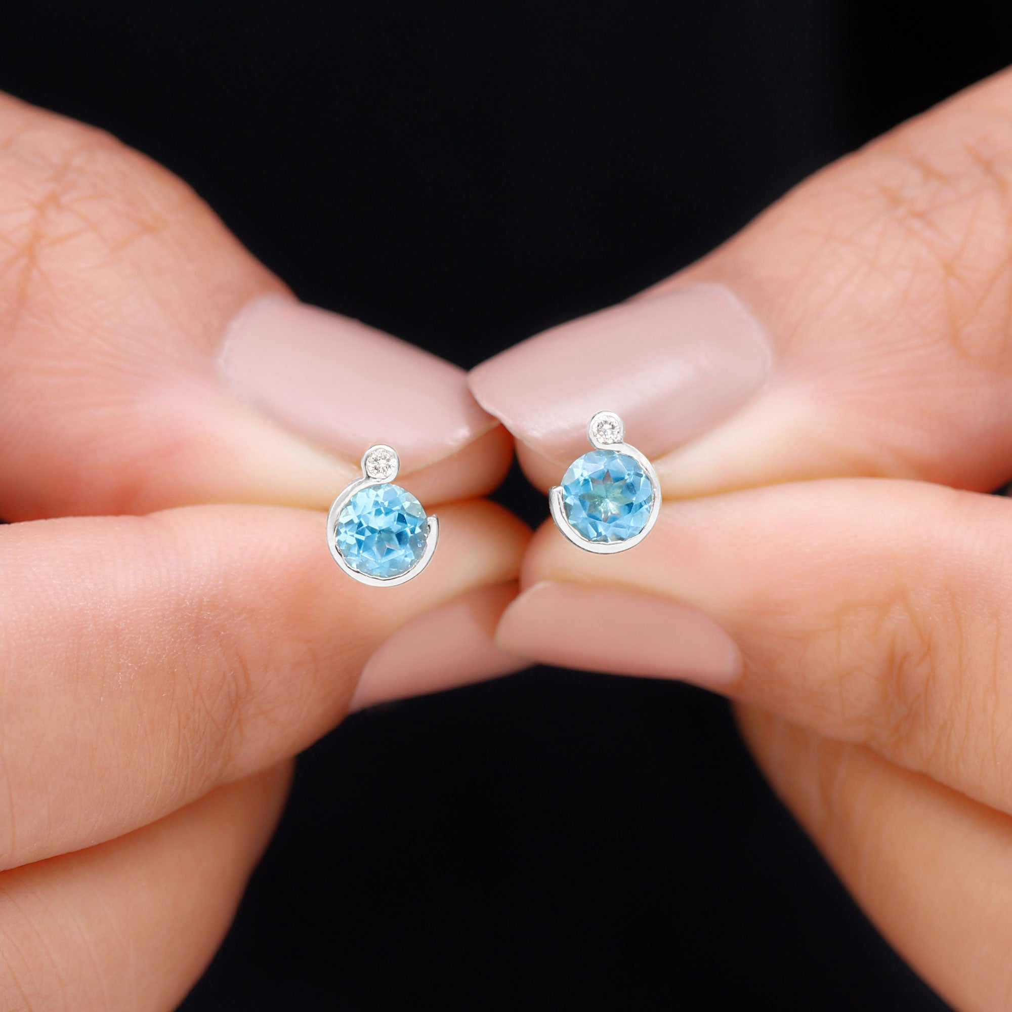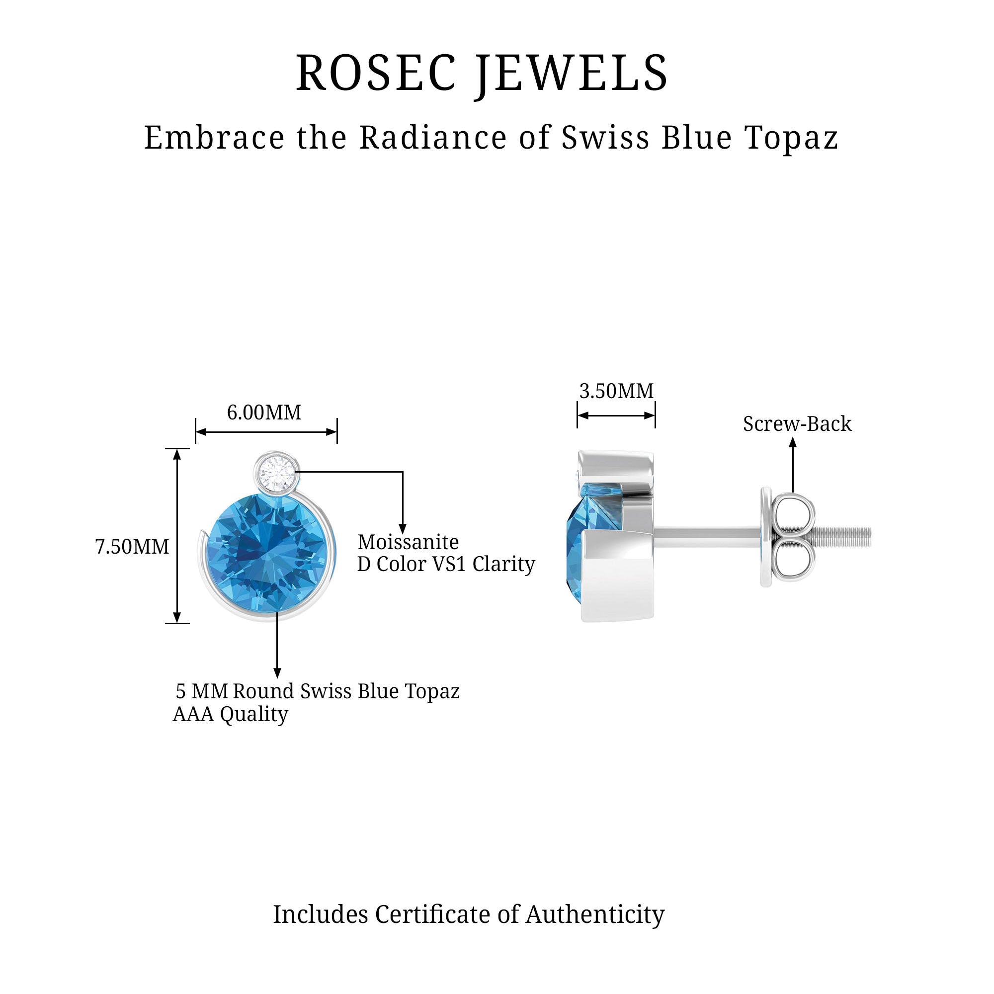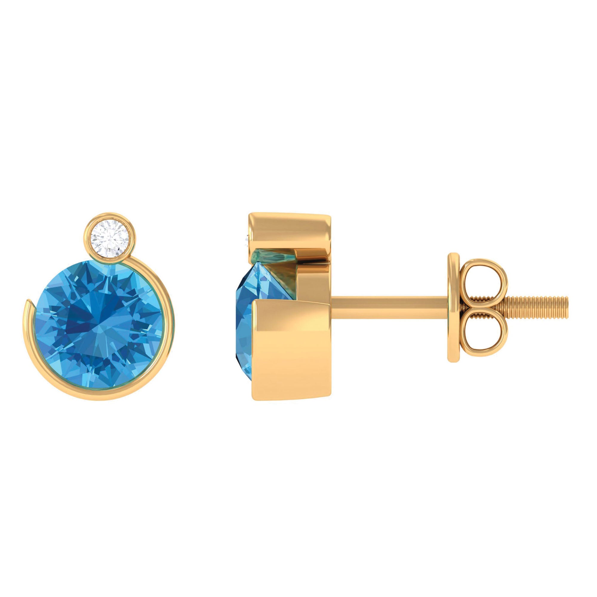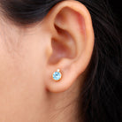 The simple yet stunning Swiss Blue Topaz Stud Earrings are embellished with Round Shape Swiss Blue Topaz and a dainty Round Moissanite secured in Bezel Setting. These Blue Topaz Earrings are crafted with Hallmarked Metal and come with a Screw Back Closure that will keep them secured in place. Present these Blue Topaz Earrings to your special person as it makes a wonderful Birthday Gift for her.