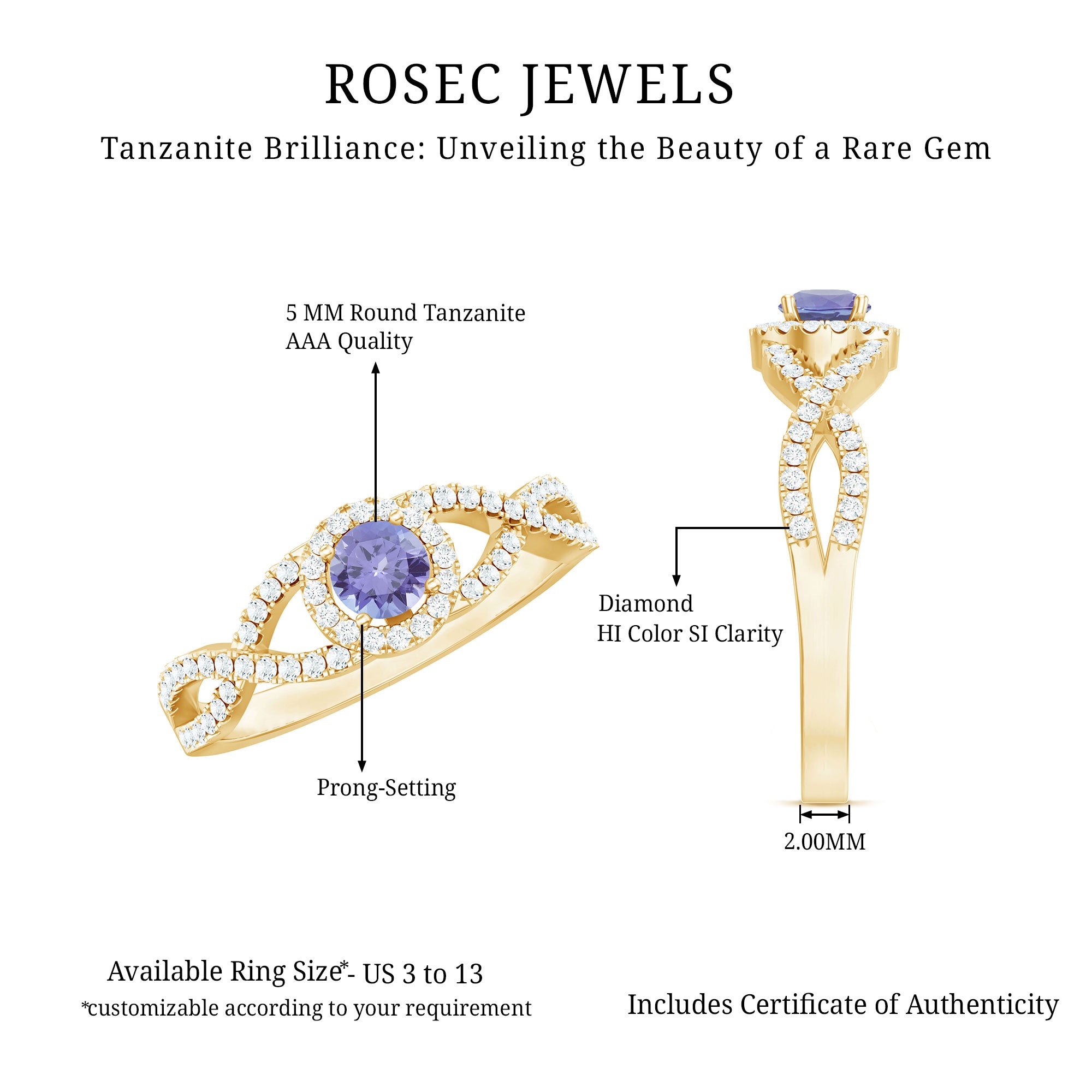 This exquisite engagement ring showcases a beautiful round Tanzanite securely set in a classic prong setting. The shank features a crisscross design adorned with Diamond stones, creating a luxurious and captivating effect. The Tanzanite engagement ring is skillfully crafted from high-quality solid gold, adding to its enchanting beauty.
