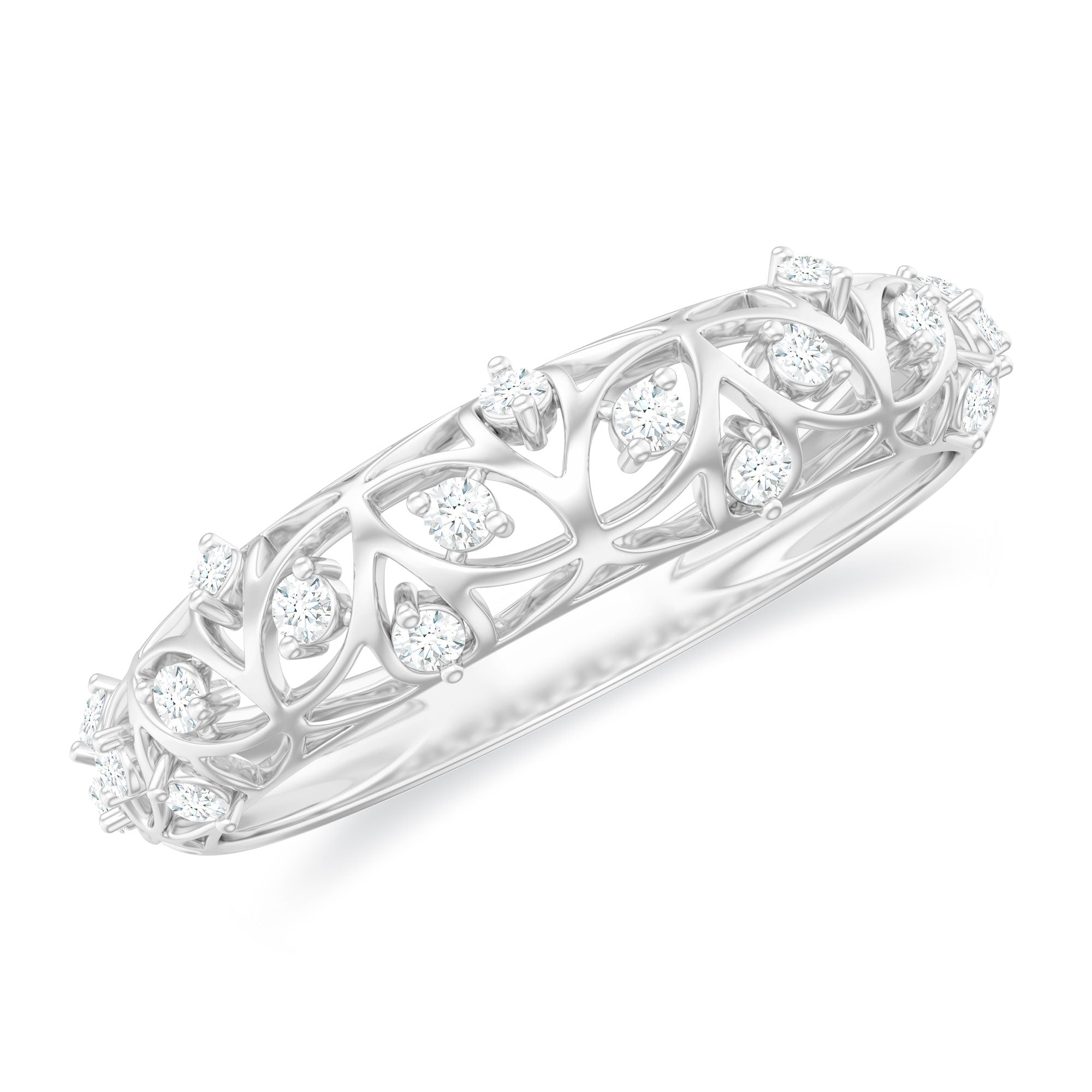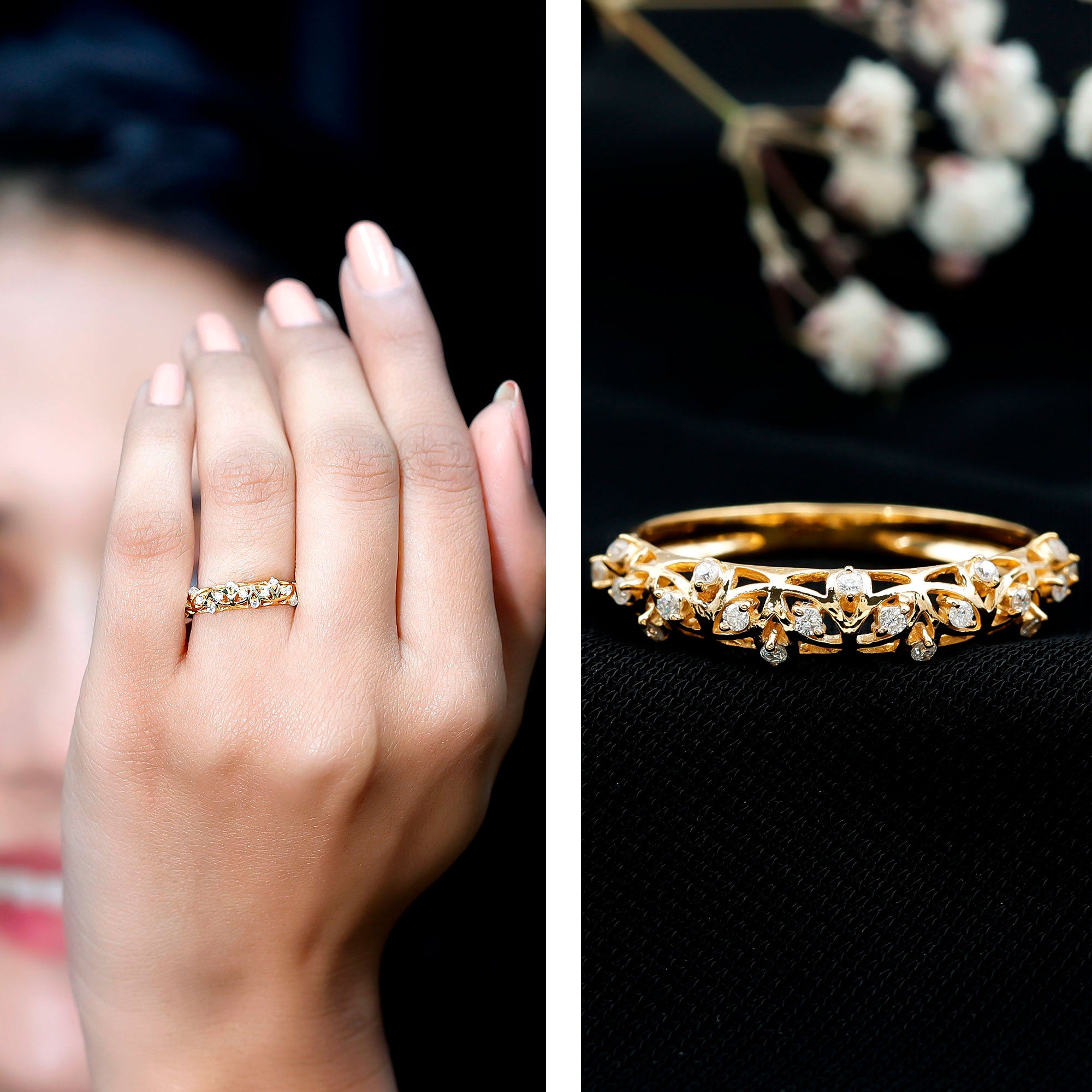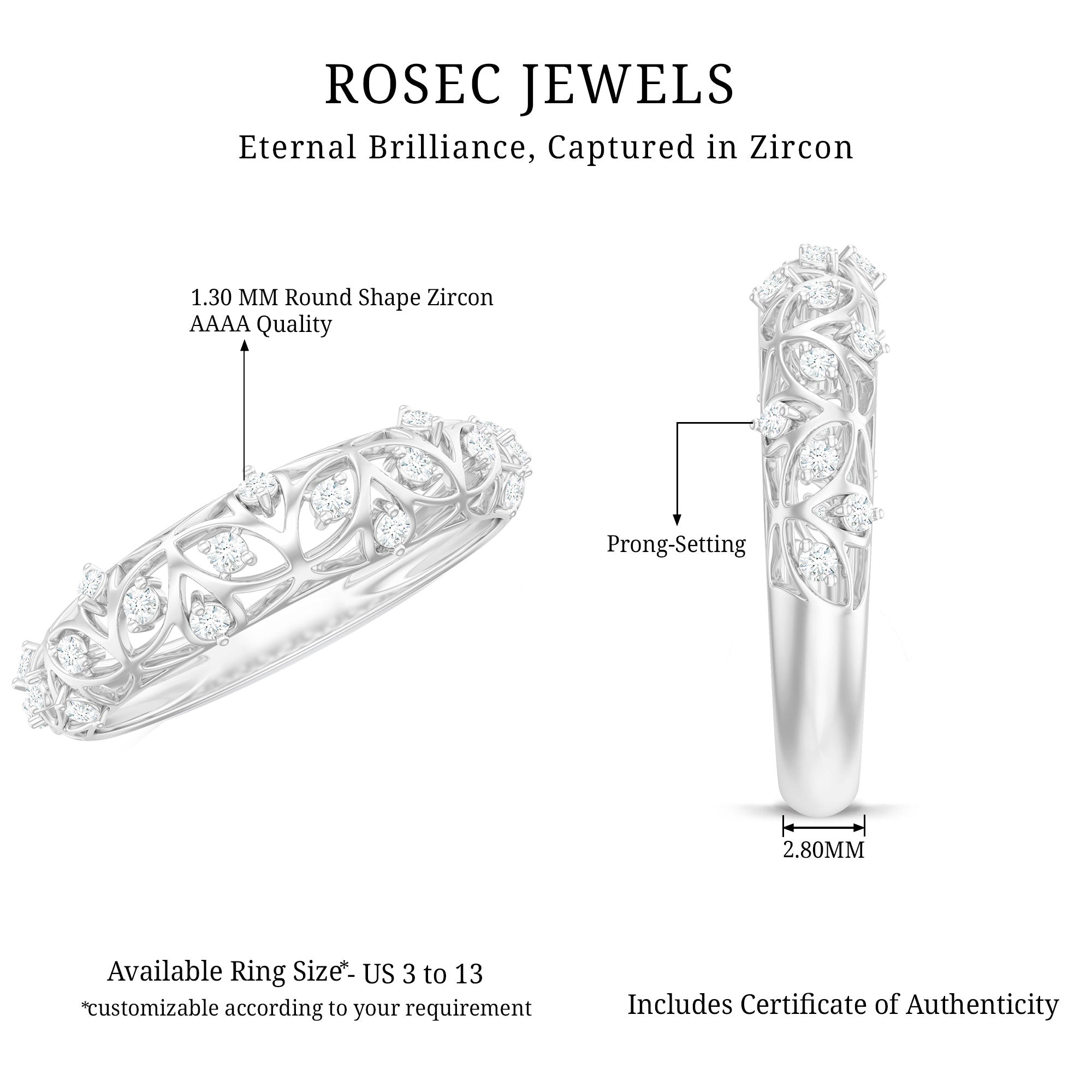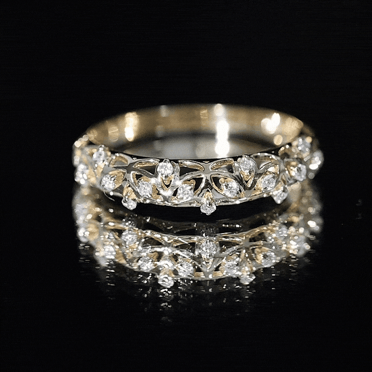 Round Zircon Semi Eternity Band Ring with Gold Filigree Details